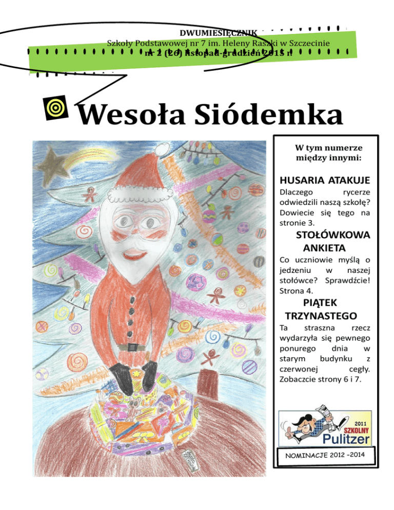 DWUMIESIĘCZNIK Szkoły Podstawowej nr 7 im. Heleny Raszki w Szczecinie nr 2 (26) listopad-grudzień 2015 r. Wesoła Siódemka W tym numerze między innymi: HUSARIA ATAKUJE Dlaczego rycerze odwiedzili naszą szkołę? Dowiecie się tego na stronie 3. STOŁÓWKOWA ANKIETA Co uczniowie myślą o jedzeniu w naszej stołówce? Sprawdźcie! Strona 4. PIĄTEK TRZYNASTEGO Ta straszna rzecz wydarzyła się pewnego ponurego dnia w starym budynku z czerwonej cegły. Zobaczcie strony 6 i 7. NOMINACJE 2012 –2014 NIETAJNE, AKTUALNE Od redakcji Wstępniak Drogie Czytelniczki! Drodzy Czytelnicy! Ciepło witamy Was w nowym numerze „Wesołej Siódemki”. Za oknem jest już zimno, minął 20 grudnia, a to może oznaczać tylko jedno – zbliżają się Święta! A to znaczy wolne, prezenty, spotkanie z rodziną i (oczywiście) ciasta. Na pewno każdy z Was nie może się tego doczekać. Jeśli chcecie dowiedzieć się, jak zrobić pyszne świąteczne ciasto i ciastka, sprawdźcie przepisy na stronach 14 i 15. Ale w tym numerze nie pisaliśmy tylko o Bożym Narodzeniu. Możecie także przeczytać na stronie 6 i 7 relację z pewnej wycieczki do Archiwum Państwowego w Szczecinie, wydarzyło się tam coś… lepiej po prostu sami zajrzyjcie. Niestety, na razie śnieg nie padał jeszcze u nas, ale i tak warto dowiedzieć się, jakie są naprawdę ciekawe zabawy na śniegu. Zobaczcie koniecznie stronę 8. Czas już powoli kończyć. Żebyście dalej utrzymali się w świątecznym nastroju, przeczytajcie wiersz, który znajdziecie tu na dole. Więc żegnamy i życzymy Wam wszystkim Wesołych Świąt i Szczęśliwego Nowego Roku. Redaktor naczelny, Paweł Naglacki VI b Świąteczne wierszyki Rymowanki *** Na kiermaszu 1 E wszyscy mocno kręcą się, aby w końcu kupić tam mnóstwo rzeczy, powiem wam. Tam babeczki i pierniki, również inne smakołyki. Można kupić też aniołki i choinki- niby bombki. Tutaj kupisz coś dla mamy, jakiś prezent niesłychany. Ja to kupię prezent nowy, piękny, ładny, kolorowy. Tutaj znajdę coś pięknego, własnoręcznie robionego i to jeszcze dla każdego. Aleksandra Kubel V b *** Gdy pierwszy śnieżek prószy, Wszystkim nam marzną uszy. Na choinkę czeka, Str. 2 Siwy gość z daleka. Prezenty pakuje, Wesoła Siódemka NIETAJNE, AKTUALNE KIERMASZ ŚWIĄTECZNY Tam, gdzie moznna kupicw wszystko... Jak co roku w ostatnim tygodniu przed Świętami w naszej szkole odbył się Kiermasz Bożonarodzeniowy. Można było tam kupić różne rzeczy, a najwięcej było... Kiermasz trwał od 14 grudnia do 17 grudnia. Można było tam kupić np.: ciasta, pierniki, ozdoby świąteczne. Na niektórych stoiskach były losy. Na wielu stoiskach można było znaleźć również kusudamy (kule kwiatowe zrobione z papieru). Wszędzie oczywiście było dużo pierników. Na kiermaszu każda klasa chciała zarobić jak najwięcej pieniędzy na klasowe wycieczki. Chyba każdy chciał zwolnić się z lekcji, aby pójść na kiermasz. Aleksandra Kubel V b HUSARIA ATAKUJE Nietypowa lekcja wf-u 8 grudnia naszą szkołę najechała husaria. Ośmiu rycerzy ubranych w szaro-czerwone stroje i dziwne zbroje wdarło się przez frontowe drzwi i o 13:30 byli już na sali gimnastycznej. Lecz nie była to husaria z XVI wieku, tylko drużyna futbolu amerykańskiego Husaria Szczecin. Najpierw najważniejsze. Po co w ogóle Husaria do nas przyjechała. Otóż na… lekcję wf-u. Poprowadzili oni dla nas specjalny trening. Składał się on z różnych zwykłych ćwiczeń, które dodatkowo urozmaicały fragmenty futbolu amerykańskiego. Zrobili to w związku z programem „Pomorze Zachodnie w dobrej formie”. Ten program polega na tym, że przyjeżdżają oni do różnych szkół w całym naszym województwie i zachęcają do zdrowego trybu życia. Poza Husarią przyjechał do nas Marszałek Województwa Zachodniopomorskiego Olgierd Geblewicz oraz były bramkarz Pogoni Szczecin Radosław Majdan, a także telewizja. Warto jeszcze dodać, że futbol amerykański trenuje też nasz nauczyciel wf-u pan Jerzy Wieczorek. Teraz czas powiedzieć, jak przebiegały te zajęcia. Na salę gimnastyczną przyszło kilka klas (starszych i młodszych) i wszystkie usiadły na trybunach. Następnie wszyscy chętni uczniowie wyszli na środek (było ich naprawdę wielu). Pierwszym zadaniem było ustawienie się w dwurzędzie. Jakoś się udało. Później robili: krótkie przebieżki, wymachy rąk i pompki. Potem coś co spodobało się najbardziej, czyli Jumping Jacks. Są to po prostu pajacyki połączone z liczeniem po angielsku. Dalej wreszcie zaczęło się na poważnie. Trzeba było podzielić się na cztery rzędy. Następnym ćwiczeniem było złapanie piłki od zawodników i oddanie jej. Kolejne to odebranie piłki. Po skończonym treningu dietetyczka Husarii opowiedziała o zdrowym żywieniu. Czy to wszystko w ogóle się podobało? Oczywiście, że tak. Każdy mógł powiedzieć,Fot.: że http://husaria.topliga.pl było to lepsze niż zwykły wf. Może dlatego, że odbyło się to zamiast innych normalnych lekcji… „Rycerze” z uczniami. Paweł Naglacki VI b Nr 2 str. 3 NIETAJNE, AKTUALNE Co to jest?! Cosw się buduje... Na pewno każdy zauważył już, że coś dzieję się koło naszej szkoły. Wbite drewniane pale, ogrodzony niemały teren i wycięte chaszcze… Jednak mało kto, wie o co tak naprawdę chodzi. Pod koniec listopada w pobliżu naszej szkoły zaczęło dziać się coś dziwnego. Duży obszar ziemi u zbiegu ulic Duńskiej i Jantarowej (czyli ten kawałek za boiskami) został otoczony ogrodzeniem i kilkoma drewnianymi palami. Jak wszyscy wiemy, w miejscu rosło wiele drzew, krzaków i innych roślin. Wszystko zostało już wycięte. W tym roku prace mają nie posunąć się dużo dalej. Na poważnie budowa ma się zacząć dopiero wiosną 2016 roku. No dobra, ale o co tu w ogóle chodzi? Co ma się tam znaleźć? Zostanie zbudowany tam… nowy kościół i nie tylko. Chodzi tu o Centrum im. św. Jana 