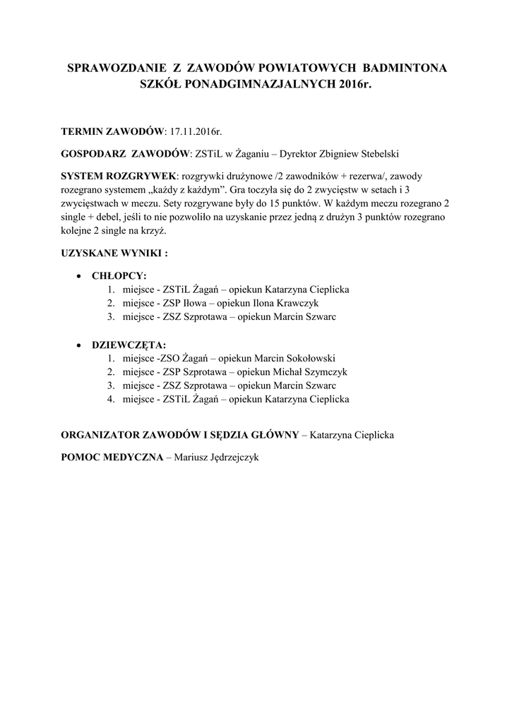 SPRAWOZDANIE Z ZAWODÓW POWIATOWYCH BADMINTONA SZKÓŁ PONADGIMNAZJALNYCH 2016r. TERMIN ZAWODÓW: 17.11.2016r. GOSPODARZ ZAWODÓW: ZSTiL w Żaganiu – Dyrektor Zbigniew Stebelski SYSTEM ROZGRYWEK: rozgrywki drużynowe /2 zawodników + rezerwa/, zawody rozegrano systemem „każdy z każdym”. Gra toczyła się do 2 zwycięstw w setach i 3 zwycięstwach w meczu. Sety rozgrywane były do 15 punktów. W każdym meczu rozegrano 2 single + debel, jeśli to nie pozwoliło na uzyskanie przez jedną z drużyn 3 punktów rozegrano kolejne 2 single na krzyż. UZYSKANE WYNIKI : CHŁOPCY: 1. miejsce - ZSTiL Żagań – opiekun Katarzyna Cieplicka 2. miejsce - ZSP Iłowa – opiekun Ilona Krawczyk 3. miejsce - ZSZ Szprotawa – opiekun Marcin Szwarc DZIEWCZĘTA: 1. miejsce -ZSO Żagań – opiekun Marcin Sokołowski 2. miejsce - ZSP Szprotawa – opiekun Michał Szymczyk 3. miejsce - ZSZ Szprotawa – opiekun Marcin Szwarc 4. miejsce - ZSTiL Żagań – opiekun Katarzyna Cieplicka ORGANIZATOR ZAWODÓW I SĘDZIA GŁÓWNY – Katarzyna Cieplicka POMOC MEDYCZNA – Mariusz Jędrzejczyk