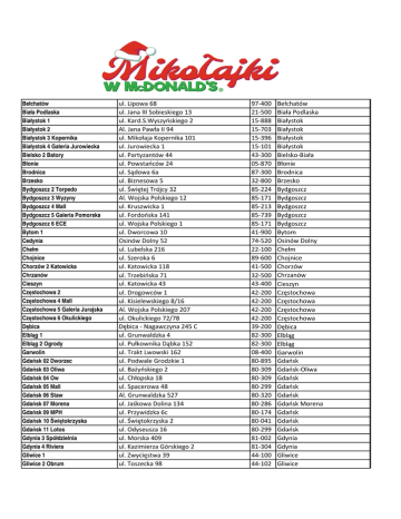 Bełchatów Biała Podlaska Białystok 1 Białystok 2 Białystok 3 Kopernika Białystok 4 Galeria Jurowiecka Bielsko 2 Batory Błonie Brodnica Brzesko Bydgoszcz 2 Torpedo Bydgoszcz 3 Wyzyny Bydgoszcz 4 Mall Bydgoszcz 5 Galeria Pomorska Bydgoszcz 6 ECE Bytom 1 Cedynia Chełm Chojnice Chorzów 2 Katowicka Chrzanów Cieszyn Częstochowa 2 Częstochowa 4 Mall Częstochowa 5 Galeria Jurajska Częstochowa 6 Okulickiego Dębica Elbląg 1 Elbląg 2 Ogrody Garwolin Gdańsk 02 Dworzec Gdańsk 03 Oliwa Gdańsk 04 Ow Gdańsk 05 Mall Gdańsk 06 Staw Gdańsk 07 Morena Gdańsk 09 MPH Gdańsk 10 Świętokrzyska Gdańsk 11 Lotos Gdynia 3 Spółdzielnia Gdynia 4 Riviera Gliwice 1 Gliwice 2 Obrum ul. Lipowa 68 ul. Jana III Sobieskiego 13 ul. Kard.S.Wyszyńskiego 2 Al. Jana Pawła II 94 ul. Mikołaja Kopernika 101 ul. Jurowiecka 1 ul. Partyzantów 44 ul. Powstańców 24 ul. Sądowa 6a ul. Biznesowa 5 ul. Świętej Trójcy 32 Al. Wojska Polskiego 12 ul. Kruszwicka 1 ul. Fordońska 141 ul. Wojska Polskiego 1 ul. Dworcowa 10 Osinów Dolny 52 ul. Lubelska 216 ul. Szeroka 6 ul. Katowicka 118 ul. Trzebińska 71 ul. Katowicka 43 ul. Drogowców 1 ul. Kisielewskiego 8/16 Al. Wojska Polskiego 207 ul. Okulickiego 72/78 Dębica - Nagawczyna 245 C ul. Grunwaldzka 4 ul. Pułkownika Dąbka 152 ul. Trakt Lwowski 162 ul. Podwale Grodzkie 1 ul. Bażyńskiego 2 ul. Chłopska 18 ul. Spacerowa 48 Al. Grunwaldzka 527 ul. Jaśkowa Dolina 134 ul. Przywidzka 6c ul. Świętokrzyska 2 ul. Odyseusza 16 ul. Morska 409 ul. Kazimierza Górskiego 2 ul. Zwycięstwa 39 ul. Toszecka 98 97-400 21-500 15-888 15-703 15-396 15-101 43-300 05-870 87-300 32-800 85-224 85-171 85-213 85-739 85-171 41-900 74-520 22-100 89-600 41-500 32-500 43-400 42-200 42-200 42-200 42-200 39-200 82-300 82-300 08-400 80-895 80-309 80-309 80-299 80-320 80-286 80-174 80-041 80-299 81-002 81-304 44-100 44-102 Bełchatów Biała Podlaska Białystok Białystok Białystok Białystok Bielsko-Biała Błonie Brodnica Brzesko Bydgoszcz Bydgoszcz Bydgoszcz Bydgoszcz Bydgoszcz Bytom Osinów Dolny Chełm Chojnice Chorzów Chrzanów Cieszyn Częstochowa Częstochowa Częstochowa Częstochowa Dębica Elbląg Elbląg Garwolin Gdańsk Gdańsk-Oliwa Gdańsk Gdańsk Gdańsk Gdańsk Morena Gdańsk Gdańsk Gdańsk Gdynia Gdynia Gliwice Gliwice Gliwice 4 EC DT Głogów Gniezno Gorzów Wlkp 1 Gorzów Wlkp 2 Centrum Grodzisk Mazowiecki Grudziądz Gubin Inowrocław Inowrocław Galeria Solna Jarocin Jasienica Jastrzębie Jaworzno Jaworzno 2 Galeria Galena Jelenia Góra 2 Kalisz Kalisz 2 Echo CH Amber Katowice 1 Stawowa Katowice 6 Ułańska Katowice 9 Rolna Kędzierzyn - Koźle Kępno Kielce 1 Kielce 2 Sienkiewicza Kielce 3 Kielce 4 Echo Kielce 5 Korona Kłodzko Kobyłka Kołobrzeg Konin 1 Konin 2 Ferio Konstancin Jeziorna Kostrzyn Koszalin 3 Monte Cassino Kórnik Kraków 02 Rondo Mateczny Kraków 04 Fala Kraków 06 Wielicka Kraków 08 Metro Kraków 09 Bora Kraków 10 Galeria Plaza Kraków 13 Mogilany Kraków 15 CzyŜyny Krosno Kutno Legnica Leszno 1 Leszno 2 Mall ul. Pszczyńska 325 Aleja Wolności 1 ul. Żwirki i Wigury 32A ul. Walczaka 41 ul. Wybickiego 11 ul. Królewska 60 ul. Włodka 13 ul. Budziszyńska 9 ul. Biskupa Antoniego Laubitza 1 ul. Wojska Polskiego 16 ul. Wojska Polskiego 28 ul. Strumieńska 4 ul. Piłsudskiego 37 ul. Wojska Polskiego 2d ul. Grunwaldzka 59 ul. Grunwaldzka 12 Al. Wojska Polskiego 120 ul. Górnośląska 82 ul. Stawowa 5 ul. Ułańska 4 ul. Woźniczki 15 ul. Armii Krajowej 42 ul. Solidarności 26a Al. Solidarności 16 ul. Sienkiewicza 44 ul. Armii Krajowej 1 ul. Świętokrzyska 20 ul. Warszawska 26 ul. Objazdowa 26 ul. Nadarzyńska 1 ul. Koszalińska 36A ul. Kard. St. Wyszyńskiego 1A ul. Ogrodowa 31e ul. Warszawska 106 ul.Gorzyńska 2 Al. Monte Cassino 26 ul. Poznańska 85 ul. Wadowicka 2A ul. Jasnogórska 2 ul. Wielicka 85 Al. Pokoju 67 ul. Bora Komorowskiego 33 Al. Pokoju 44 ul. Krakowska 24A ul. Medweckiego 13 ul. Lwowska 56 ul. Józefów 28 ul. Wrocławska 22 Al. Konstytucji 3-go Maja 3A Al. Konstytucji 3 Maja 12 44-100 67-200 62-200 66-400 66-400 05-827 86-300 66-620 88-100 88-100 63-200 43-385 44-330 43-603 43-600 58-500 62-800 62-800 40-095 40-887 40-555 47-224 63-600 25-900 25-507 25-014 25-406 25-317 57-300 05-230 78-100 62-510 62-571 05-520 66-470 75-412 62-035 30-415 31-358 30-552 31-580 31-876 31-564 32-031 31-870 38-400 99-300 59-220 64-100 64-100 Gliwice Głogów Gniezno Gorzów Wielkopolski Gorzów Wielkopolski Grodzisk Mazowiecki Grudziądz Gubin Inowrocław Inowrocław Jarocin Jasienica Jastrzębie Zdrój Jaworzno Jaworzno Jelenia Góra Kalisz Kalisz Katowice Katowice Katowice Kędzierzyn - Koźle Kępno Kielce Kielce Kielce Kielce Kielce Kłodzko Kobyłka Kołobrzeg Konin Stare Miasto Bielawa Kostrzyn n/Odrą Koszalin Kórnik Kraków Kraków Kraków Kraków Kraków Kraków Mogilany Kraków Krosno Kutno Legnica Leszno Leszno Lubin 1 Lubin 2 Cuprum Arena Lublin 1 Lublin 2 Tysiąclecia Lublin 4 Olimp Lubliniec Luboń Łomianki CH Auchan ŁomŜa Łódź 02 Bazar Łódź 04 Łódka Łódź 06 Batory Łódź 09 Retkinia Łódź 13 Manufaktura Malbork Mielec Mikołów Mińsk Mazowiecki MOP Brwinów N MOP Goleniów Łozienica S3 W MOP Goleniów śdŜary S3 E MOP Grójec Worów S7 W MOP Łęka A2 S MOP Małopole S8 E MOP Markuszów S17 N MOP Markuszów S17 S MOP Mszczonów Wymysłów S8 E MOP Okmiany MOP Parma A2 N MOP Polesie A2 S MOP Police A2 N MOP Sitno S3 E MOP Sople S7 W MOP Suchedniów S7 W Mysłowice Nadarzyn Maximus Nieporęt Nowy Dwór Gdański Nowy Dwór Mazowiecki Nowy Sącz Nowy Targ Nysa Olkusz Olsztyn 1 Olsztyn 2 Olsztyn 3 Galeria Warmińska Oława Opole 1 Opole 2 Opole 3 Karolinka ul. Piłsudskiego 3 ul. Gen. Władysława Sikorskiego 20 ul. Chemiczna 5 ul. Puławska 40 Al. Spółdzielczości Pracy 34 ul. Lubliniecka 1B ul. Żabikowska 53 A ul. Brukowa 25 Al. Legionów 58 ul. Rzgowska 211 ul. Inowrocławska 2 ul. Puszkina/róg Rokicińskiej ul. Retkinska 103 ul. Drewnowska 58, budynek 9 ul. Piastowska 2 ul. Moniuszki 10 ul. Cieszyńska 19 