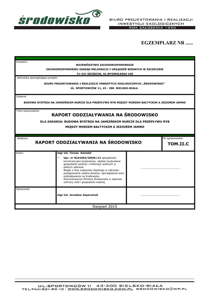 RAPORT ODDZIAŁYWANIA NA ŚRODOWISKO BUDOWA BYSTRZA NA JAMIEŃSKIM NURCIE DLA PRZEPŁYWU RYB MIĘDZY MORZEM BAŁTYCKIM A JEZIOREM JAMNO EGZEMPLARZ NR ...... Inwestor: WOJEWÓDZTWO ZACHODNIOPOMORSKIE ZACHODNIOPOMORSKI ZARZĄD MELIORACJI I URZĄDZEŃ WODNYCH W SZCZECINIE 71-421 SZCZECIN, UL.WYZWOLENIA 105 Jednostka sporządzająca projekt: BIURO PROJEKTOWANIA I REALIZACJI INWESTYCJI EKOLOGICZNYCH „ŚRODOWISKO” UL. SPORTOWCÓW 11, 43 - 300 BIELSKO-BIAŁA Zadanie: BUDOWA BYSTRZA NA JAMIEŃSKIM NURCIE DLA PRZEPŁYWU RYB MIĘDZY MORZEM BAŁTYCKIM A JEZIOREM JAMNO Tytuł opracowania: RAPORT ODDZIAŁYWANIA NA ŚRODOWISKO DLA ZADANIA: BUDOWA BYSTRZA NA JAMIEŃSKIM NURCIE DLA PRZEPŁYWU RYB MIĘDZY MORZEM BAŁTYCKIM A JEZIOREM JAMNO Stadium: Nr opracowania: RAPORT ODDZIAŁYWANIA NA ŚRODOWISKO Autor: TOM.II.C mgr inż. Teresa Szendoł − − − Upr. nr SLK4204/ZHOK/12 specjalność: konstrukcyjno-budowlana: obiekty budowlane gospodarki wodnej i melioracji wodnych w pełnym zakresie Biegły z listy wojewody śląskiego w zakresie: postępowania wodno-prawne, sporządzania ocen oddziaływania na środowisko Rzeczoznawcza Ministra Środowiska w zakresie ochrony wód i gospodarki wodnej ............................................ Opracował: mgr inż. Jarosław Zaparaniuk ............................................ Sierpień 2015 1 RAPORT ODDZIAŁYWANIA NA ŚRODOWISKO BUDOWA BYSTRZA NA JAMIEŃSKIM NURCIE DLA PRZEPŁYWU RYB MIĘDZY MORZEM BAŁTYCKIM A JEZIOREM JAMNO SPIS ZAWARTOŚCI OPRACOWANIA ZAWARTOŚĆ OPRACOWANIA Strona tytułowa Spis zawartości projektu CZĘŚĆ I - OPISOWA CZEŚĆ II - ZAŁĄCZNIKI NR NAZWA ZAŁĄCZNIKA 1. Rys.1 – Mapa orientacyjna – skala 1 : 10 000 / 1 : 200 000 / 1 : 1 500 000 2. Rys.2.1 – Projektowana przepławka – wariant II – skala 1 : 500 3. Rys.2.2 – Projektowana przepławka – wariant I – skala 1 : 500 4. Rys.2.3 – Projektowana przepławka – wariant III – skala 1 : 500 5. Rys.2.4 – Projektowana przepławka – wariant IV – skala 1 : 50 6. Rys.3 – Organizacja placu i dojazdów – skala 1 : 500 Pozostałe dokumenty 1. Załącznik zewnętrzny - TOM.II.A – Inwentaryzacja terenu 2. Załącznik zewnętrzny - TOM.II.B - Dokumentacja fotograficzna 2 RAPORT ODDZIAŁYWANIA NA ŚRODOWISKO BUDOWA BYSTRZA NA JAMIEŃSKIM NURCIE DLA PRZEPŁYWU RYB MIĘDZY MORZEM BAŁTYCKIM A JEZIOREM JAMNO CZĘŚĆ I OPISOWA 3 RAPORT ODDZIAŁYWANIA NA ŚRODOWISKO BUDOWA BYSTRZA NA JAMIEŃSKIM NURCIE DLA PRZEPŁYWU RYB MIĘDZY MORZEM BAŁTYCKIM A JEZIOREM JAMNO Spis treści I. WSTĘP.....................................................................................................................7 1.1. 1.2. 1.3. 1.4. 1.5. 1.6. 1.7. 1.8. Nazwa opracowania.............................................................................................7 Inwestor.............................................................................................................7 Jednostka sporządzająca raport.............................................................................7 Zespół autorski....................................................................................................7 Podstawa opracowania.........................................................................................7 Przepisy prawne..................................................................................................8 Wykorzystane materiały.......................................................................................9 Cel i zakres opracowania.....................................................................................10 2. WPROWADZENIE...................................................................................................11 2.1. Opis metodyki oceny, przyjęte założenia i ustalenia, wykorzystane dane o środowisku 11 2.2. Inwentaryzacja przyrodnicza...............................................................................11 2.3. Przyjęte wartości normowe w ocenie uciążliwości projektowanego obiektu................12 3. OPIS PLANOWANEGO PRZEDSIĘWZIĘCIA.............................................................14 3.1. Lokalizacja .......................................................................................................14 3.2. Istniejący stan zagospodarowania terenu..............................................................15 3.3. Charakterystyka planowanego przedsięwzięcia oraz przedsięwzięć związanych..........17 3.4. OPIS ELEMENTÓW PRZYRODNICZYCH ŚRODOWISKA.........................................22 3.4.1. Krajobraz i morfologia terenu........................................................................22 3.4.2. Atmosfera i klimat.......................................................................................23 3.4.2.1. Klimat akustyczny....................................................................................26 3.4.3. Budowa geologiczna....................................................................................26 3.4.4. Gleby.........................................................................................................29 3.4.5. Wody powierzchniowe i podziemne................................................................30 3.4.5.1. Wody powierzchniowe...............................................................................30 3.4.5.2. Wody podziemne......................................................................................36 3.4.5.3. Jakość wody w Jamieńskim Nurcie..............................................................37 3.4.6. Fauna........................................................................................................38 3.4.7. Flora..........................................................................................................40 3.4.8. Pomniki przyrody........................................................................................43 3.4.9. Zabytki chronione..............................................