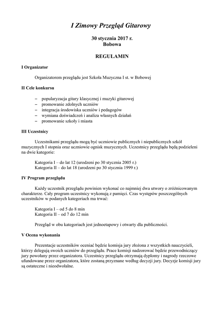 I Zimowy Przegląd Gitarowy 30 stycznia 2017 r. Bobowa REGULAMIN I Organizator Organizatorem przeglądu jest Szkoła Muzyczna I st. w Bobowej II Cele konkursu – – – – – popularyzacja gitary klasycznej i muzyki gitarowej promowanie zdolnych uczniów integracja środowiska uczniów i pedagogów wymiana doświadczeń i analiza własnych działań promowanie szkoły i miasta III Uczestnicy Uczestnikami przeglądu mogą być uczniowie publicznych i niepublicznych szkół muzycznych I stopnia oraz uczniowie ognisk muzycznych. Uczestnicy przeglądu będą podzieleni na dwie kategorie: Kategoria I – do lat 12 (urodzeni po 30 stycznia 2005 r.) Kategoria II – do lat 18 (urodzeni po 30 stycznia 1999 r.) IV Program przeglądu Każdy uczestnik przeglądu powinien wykonać co najmniej dwa utwory o zróżnicowanym charakterze. Cały program uczestnicy wykonują z pamięci. Czas występów poszczególnych uczestników w podanych kategoriach ma trwać: Kategoria I – od 5 do 8 min Kategoria II – od 7 do 12 min Przegląd w obu kategoriach jest jednoetapowy i otwarty dla publiczności. V Ocena wykonania Prezentacje uczestników oceniać będzie komisja jury złożona z wszystkich nauczycieli, którzy delegują swoich uczniów do przeglądu. Prace komisji nadzorować będzie przewodniczący jury powołany przez organizatora. Uczestnicy przeglądu otrzymają dyplomy i nagrody rzeczowe ufundowane przez organizatora, które zostaną przyznane według decyzji jury. Decyzje komisji jury są ostateczne i nieodwołalne. VI Termin i miejsce przeglądu Przegląd odbędzie się 30 stycznia 2017 roku w budynku Szkoły Muzycznej I stopnia w Bobowej. Przesłuchania odbywać się będą w sali koncertowej szkoły. VII Karta zgłoszeń i potwierdzenie wpłaty wpisowego Karty zgłoszeń wraz z potwierdzeniem wpłaty wpisowego należy przesłać e-mailem na: [email protected] lub pocztą na adres: Szkoła Muzyczna I stopnia w Bobowej ul. Długoszowskich 3, 38-350 Bobowa Ostateczny termin wpłynięcia kart zgłoszeń i potwierdzeń wpłat wpisowego upływa 23 grudnia. Organizatorzy ustalają wpisowe w wysokości 40 złotych. Wpisowe należy przesłać do dnia 23 grudnia pod podany nr konta bankowego Rady Rodziców Szkoły Muzycznej w Bobowej: 20 8797 1013 0010 0169 5441 0001 W tytule przelewu należy podać imię i nazwisko uczestnika oraz hasło: I Zimowy Przegląd Gitarowy. (np. Jan Kowalski – I Zimowy Przegląd Gitarowy). W przypadku rezygnacji uczestnika, wpisowe nie podlega zwrotowi. VIII Uwagi organizacyjne – – – – – organizator zastrzega sobie prawo do bezpłatnego fotografowania i nagrywania, a także swobodnej emisji utworów prezentowanych podczas przeglądu, przez radio i telewizję czas trwania występu podany w programie przeglądu powinien być bezwzględnie przestrzegany. W przypadku zmian w programie przesłuchań należy powiadomić o tym organizatora przed rozpoczęciem przeglądu przesłanie zgłoszenia jest jednoznaczne z przyjęciem Regulaminu przeglądu koszt przejazdu, wyżywienia i zakwaterowania pokrywają uczestnicy we własnym zakresie. IX Harmonogram przeglądu Szczegółowy harmonogram przeglądu zostanie przesłany uczestnikom pod podany w karcie zgłoszeń adres e-mail po zamknięciu listy zgłoszeń. Wszystkie informacje dotyczące programu i regulaminu będą dostępne na stronie internetowej: www.szkolamuzyczna.bobowa.pl X Adres i dane kontaktowe organizatora Szkoła Muzyczna I st. w Bobowej ul. Długoszowskich 3, 38-350 Bobowa tel. 18 351 10 26 adres e-mail: [email protected]