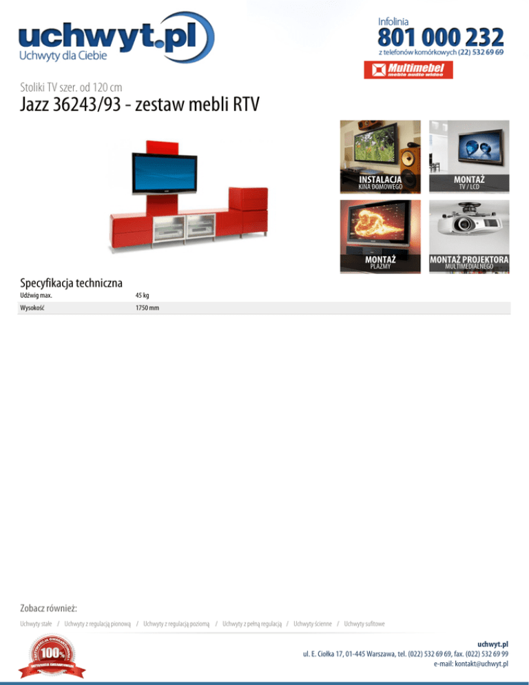 Stoliki TV szer. od 120 cm Jazz 36243/93 - zestaw mebli RTV INSTALACJA MONTAŻ MONTAŻ MONTAŻ PROJEKTORA KINA DOMOWEGO PLAZMY TV / LCD MULTIMEDIALNEGO Specyfikacja techniczna Udźwig max. 45 kg Wysokość 1750 mm Zobacz również: Uchwyty stałe / Uchwyty z regulacją pionową / Uchwyty z regulacją poziomą / Uchwyty z pełną regulacją / Uchwyty ścienne / Uchwyty sufitowe uchwyt.pl ul. E. Ciołka 17, 01-445 Warszawa, tel. (022) 532 69 69, fax. (022) 532 69 99 e-mail: [email protected]