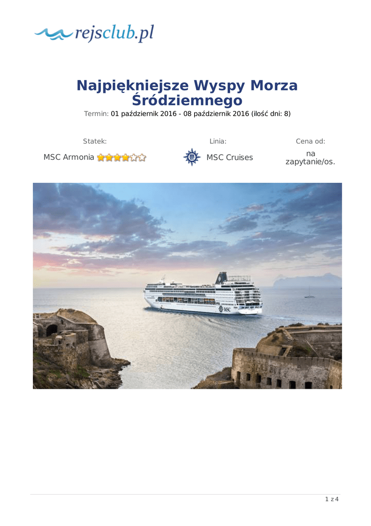 Najpiękniejsze Wyspy Morza Śródziemnego Termin: 01 październik 2016 - 08 październik 2016 (ilość dni: 8) Statek: MSC Armonia Linia: MSC Cruises Cena od: na zapytanie/os. 1 z4 TRASA REJSU dzień 1 Data Port sobota 01.10.2016 Genua Włochy Wpłynięcie Wypłynięcie Legenda --:-- 18:00 Zbiórka na lotnisku w Warszawie. P rzelot do Włoch. P rzejazd do portu i zaokrętowanie na statek MSC Armonia. dzień 2 niedziela 02.10.2016 Marsylia Francja 09:00 16:00 Zwiedzanie największego miasta południowej Francji, m.in.: wyjazd na 162-metrowe wzgórze La Garde i zwiedzanie Bazyliki Notre Dame de la Garde. dzień 3 poniedziałek 03.10.2016 Mahon, Minorka Hiszpania 07:00 15:00 Zwiedzanie stolicy drugiej co do wielkości wyspy w archipelagu Balearów. Spacer z pilotem a następnie czas wolny dzień 4 wtorek 04.10.2016 Cagliari, Sardynia Włochy 11:00 17:00 Spacer po stolicy Sardynii. Dla chętnych przejazd na jedną z pięknych plaż wyspy (opcjonalnie). dzień 5 środa 05.10.2016 Valletta Malta 13:30 21:00 Zwiedzanie stolicy wyspy wpisanej na Listę Światowego Dziedzictwa UNESC O. C zas wolny na zakupy w centrum La Valletty pełnej sklepów, knajpek i restauracji. dzień 6 czwartek 06.10.2016 Mesyna, Sycylia Włochy 07:30 13:30 09:00 19:00 Wycieczka do Taorminy, nazywanej „perełką Sycylii”. dzień 7 piątek 07.10.2016 Civitavecchia, Rzym Włochy C ałodniowa wycieczka do Rzymu i zwiedzanie najpopularniejszych zabytków Wiecznego Miasta. dzień 8 sobota 08.10.2016 Genua Włochy 09:00 --:-- Wyokrętowanie. Transfer na lotnisko, wylot do kraju. P rzylot do P olski. Zakończenie imprezy. 2 z4 CENNIK Cena katalogowa Kabina wewnętrzna 5 075.00zł Kabina zewnętrzna z oknem 5 395.00zł Kabina zewnętrzna z balkonem 6 695.00zł Kabina jednoosobowa na zapytanie 3 i 4 osoba dorosła w kabinie na zapytanie dziecko do 12 lat jako 3 i 4 osoba w kabinie na zapytanie dziecko od 13 do 17 lat jako 3 i 4 osoba w kabinie na zapytanie Opłaty portowe i obowiązkowe Bilet lotniczy (w PLN) Cena promocyjna w cenie ok. 1200zł Uwaga! Ceny za osobę w kabinie dwuosobowej. Cena zawiera: 8 dniowy rejs statkiem MSC Armonia - zakwaterowanie w wybranej kabinie; pełne wyżywienie w trakcie rejsu: 3 główne posiłki i przekąski między posiłkami; napoje serwowane do śniadania i w bufetach samoobsługowych; serwis bagażowy podczas wejścia i zejścia ze statku; serwis kabinowy; korzystanie ze wszystkich urządzeń sportowo - rekreacyjnych znajdujących się na pokładzie statku (basen, jacuzzi, sala fitness, itp.); udział we wszystkich imprezach organizowanych na statku (przedstawienia w teatrze, koncerty, programy animacyjne itp.); wszystkie wycieczki fakultatywne opisane w programie; wszystkie transfery; podatki, opłaty portowe i ubezpieczenie: KL, NNW i bagażu; opiekę polskiego pilota w trakcie całej imprezy. Cena nie zawiera: biletu lotniczego na trasie Warszawa - Mediolan - Warszawa; korzystania z barów, mini baru w kabinie oraz napojów zamawianych w restauracji; wycieczek fakultatywnych nie wymienionych w programie; biletów wstępu do zwiedzanych obiektów; korzystania z punktów usługowych (fryzjer, pralnia, fotograf, salon piękności i odnowy biologicznej, internet) i wydatków osobistych; napiwków dla obsługi na statku (ok. 8.5 EUR/os. dorosła/dzień, dzieci 3-13 lat 4,25 EUR/dzień, poniżej 3 lat gratis).). Uwagi: istnieje możliwość wykupienia pakietu All Inclusive obejmującego wybrane napoje alkoholowe i bezalkoholowe dostępne bez ograniczeń we wszystkich barach. Cena pakietu 26 EUR/dzień/os. 3 z4 dorosła i 12 EUR/dzień/dziecko. Warunkiem skorzystania z pakietu all inclusive jest wykupienie pakietu przez wszystkich pasażerów podróżujących w jednej kabinie na czas całego rejsu; kabiny 1, 3 i 4 osobowe są na zapytanie i sprzedawane tylko po potwierdzeniu; grupa z polskim pilotem realizowana przy min. 16 osobach; pilot spotyka się z uczestnikami na lotnisku w Warszawie. Bilet lotniczy: Powyższa cena dotyczy przelotu w klasie ekonomicznej i została podana w oparciu o cenę z dnia przygotowania oferty. Dokładna cena przelotu podawana jest w momencie rezerwacji. Proponowany przelot liniami lotniczymi Lufthansa. Przelot WARSZAWA - MEDIOLAN Przelot MEDIOLAN - WARSZAWA 01.10.2016 | Warszawa - Monachium: 06:00 - 08.10.2016 | Mediolan - Monachium: 16:40 07:35 17:50 01.10.2016 | Monachium - Mediolan: 08:40 - 08.10.2016 | Monachium - Warszawa: 19:20 09:45 20:45 4 z4