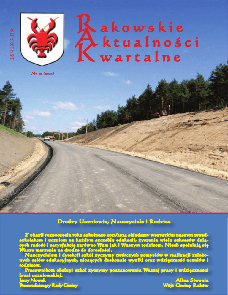 R akowskie A ktualności K wartalne ISSN 2083-0380 Rakowskie Aktualności Kwartalne Drodzy Uczniowie, Nauczyciele i R odzice Z okazji rozpoczęcia roku szkolnego 2013/2014 składamy wszystkim naszym przedszkolakom i uczniom na każdym szczeblu edukacji, życzenia wielu sukcesów dających radość i satysfakcję zarówno Wam jak i Waszym rodzicom. Niech spełniają się Wasze marzenia na drodze do dorosłości. Nauczycielom i dyrekcji szkół życzymy twórczych pomysłów w realizacji założonych celów edukacyjnych, niosących doskonałe wyniki oraz wdzięczność uczniów i rodziców. Pracownikom obsługi szkół życzymy poszanowania Waszej pracy i wdzięczności braci uczniowskiej. Jerzy Nowak Alina Siwonia 1 Przewodniczący Rady Gminy Wójt Gminy R aków Rakowskie Aktualności Kwartalne WOJEWÓDZTWO ŚWIĘTOKRZYSKIE Prace nad Rewitalizacją Rynku w Rakowie nabierają tempa Z chwilą przekazania placu budowy, które miało miejsce 23 maja 2013 r. ruszyły prace przy Rewitalizacji Rynku w Rakowie. Pierwszy etap prac obejmuje wymianę przestarzałej infrastruktury technicznej: wodnej, kanalizacyjnej, deszczowej, elektrycznej i teletechnicznej. Obecnie trwają prace na ulicy Kościelnej, Młyńskiej oraz Nowym Rynku, gdzie przebudowywana jest kanalizacja sanitarna oraz deszczowa. Po zakończeniu prac ziemnych i położeniu nawierzchni z płyt granitowych mieszkańcy Rakowa będą mogli wreszcie korzystać z nowych miejsc parkingowych zlokalizowanych pomiędzy Rynkiem, a Kościołem Parafialnym p.w. Świętej Trójcy. W nowym miejscu stanie też figura św. Floriana posadowiona na kamiennym postumencie. Niewątpliwie nowego oblicza nabierze Nowy Rynek, na którym w części centralnej przewidziano budowę ujęcia wody. Otoczona zielenią studnia stanowić będzie atrakcyjne miejsce do wypoczynku. Wokół Nowego Rynku przewidziano również wymianę oświetlenia ulicznego. O dalszych postępach prac będziemy informować na bieżąco. Marzena Koncewicz … dla rozwoju Województwa Świętokrzyskiego... Ocalmy od zapomnienia Rozpoczęta inwestycja pn. „Rewitalizacja Rynku w Rakowie wraz z terenami przyległymi” jest znakomitą okazją do skierowania specjalnej prośby do mieszkańców Rakowa. Bardzo Państwa prosimy o udostępnienie redakcji gazety „RAK” starych fotografii Rakowa do zeskanowania. Będą to dla nas bardzo cenne pamiątki, które wykorzystamy dokumentując bogatą historię naszego miasteczka. Chcemy „ocalić od zapomnienia” widoki, które zacierają się w naszej pamięci. Planujemy zorganizować wystawę fotografii w dniu otwarcia Rynku po rewitalizacji, opisując imieniem i nazwiskiem autora lub właściciela. Oryginalne zdjęcia proszę przynieść do Urzędu Gminy Raków, pok. nr 18. Osoba do kontaktu – Dariusz Jóźwik, tel. 41 35 35 018. -2- Dariusz Jóźwik Rakowskie Aktualności Kwartalne Panie Marszałku dziękujemy za obwodnicę Finalizują się długo oczekiwane marzenia Rakowian związane z budową obwodnicy stolicy naszej gminy. Raków nabiera nowego wymiaru i zdobywa nowe szanse. Niespełna 3 km drogi z trzema rondami i jednym skrzyżowaniem biegnące po północnej stronie Rakowa przygotowuje nowe inwestycyjne możliwości, z których z pewnością skorzystają przedsiębiorcy. Dziś już widać efekty pracy firmy Skanska, która zamierza terminowo wywiązać się z umowy i z końcem października oddać inwestorowi wykonane zadanie. Inwestorem jest Samorząd Województwa. Przychylność i wielka życzliwość Pana Marszałka Adama Jarubasa sprawiły, że moje argumenty znalazły akceptację i co najważniejsze środki finansowe w budżecie województwa w wysokości ok. 20 mln zł zarówno na inwestycję, jak i wykup nieruchomości potrzebnych dla jej realizacji. Tę wielką przychylność należy docenić tym bardziej, że Samorząd Województwa ma wysoki poziom zadłużenia z racji zaangażowania w inwestycje z udziałem środków unijnych. Mogą odetchnąć z ulgą mieszkańcy ulic: Sienieńskiego, Rynku i Klasztornej. Sześć lat moich starań dało bardzo wymierny efekt o strategicznym znaczeniu dla Rakowa. Otworzyła się droga dla realizacji zadania pn. „Rewitalizacja Rynku w Rakowie wraz z terenami przyległymi”. Przebudowa zabytkowego centrum Rakowa będzie dopełnieniem planów inwestycyjnych naszej historycznej i turystycznej miejscowości, w której Pan Marszałek Adam Jarubas będzie zawsze oczekiwanym, niezwykle miłym gościem. -3- Alina Siwonia Wójt Gminy Raków Rakowskie Aktualności Kwartalne UTWORZENIE PLACU ZABAW W OCIESĘKACH W lipcu 2013 r. powstał kolejny plac zabaw dla dzieci na terenie Gminy, tym razem przy Szkole Podstawowej w miejscowości Ociesęki. Wykonawca Przedsiębiorstwo Wielobranżowe „APIS” J. Oziębło, z Jarosławia został wyłoniony w wyniku przeprowadzonego postępowania przetargu nieograniczonego. Łączny koszt budowy nowego placu zabaw wynosi 37600,14 zł. 61,48 % inwestycji tj. 24455 zł pokryło dofinansowane z programu „Odnowa i Rozwój Wsi” które pozyskaliśmy od Urzędu Marszałkowskiego Województwa Świętokrzyskiego. Plac zabaw został wyposażony w zestaw urządzeń pozwalających na swobodną i co najważniejsze bezpieczną zabawę. Umieszczone zabawki to: zestaw zabawkowy, huśtawki ważki, huśtawki podwójne, piaskownica, pomost wiszący z dwoma tra- pami, kilka różnych bujaków, kosze z ławkami oraz brama ogrodzeniowa z furtką. Jan Oszczypała Dofinansowanie do dróg transportu rolnego Naprawiamy drogi po ulewnych deszczach Znakomicie układająca się współpraca władz Gminy Raków z Samorządem Województwa Świętokrzyskiego zaowocowała dotacją w wysokości 44 tys. zł na remont dróg dojazdowych do gruntów rolnych. Jest to połowa środków finansowych potrzebnych na wykonanie remontu drogi dojazdowej do gruntów rolnych w miejscowości Nowa Huta do przysiółka Igrzycznia oraz drogi dojazdowej do gruntów rolnych w miejscowości Radostów, przysiółek Choin