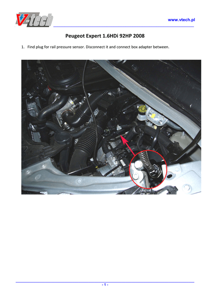 www.vtech.pl ____________________________________________________________________________ Peugeot Expert 1.6HDi 92HP 2008 1. Find plug for rail pressure sensor. Disconnect it and connect box adapter between. ___________________________________________________________________________________________ -1-