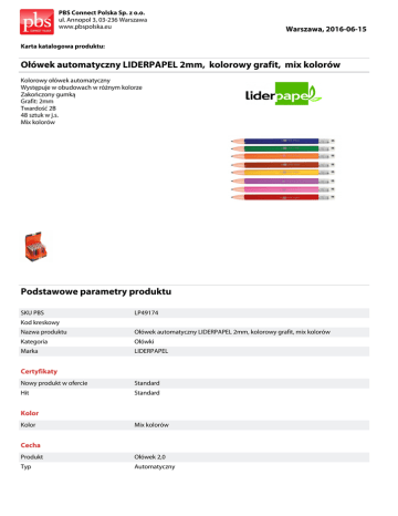 PBS Connect Polska Sp. z o.o. ul. Annopol 3, 03-236 Warszawa www.pbspolska.eu Warszawa, 2016-06-15 Karta katalogowa produktu: Ołówek automatyczny LIDERPAPEL 2mm, kolorowy grafit, mix kolorów Kolorowy ołówek automatyczny Występuje w obudowach w różnym kolorze Zakończony gumką Grafit: 2mm Twardość 2B 48 sztuk w j.s. Mix kolorów Podstawowe parametry produktu SKU PBS LP49174 Kod kreskowy Nazwa produktu Ołówek automatyczny LIDERPAPEL 2mm, kolorowy grafit, mix kolorów Kategoria Ołówki Marka LIDERPAPEL Certyfikaty Nowy produkt w ofercie Standard Hit Standard Kolor Kolor Mix kolorów Cecha Produkt Ołówek 2,0 Typ Automatyczny PBS Connect Polska Sp. z o.o. ul. Annopol 3, 03-236 Warszawa www.pbspolska.eu Warszawa, 2016-06-15 Karta katalogowa produktu cd. Ołówek automatyczny LIDERPAPEL 2mm, kolorowy grafit, mix kolorów Podstawowe parametry produktu Rodzaj Uniwersalny W ofercie od 2014-05 Wymiary Końcówka (mm) 2 Rozmiar 2B Wspólny słownik zamówień CPV 30192131-8 Ołówki automatyczne Jednostki logistyczne Opakowanie 1 48 szt Opakowanie 2 1440 szt