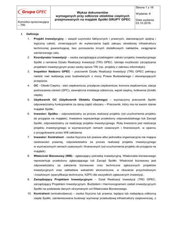 Strona 1 z 16 Komórka opracowująca – TRI I. Wykaz dokumentów wymaganych przy odbiorze obiektów cieplnych przejmowanych na majątek Spółki GRUPY GPEC Wydanie: 6 Data wydania: 03.10.2016. Definicje 1. Projekt inwestycyjny – zespół czynności faktycznych i prawnych, stanowiących spójną i logiczną całość, zmierzających do wytworzenia bądź zakupu określonej infrastruktury technicznej gwarantującej, bez ponoszenia innych dodatkowych nakładów, osiągnięcie zamierzonego celu. 2. Koordynator Inwestycji – osoba zarządzająca przebiegiem całości projektu inwestycyjnego Spółki z ramienia Działu Realizacji Inwestycji (TRI) GPEC. Istnieje możliwość zarządzania projektem inwestycyjnym przez osoby spoza TRI (np. projekty z zakresu informatyki). 3. Inspektor Nadzoru GPEC – pracownik Działu Realizacji Inwestycji (TRI) GPEC pełniący nadzór nad realizacją prac budowlanych z mocy Prawa Budowlanego i obowiązujących przepisów. 4. OC - Obiekt Cieplny - sieć ciepłownicza, przyłącze ciepłownicze, komora ciepłownicza, stacja podnoszenia ciśnień (SPC), zewnętrzna instalacja odbiorcza, węzeł cieplny, kotłownia (źródło ciepła). 5. Użytkownik OC (Użytkownik Obiektu Cieplnego) – wyznaczony pracownik Spółki odpowiedzialny funkcjonalnie za daną część obszaru – Pracownik, który ma na swoim stanie majątek Spółki. 6. Inwestor: Spółka – odpowiedzialny za proces realizacji projektu (od uruchomienia projektu do przyjęcia na majątek). Inwestora reprezentuje przełożony odpowiedzialnego lub Zarząd Spółki, odpowiedzialny za realizację projektu inwestycyjnego. Rolą Inwestora jest realizacja projektu inwestycyjnego w wyznaczonych ramach czasowych i finansowych, w oparciu o przygotowane przez WB założenia. 7. Inwestor: Kontrahent - osoba fizyczna lub prawna albo jednostka organizacyjna nie mająca osobowości prawnej, odpowiedzialna za proces realizacji projektu inwestycyjnego w wyznaczonych ramach czasowych i finansowych (od uruchomienia projektu do przyjęcia na majątek). 8. Właściciel Biznesowy (WB) - zgłaszający potrzebę inwestycyjną. Właściciela biznesowego reprezentuje przełożony zgłaszającego lub Zarząd Spółki. Właściciel biznesowy jest odpowiedzialny za założenia biznesowe oraz techniczne zgłoszonych projektów inwestycyjnych oraz zakładane wskaźniki ekonomiczne, w obszarze przychodowym i kosztowym (specyfikacja techniczna, KZPI) dla wszystkich zgłaszanych inwestycji.. 9. Zarządzający Projektem Inwestycyjnym – Dział Realizacji Inwestycji (TRI) GPEC, zarządzający Projektem Inwestycyjnym, Budżetem i Harmonogramem zadań inwestycyjnych Spółki na podstawie danych otrzymanych od Właściciela Biznesowego. 10. Kontrahent (wnioskodawca) – osoba fizyczna lub prawna, będąca lub niebędąca odbiorcą ciepła Spółki, zainteresowana budową/ wymianą/ przebudową infrastruktury ciepłowniczej, z Strona 2 z 16 Komórka opracowująca – TRI Wykaz dokumentów wymaganych przy odbiorze obiektów cieplnych przejmowanych na majątek Spółki GRUPY GPEC Wydanie: 6 Data wydania: 03.10.2016. jego zamierzeniami inwestycyjnymi lub osoba/podmiot działająca w imieniu/ reprezentująca osobę fizyczną lub prawną. II. Zasady 1. Odbioru dokonuje się poprzez sprawdzenie zgodności wykonania obiektu cieplnego z dokumentacją techniczną projektową wykonaną zgodnie ze standardami Spółki (wykaz wytycznych wymieniony w pkt. VII n.n. wykazu), uzgodnioną z odpowiednimi służbami w GPEC (wraz z naniesionymi zmianami podpisanymi i uzgodnionymi z odpowiednimi służbami GPEC) i warunkami przyłączenia do sieci ciepłowniczej. 2. W trakcie budowy Obiektu Cieplnego Inspektor Nadzoru GPEC uczestniczy we wszystkich komisjach odbioru robót zanikowych, odbiorów częściowych oraz odbiorów końcowych. Potwierdzeniem uczestnictwa w komisjach odbioru jest wpis w dzienniku budowy, natomiast zakończenie etapu robót jest potwierdzone spisaniem protokołu odbioru częściowego, o ile jest on dopuszczany zapisami umowy zawartej ze Spółką. 3. Odbiór końcowy Obiektu Cieplnego jest potwierdzony spisaniem protokołu odbioru końcowego i przekazania OC do eksploatacji (Użytkownika OC). 4. W przypadku wykonywania Obiektu Cieplnego przez Klienta (wykonawcę obcego) wpisy w dzienniku budowy dokonuje Kierownik Budowy i Inspektor Nadzoru Klienta (o ile jest wymagany zgodnie z pozwoleniem na budowę). We wszystkich komisjach (wprowadzenie na budowę, roboty zanikowe i odbiór końcowy) biorą udział również Inspektor Nadzoru GPEC i Użytkownik OC występujący w roli przedstawicieli Spółki. W takim przypadku Wykonawca zobowiązany jest do przekazania Inspektorowi Nadzoru GPEC (oprócz dokumentów wymienionych w tabelach poniżej) również Oświadczenia o przejęciu obowiązków Inspektora Nadzoru wraz z kopiami uprawnień i zaświadczeniem z Izby Inżynierów Budownictwa oraz z kopią zawiadomienia o rozpoczęciu robót do Urzędu Nadzoru Budowlanego - o ile jest wymagane zawiadomienie. III. Dokumentacja odbiorowa (powykonawcza) 1. Odbiorów obiektów cieplnych dokonuje się w oparciu o dokumenty wymienione w tabelach poniżej. Dokumentację odbiorową (powykonawczą) wykonawca przekazuje do Inspektora Nadzoru GPEC w celu jej weryfikacji. 2. W związku z możliwością występowania na infrastrukturze ciepłowniczej izolacji azbestowocementowych, wykonawca załącza podpisane przez firmę usuwającą azbest oświadczenie o prawidłowości wykonania prac oraz o oczyszczeniu terenu z pyłu azbestowego, z zachowaniem właściwych przepisów technicznych i sanitarnych, w tym zgodnie z Instrukcją BHP postępowania z azbestem, potwierdzenie przekazania (firma usuwająca azbest) wytworzonych odpadów przekazanych do utylizacji uprawnionym odbiorcom, to jest skan karty przekazania odpadów oraz zgłoszenie przez firmę usuwającą azbest do właściwych organów Strona 3 z 16 Komórka opracowująca – TRI Wykaz dokumentów wymaganyc