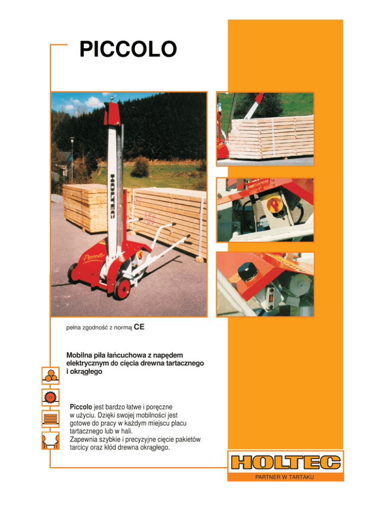 PICCOLO pełna zgodno z norm CE Mobilna piła ła cuchowa z nap dem elektrycznym do ci cia drewna tartacznego i okr głego Piccolo jest bardzo łatwe i por czne w u yciu. Dzi ki swojej mobilno ci jest gotowe do pracy w ka dym miejscu placu tartacznego lub w hali. Zapewnia szybkie i precyzyjne ci cie pakietów tarcicy oraz kłód drewna okr głego. PARTNER W TARTAKU Dane techniczne Długo ci cia: 1,6 m Nap d: 7,5kW Pr dko ci cia: 450 cm2/sec Ci ar: 155 kg Typ ła cucha: Rapid Super STIHL 0,404” 3946-000-0204 Napi cie sieciowe: 400V/50Hz Zbiornik smaru płynnego 4,4 litra Niezale ny nap d pompy olejowej do smaru płynnego Wspornik do ustawiania prostopadło ci ci cia Ogumienie Pał k stabilizuj cy Regulacja napinania ła cucha Instalacja elektryczna zgodna z przepisami VDE Szyna prowadz ca i ła cuch w dostawie schemat urz dzenia: Staramy si ci gle ulepsza nasze konstrukcje wprowadzaj c innowacje i nowsze rozwi zania. Dlatego rysunki i dane techniczne mog ulec zmianie. Dysponujemy szerok gam cz ci zamiennych (ła cuchy i miecze). Szybkie dostawy z przygranicznego magazynu. Oferujemy te wiele innych modeli urz dze do ci cia pakietów. Prosimy zapozna si tak e z nasz ofert automatyzacji placu surowca. HOLTEC GmbH & Co. KG Anlagenbau Przedstawicielstwo w Polsce: J.Kubiak / K.Wasilewski Opolska 33, 91-604 Łód tel. (42) 6508637, kom 601 299 933 tel./fax (42) 6339932 www.holtec.republika.pl QMS ISO 9001 12/02