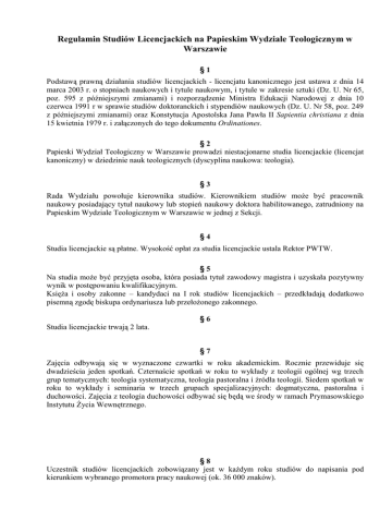 Regulamin Studiów Licencjackich na Papieskim Wydziale Teologicznym w Warszawie §1 Podstawą prawną działania studiów licencjackich - licencjatu kanonicznego jest ustawa z dnia 14 marca 2003 r. o stopniach naukowych i tytule naukowym, i tytule w zakresie sztuki (Dz. U. Nr 65, poz. 595 z późniejszymi zmianami) i rozporządzenie Ministra Edukacji Narodowej z dnia 10 czerwca 1991 r w sprawie studiów doktoranckich i stypendiów naukowych (Dz. U. Nr 58, poz. 249 z późniejszymi zmianami) oraz Konstytucja Apostolska Jana Pawła II Sapientia christiana z dnia 15 kwietnia 1979 r. i załączonych do tego dokumentu Ordinationes. §2 Papieski Wydział Teologiczny w Warszawie prowadzi niestacjonarne studia licencjackie (licencjat kanoniczny) w dziedzinie nauk teologicznych (dyscyplina naukowa: teologia). §3 Rada Wydziału powołuje kierownika studiów. Kierownikiem studiów może być pracownik naukowy posiadający tytuł naukowy lub stopień naukowy doktora habilitowanego, zatrudniony na Papieskim Wydziale Teologicznym w Warszawie w jednej z Sekcji. §4 Studia licencjackie są płatne. Wysokość opłat za studia licencjackie ustala Rektor PWTW. §5 Na studia może być przyjęta osoba, która posiada tytuł zawodowy magistra i uzyskała pozytywny wynik w postępowaniu kwalifikacyjnym. Księża i osoby zakonne – kandydaci na I rok studiów licencjackich – przedkładają dodatkowo pisemną zgodę biskupa ordynariusza lub przełożonego zakonnego. §6 Studia licencjackie trwają 2 lata. §7 Zajęcia odbywają się w wyznaczone czwartki w roku akademickim. Rocznie przewiduje się dwadzieścia jeden spotkań. Czternaście spotkań w roku to wykłady z teologii ogólnej wg trzech grup tematycznych: teologia systematyczna, teologia pastoralna i źródła teologii. Siedem spotkań w roku to wykłady i seminaria w trzech grupach specjalizacyjnych: dogmatyczna, pastoralna i duchowości. Zajęcia z teologia duchowości odbywać się będą we środy w ramach Prymasowskiego Instytutu Życia Wewnętrznego. §8 Uczestnik studiów licencjackich zobowiązany jest w każdym roku studiów do napisania pod kierunkiem wybranego promotora pracy naukowej (ok. 36 000 znaków). §9 Zdanie egzaminów z wykładów z teologii ogólnej, zaliczanie wybranych seminariów oraz pozytywna ocena z pisemnej pracy naukowej są warunkiem do zaliczenia roku akademickiego. § 10 Uczestnik studiów licencjackich na koniec drugiego roku studiów zobowiązany jest do złożenia egzaminu ad licentiam in theologia. Warunkiem przystąpienia do tego egzaminu jest przedłożenie pracy licencjackiej. Praca magisterska może być uznana za licencjacką jeżeli została oceniona na ocenę „bardzo dobry” i zakwalifikowana przez komisję Wydziału. W innych przypadkach należy napisać nową pracę lub poszerzyć pracę magisterską. Pozytywna ocena (minimum: dobry) z egzaminu jest warunkiem podjęcia studiów doktoranckich z teologii. § 11 Powodem skreślenia z listy studentów jest brak postępów w pracy naukowej i niespełnienie regulaminowych obowiązków. Decyzję o skreśleniu podejmuje Kierownik studiów. Od tej decyzji przysługuje uczestnikowi studiów odwołanie się do Rektora, w terminie 14 dni od jej otrzymania. § 12 Studentom niestacjonarnych studiów licencjackich na PWTW nie przysługuje stypendium ani socjalne, ani naukowe. § 13 Zapisy na studia licencjackie na PWTW prowadzi sekretariat Sekcji św. Jana Chrzciciela na ul. Dewajtis 3 i sekretariat Sekcji św. Andrzeja Boboli na ul. Rakowieckiej 61. Regulamin Studiów Doktoranckich na Papieskim Wydziale Teologicznym w Warszawie §1 Podstawą prawną działania studiów doktoranckich jest ustawa z dnia 14 marca 2003 r. o stopniach naukowych i tytule naukowym, i tytule w zakresie sztuki (Dz. U. Nr 65, poz. 595 z późniejszymi zmianami) i rozporządzenie Ministra Edukacji Narodowej z dnia 10 czerwca 1991 r w sprawie studiów doktoranckich i stypendiów naukowych (Dz. U. Nr 58, poz. 249 z późniejszymi zmianami) oraz Konstytucja Apostolska Jana Pawła II Sapientia christiana z dnia 15 kwietnia 1979 r. i załączonych do tego dokumentu Ordinationes. §2 Papieski Wydział Teologiczny w Warszawie prowadzi niestacjonarne studia doktoranckie w dziedzinie nauk teologicznych (dyscyplina naukowa: teologia). §3 Rada Wydziału powołuje kierownika studiów doktoranckich. Kierownikiem studiów może być pracownik naukowy posiadający tytuł naukowy lub stopień naukowy doktora habilitowanego, zatrudniony na Papieskim Wydziale Teologicznym w Warszawie w jednej z Sekcji. §4 Studia doktoranckie są płatne. Wysokość opłat za studia doktoranckie ustala Rektor PWTW. § 5 Na studia może być przyjęta osoba, która zdała egzamin licencjacki (z oceną nie mniej niż: dobry), posiada tytuł licencjata kanonicznego z teologii i uzyskała pozytywny wynik w postępowaniu kwalifikacyjnym. Księża i osoby zakonne – kandydaci na I rok studiów doktoranckich – przedkładają dodatkowo pisemną zgodę biskupa ordynariusza lub przełożonego zakonnego. §6 Studia doktoranckie trwają 4 lata. W pierwsze dwa lata studiów doktoranckich wliczane są studia licencjackie odbyte na PWTW lub na innym Wydziale Teologicznym. Trzeci rok jest tzw. „rokiem doktoranckim”. Ostatni, czwarty rok studiów, przeznaczony jest na pisanie pracy doktorskiej pod kierunkiem promotora, z możliwością przedłużenia okresu studiów w uzasadnionym przypadku, nie dłużej jednak niż o jeden rok. §7 Zajęcia na trzecim roku odbywają się w wyznaczone czwartki w roku akademickim. Rocznie przewiduje się dwadzieścia jeden spotkań. Czternaście spotkań w roku to wykłady z teologii ogólnej wg trzech grup tematycznych: teologia systematyczna, teologia pastoralna i źródła teologii. Siedem spotkań w roku to wykłady i seminaria w trzech grupach specjalizacyjnych: dogmatyczna, pastoralna i duchowości. Zajęcia z teologia duchowości odbywać się będą we środy w ramach Prymasowskiego Instytutu 