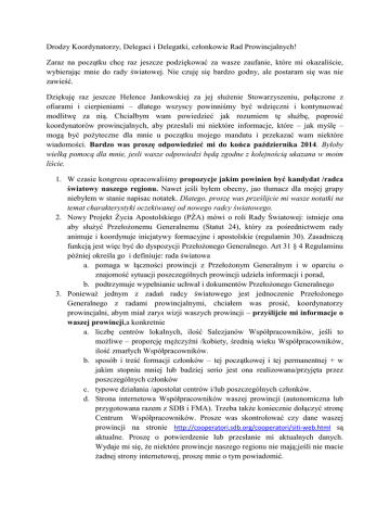 Drodzy Koordynatorzy, Delegaci i Delegatki, członkowie Rad Prowincjalnych! Zaraz na początku chcę raz jeszcze podziękować za wasze zaufanie, które mi okazaliście, wybierając mnie do rady światowej. Nie czuję się bardzo godny, ale postaram się was nie zawieść. Dziękuję raz jeszcze Helence Jankowskiej za jej służenie Stowarzyszeniu, połączone z ofiarami i cierpieniami – dlatego wszyscy powinniśmy być wdzięczni i kontynuować modlitwę za nią. Chciałbym wam powiedzieć jak rozumiem tę służbę, poprosić koordynatorów prowincjalnych, aby przesłali mi niektóre informacje, które – jak myślę – mogą być pożyteczne dla mnie u początku mojego mandatu i przekazać wam niektóre wiadomości. Bardzo was proszę odpowiedzieć mi do końca października 2014. Byłoby wielką pomocą dla mnie, jesli wasze odpowiedzi będą zgodne z kolejnością ukazana w moim liście. 1. W czasie kongresu opracowaliśmy propozycje jakim powinien być kandydat /radca światowy naszego regionu. Nawet jeśli byłem obecny, jao tłumacz dla mojej grupy niebyłem w stanie napisac notatek. Dlatego, proszę was prześlijcie mi wasze notatki na temat charakterystyki oczekiwanej od nowego radcy światowego. 2. Nowy Projekt Życia Apostolskiego (PŻA) mówi o roli Rady Światowej: istnieje ona aby służyć Przełożonemu Generalnemu (Statut 24), który za pośrednictwem rady animuje i koordynuje inicjatywy formacyjne i apostolskie (regulamin 30). Zasadniczą funkcją jest więc być do dyspozycji Przełożonego Generalnego. Art 31 § 4 Regulaminu później określa go i definiuje: rada światowa a. pomaga w łączności prowincji z Przełożonym Generalnym i w oparciu o znajomość sytuacji poszczególnych prowincji udziela informacji i porad, b. podtrzymuje wypełnianie uchwał i dokumentów Przełożonego Generalnego 3. Ponieważ jednym z zadań radcy światowego jest jednoczenie Przełożonego Generalnego z radami prowincjalnymi, chciałem was prosić, koordynatorzy prowincjalni, abym miał zarys wizji waszych prowincji – przyślijcie mi informacje o waszej prowincji,a konkretnie a. liczbę centrów lokalnych, ilość Salezjanów Współpracowników, jeśli to możliwe – proporcję mężczyźni /kobiety, średnią wieku Współpracowników, ilość zmarłych Współpracowników. b. sposób i treść formacji członków – tej początkowej i tej permanentnej + w jakim stopniu mniej lub badziej serio jest ona realizowana/przyjęta przez poszczególnych członków c. typowe działania /apostolat centrów i/lub poszczególnych członków. d. Strona internetowa Współpracowników waszej prowincji (autonomiczna lub przygotowana razem z SDB i FMA). Trzeba także koniecznie dołączyć stronę Centrum Współpracowników. Prosze was skontrolować czy dane waszej prowincji na stronie http://cooperatori.sdb.org/cooperatori/siti-web.html są aktualne. Proszę o potwierdzenie lub przesłanie mi aktualnych danych. Wydaje mi się, że niektóre prowincje naszego regionu nie mają;jeśli nie macie żadnej strony internetowej, proszę mnie o tym powiadomić. e. Jeżeli jako rada prowincjalna macie spotkania ze (wszystkimi?) radami lokalnymi lub w z większą ilością Współpracowników, gdzie ja mógłbym zobaczyć i poznać sytuację waszej rzeczywistości prowincjalnej, proszę was przyślijcie mi ewentualne daty i miejsca tych spotkań, zaplanowanych na następne 1-2 lata. f. Rok i miesiąc rozpoczęcia waszego mandatu w radzie prowincjalnej. g. Inne informacje, o których warto pamiętać. 4. Przełożony Generalny, wierny pierwotnej intencji ks. Bosko, w Bollettino Salesiano kieruje do członków Rodziny Salezajńskiej i do dobrodziejów swoje orędzie na aktualne tematy. Jestem przekonany, że przekazywanie jego informacji jest częścią mego służenia. Bardzo proszę o informację, czy orędzia Przełożonego Generalnego są tłumaczone w waszych językach i są udostępniane w waszej prowincji. Z czasem prześlę wam tekst orędzia z października – po włosku, po angielsku ( i po słowacku, jeśli wam posłuży). Zachęcam was, by znaleźć kogoś w waszej Prowincji, kto tłumaczyłby te przesłania – które łączą nas bezpośrednio z Przełożonym Generalnym, następcą ks. Bosko i przekazywać je do dyspozycji wszystkim Współpracownikom w procesie animacji i/lub formacji. 5. Bardzo mocnym momentem duchowym w życiu Rodziny Salezjańskiej są Dni Duchowości Rodziny Salezjańskiej. To wydarzenie, odbywa się w Domu Generalnym Salezjanów w Rzymie, regularnie w końcu trzeciego tygodnia miesiąca stycznia, od czwartku do niedzieli i zawsze w obecności Przełożonego Generalnego, Matki i wielu reprezentantów większości Grup Rodziny Salezjańskiej z całego świata. Temat jest ten sam co aktualnej Wiązanki. Możecie to zobaczyć w różnych językach na stronie http://gfs.sdb.org/it/index.html. Program jest zawsze bogaty w modlitwę, konferencje, dyskusje o tym, jak można wdrażać Wiązankę w różne rzeczywistości Rodziny Salezjańskiej w świecie. Następne Dni Duchowości odbędą się od 14 do 17 stycznia 2015. Ponieważ rada generalna SDB chce, aby w tych Dniach uczestniczyło możliwie jak najwięcej przedstawicieli róznych Grup Rodziny Salezjańskiej, którzy później przekażą swoim rodakom wartości przekazane i doświadczone, niestety ilośc miejsc jest ograniczona dla wszystkich Grup Rodziny Salezjańskiej. Dla Salezajnów Współpracowników naszego regionu oferuje się 5 miejsc. Ceny w Salesianum (w domu generalnym SDB): pokój jednoosobowy 320 Euro, pokój dwuoosobowy 260 Euro, w innym domu poza domem generalnym ( ale jest autobus, który dowozi wszystkich i nie jest opłacany oddzielnie): pokój jednoosobowy 300, dwuoosobowy 240. Pobyt i podróż opłaca prowincja, która wysyła swego reprezentanta. Chcę was prosić, abyście przemyśleli, czy są między wami osoby z umiejętnościami językowymi (trzeba znać dobrze włoski, angielski lub his