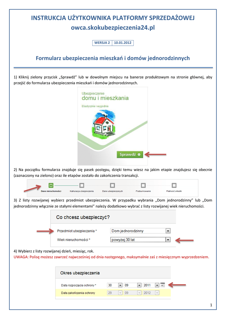 INSTRUKCJA UŻYTKOWNIKA PLATFORMY SPRZEDAŻOWEJ owca.skokubezpieczenia24.pl WERSJA 2 10.01.2012 Formularz ubezpieczenia mieszkań i domów jednorodzinnych 1) Kliknij zielony przycisk „Sprawdź” lub w dowolnym miejscu na banerze produktowym na stronie głównej, aby przejść do formularza ubezpieczenia mieszkań i domów jednorodzinnych. 2) Na początku formularza znajduje się pasek postępu, dzięki temu wiesz na jakim etapie znajdujesz się obecnie (zaznaczony na zielono) oraz ile etapów zostało do zakończenia transakcji. 3) Z listy rozwijanej wybierz przedmiot ubezpieczenia. W przypadku wybrania „Dom jednorodzinny” lub „Dom jednorodzinny włącznie ze stałymi elementami” należy dodatkowo wybrać z listy rozwijanej wiek nieruchomości. 4) Wybierz z listy rozwijanej dzień, miesiąc, rok. UWAGA: Polisę możesz zawrzeć najwcześniej od dnia następnego, maksymalnie zaś z miesięcznym wyprzedzeniem. 1 lub użyj kalendarza (kliknij na ikonę), a następnie wybierz datę. 5) Wybierz zakres ochrony (zaznacz). Przy ubezpieczeniu od pożaru i innych zdarzeń losowych, od kradzieży z włamaniem i rozboju oraz budynków gospodarczych, budowli i zewnętrznych elementów anten satelitarnych wpisz odpowiednie sumy ubezpieczenia. Przy ubezpieczeniach dodatkowych (dewastacja, OC, NNW, szyby) wybierz z listy rozwijanej sumę ubezpieczenia. Dodatkowo przy ubezpieczeniu NNW należy wybrać ilość osób, które mają zostać objęte ubezpieczeniem. 6) Zaznacz odpowiednie zabezpieczenia, jeżeli Klient je posiada. Za zabezpieczenia dodatkowe Klient otrzymuje zniżkę. 2 7) Dodatkowe informacje. Zaznacz, jeżeli w ubezpieczanej nieruchomości prowadzona jest działalność gospodarcza. Nie zaznaczaj jeżeli w nieruchomości wykonywany jest zawód: prawnika, tłumacza, pośrednika ubezpieczeniowego, doradcy podatkowego, doradcy finansowego, księgowego, biegłego rewidenta, rzeczoznawcy oraz każdego innego zawodu mającego charakter pracy biurowej. Zaznacz jeżeli mieszkanie znajduje się na parterze. W przypadku domu jednorodzinnego wybierz rodzaj konstrukcji. 8) Wybierz 1 z 5 opcji dotyczących historii ubezpieczenia. UWAGA: Klient, który w ciągu ostatnich 5 lat miał szkodę powodziową lub w ciągu ostatnich 12 miesięcy miał 3 i więcej szkód innego rodzaju nie może zawrzeć ubezpieczenia w TUW SKOK. 9) Jeżeli Klient-ubezpieczony jest Członkiem SKOK zaznacz, a następnie z listy rozwijanej wybierz nazwę SKOK. Jeżeli Klient posiada kupon promocyjny z kodem, wpisz go w pole „kod promocyjny”. 10) Aby poznać składkę kliknij . Na końcu formularza jest opcja „Anuluj”. Kliknięcie spowoduje wyczyszczenie wszystkich pól formularza. 3 UWAGA: Warto raz na jakiś czas użyć opcji „Anuluj”, aby odświeżyć formularz oraz oczyścić z dużej ilości zapisanych danych. Możesz również zapisać kalkulację poprzez kliknięcie „Zapisz”. Wpisz dane Klienta, aby ułatwić sobie wyszukiwanie kalkulacji w późniejszym terminie. UWAGA: Można zapisać kalkulację, ale nie można zapisać formularza z wypełnionymi danymi Klienta (czyli po 3 etapie i dalszych). Opcja jest celowo niedostępna, ponieważ gwarantuje aktualizację oferty ubezpieczenia (np. nie ma możliwości ubezpieczenia wg nieaktualnej taryfy – kalkulacja została zapisana miesiąc temu, a w międzyczasie zmieniono taryfę składek – w takim przypadku składka ulega ponownemu przeliczeniu i może się zmienić). Aplikacja nie udostępnia tej opcji również z uwagi na ochronę danych osobowych, nie możemy przechowywać danych Klienta, jeżeli nie zawarł umowy lub nie podpisał zgody na ich przetwarzanie. Po wpisaniu danych Klienta kliknij „Zapisz”. Jeżeli zmienisz decyzję i nie chcesz zapisywać tej kalkulacji, kliknij „Anuluj”. UWAGA: Kalkulacje nie są kasowane z systemu! Możesz do nich wrócić po bardzo długim czasie, ale masz również możliwość usunięcia wybranej kalkulacji. Po zapisaniu kalkulacji na górze strony wyświetla się informacja potwierdzająca zapisanie. UWAGA: Aby wrócić do zapisanej kalkulacji, kliknij na zielonym pasku u góry „Kalkulacje”. 11) Aby otworzyć, zapisać lub wydrukować dokumenty, kliknij na ikonę przed nazwą dokumentu. 4 12) Kolejny krok formularza - podsumowanie. Na tym kroku zebrano przedmioty, sumy ubezpieczenia oraz zaprezentowano składkę za dane ryzyko. Na tym etapie jest tylko informacja o wysokości składki w przypadku płatności jednorazowej lub w ratach, podziału rat oraz terminów płatności. Dodatkowo możesz zasugerować Klientowi, że płacąc jednorazowo zaoszczędzi – w porównaniu do płatności ratalnej. Po kliknięciu na „rat:2” zobaczysz składkę w rozbiciu na ryzyka przy płatności ratalnej. UWAGA: Na tym kroku nie wybierasz jeszcze sposobu płatności składki. 13) Zaznacz oświadczenie, że Klient otrzymał i akceptuje OWU. Możesz otworzyć, zapisać lub wydrukować OWU – kliknij ikonę pliku pdf. 14) Aby przejść do kolejnego etapu kliknij . UWAGA: Kliknięcie „Kup teraz” nie powoduje jeszcze rejestracji wniosku, zobligowania do zawarcia umowy i opłacenia składki. Po kliknięciu „Wstecz” zostaniesz przeniesiony do poprzedniego etapu formularza. Po kliknięciu „Drukuj” otwiera się plik z kalkulacją składki, który można wydrukować lub zapisać. Po kliknięciu „Anuluj” i „Zapisz” – analogicznie jak w puncie 10) str. 3-4 5 15) Wprowadź dane ubezpieczającego – osoby zawierającej ubezpieczenie (podpisującej wniosek i płacącej składkę). UWAGA: WPISZ KOD POCZTOWY, NAZWA MIEJSCOWOŚCI ZOSTANIE ZACZYTANA AUTOMATYCZNIE Z BAZY DANYCH 16) Wprowadź dane ubezpieczonego – właściciela mienia. Jeżeli ubezpieczający = ubezpieczony, zaznacz „Takie same jak ubezpieczającego”. Pola automatycznie zostaną uzupełnione danymi, które wprowadzono wyżej. Jeżeli mienie jest własnością więcej niż jednej osoby, zaznacz „Dodaj współwłaścicieli”, a następni
