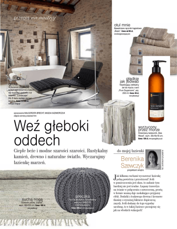 przepis na nastrój otul mnie Bawełniane ręczniki kąpielowe „Basic”. Cena: od 95 zł, www.lexingtoncompany.com gładkie jak jedwab grota Nawilżający delikatny żel do mycia z serii „Pure Sugarcane”, poj. 250 ml. Cena: 46 zł, www phenome.pl W łazience urządzonej w stylu spa powinno znaleźć się wygodne siedzisko lub leżanka. „Landscape” B& B Italia wydaje się być idealna. Cena: 12 000 zł, www.space-design.pl opracowanie MAŁGORZATA BRECHT, MAGDA KAZIMIERCZUK zdjęcia serwisy prasowe firm Weź głeboki oddech wyrzucony przez morze Ciepłe beże i modne szarości szarości. Rustykalny kamień, drewno i naturalne światło. Wyczarujmy łazienkę marzeń. do mojej łazienki Berenika Szewczyk projektant wnętrz J suchą nogą Dywanik jutowy „Kjersti”, wym. 60x100 cm. Cena: 160 zł, www.norddeco.pl piłeczka Puf do siedzenia, bawełniana włóczka, BROSTE COPENHAGEN. Cena: 509 zł, www.squarespace.pl fot. archiwum prywatne Drewniany świecznik „Sea Wood”, wym. 30x16x16 cm. Cena: 130 zł, www.oystergallery.co.uk ak kilkoma ruchami wyczarować łazienkę pełną powietrza i przestrzeni? Jeśli w pomieszczeniu jest okno, to zadanie tym bardziej nie jest trudne. Łupany trawertyn na ścianie w połączeniu z nowoczesną, prostą w formie wanną daje zaskakująco przyjazny efekt. Dodatki z teakowego drewna i kremowe tkaniny o wyraźnej fakturze dopieszczą zmysły. Jeśli dodamy do tego wygodny szezlong, to w takiej łazience poczujemy się jak na włoskich wakacjach!