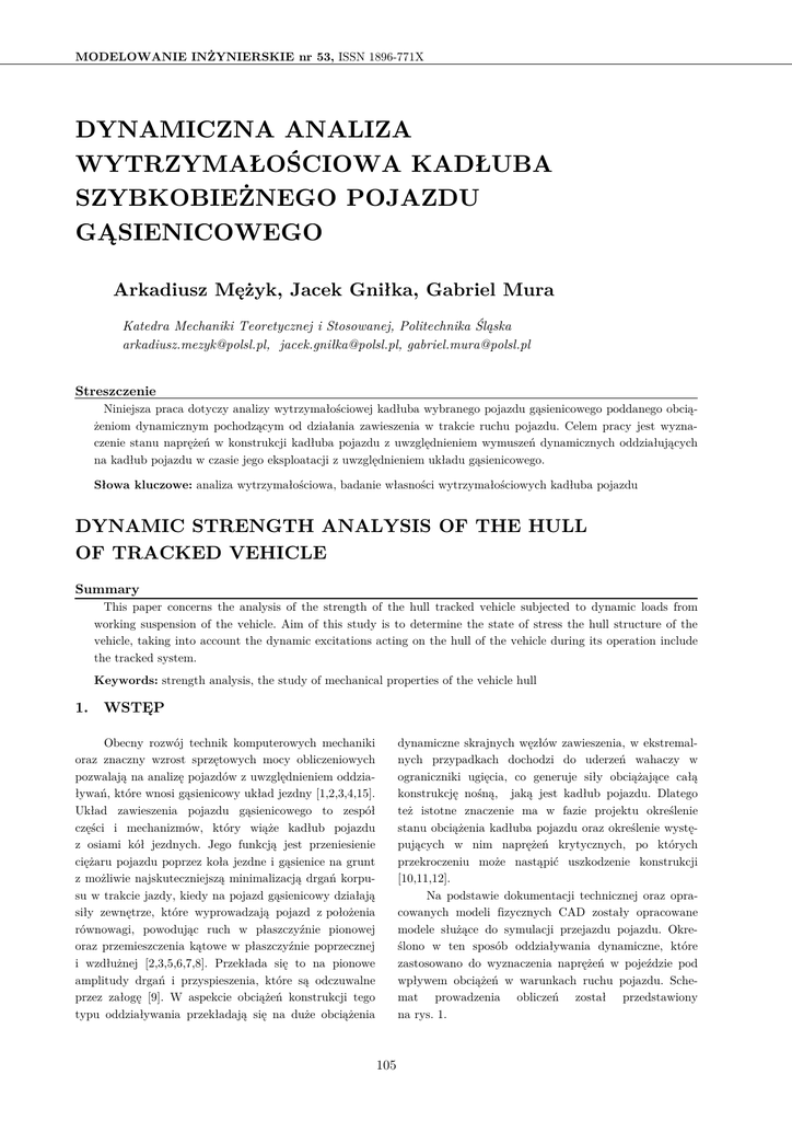 MODELOWANIE INŻYNIERSKIE nr 53, ISSN 1896-771X DYNAMICZNA ANALIZA WYTRZYMAŁOŚCIOWA KADŁUBA SZYBKOBIEŻNEGO POJAZDU GĄSIENICOWEGO Arkadiusz Mężyk, Jacek Gniłka, Gabriel Mura Katedra Mechaniki Teoretycznej i Stosowanej, Politechnika Śląska [email protected], jacek.gnił[email protected], [email protected] Streszczenie Niniejsza praca dotyczy analizy wytrzymałościowej kadłuba wybranego pojazdu gąsienicowego poddanego obciążeniom dynamicznym pochodzącym od działania zawieszenia w trakcie ruchu pojazdu. Celem pracy jest wyznaczenie stanu naprężeń w konstrukcji kadłuba pojazdu z uwzględnieniem wymuszeń dynamicznych oddziałujących na kadłub pojazdu w czasie jego eksploatacji z uwzględnieniem układu gąsienicowego. Słowa kluczowe: analiza wytrzymałościowa, badanie własności wytrzymałościowych kadłuba pojazdu DYNAMIC STRENGTH ANALYSIS OF THE HULL OF TRACKED VEHICLE Summary This paper concerns the analysis of the strength of the hull tracked vehicle subjected to dynamic loads from working suspension of the vehicle. Aim of this study is to determine the state of stress the hull structure of the vehicle, taking into account the dynamic excitations acting on the hull of the vehicle during its operation include the tracked system. Keywords: strength analysis, the study of mechanical properties of the vehicle hull 1. WSTĘP Obecny rozwój technik komputerowych mechaniki oraz znaczny wzrost sprzętowych mocy obliczeniowych pozwalają na analizę pojazdów z uwzględnieniem oddziaływań, które wnosi gąsienicowy układ jezdny [1,2,3,4,15]. Układ zawieszenia pojazdu gąsienicowego to zespół części i mechanizmów, który wiąże kadłub pojazdu z osiami kół jezdnych. Jego funkcją jest przeniesienie ciężaru pojazdu poprzez koła jezdne i gąsienice na grunt z możliwie najskuteczniejszą minimalizacją drgań korpusu w trakcie jazdy, kiedy na pojazd gąsienicowy działają siły zewnętrze, które wyprowadzają pojazd z położenia równowagi, powodując ruch w płaszczyźnie pionowej oraz przemieszczenia kątowe w płaszczyźnie poprzecznej i wzdłużnej [2,3,5,6,7,8]. Przekłada się to na pionowe amplitudy drgań i przyspieszenia, które są odczuwalne przez załogę [9]. W aspekcie obciążeń konstrukcji tego typu oddziaływania przekładają się na duże obciążenia dynamiczne skrajnych węzłów zawieszenia, w ekstremalnych przypadkach dochodzi do uderzeń wahaczy w ograniczniki ugięcia, co generuje siły obciążające całą konstrukcję nośną, jaką jest kadłub pojazdu. Dlatego też istotne znaczenie ma w fazie projektu określenie stanu obciążenia kadłuba pojazdu oraz określenie występujących w nim naprężeń krytycznych, po których przekroczeniu może nastąpić uszkodzenie konstrukcji [10,11,12]. Na podstawie dokumentacji technicznej oraz opracowanych modeli fizycznych CAD zostały opracowane modele służące do symulacji przejazdu pojazdu. Określono w ten sposób oddziaływania dynamiczne, które zastosowano do wyznaczenia naprężeń w pojeździe pod wpływem obciążeń w warunkach ruchu pojazdu. Schemat prowadzenia obliczeń został przedstawiony na rys. 1. 105 DYNAMICZNA ANALIZA WYTRZYMAŁOŚCIOWA KADŁUBA SZYBKOBIEŻNEGO… SZYBKOBIEŻNEGO model do symulacji dynamiki układów wieloczłonowych model do dynamicznej analizy wytrzymałościowej symulacja przejazdu pojazdu po zadanym terenie dynamiczna analiza wytrzymałościowa kadłuba, oś Y położona jest w osi koła napędowego pojazdu, natomiast kierunek osi Z jest zgodny z kierunkieru kiem działania grawitacji. określenie naprężeń krytycznych oraz miejsc ich występowania w pojeździe wartości sił i momentów sił działających na węzły zawieszenia w czasie Rys. 1 Schemat prowadzenia obliczeń Rys. 2 Orientacja globalnego układu współrzędnych współrzę kadłuba 2. MODEL FIZYCZNY ZASTOSOWANY DO SYMULACJI DYNAMICZNEJ RUCHU POJAZDU Tabela 2 Parametry masowe kadłuba masa [kg] 35020,0 Położenie środka masy względem globalnego układu współrzędnych (osi obrotu koła napędowego) [mm] Symulacja przejazdu po wybranej przeszkodzie przeszkod terenowej została wykonana na podstawie metody m układów wieloczłonowych zaimplementowana w programie MSC Adams. Pojazd zamodelowany w programie został podzielony na elementy zestawione w tabeli 1. Elementy połączono ze sobą parami kinematycznymi, inematycznymi, za pomocą których odwzorowano więzy i kinematykę układu [15]. Symulacje przeprowadzono dla parametrów modelu odpowiadających masie bojowej pojazdu jazdu wraz z załogą 42600,4 [kg]. x -2631 y 0 z 370 Składowe tensora masowego momentu bezwładności względem środka masy [ kg*m2] Ixx 66643 Iyy 146315 Izz 207457 Model koła napinającego y z x Tabela 1 Masy podzespołów modelu l. szt. Masa 1 szt. [kg] kadłub z wieżą 1 ~35020 ~35020 koło napędowe 2 193,5 387 koło napinające 2 90 180 koło jezdne 12 102,8 1233,6 łącznik 6 5 wahacz 12 ramie tłumika rolka Nazwa podzespołu ogniwo gąsienicy łączna masa [kg] Rys. 3 Orientacja globalnego układu współrzędnych koła napinającego Tabela 3 Parametry masowe koła napinającego masa [kg] 90 Położenie środka masy x -5540 30 względem globalnego układu y -1445 59 708 współrzędnych [mm] z 50 6 8,5 51 6 31,8 190,8 25 4800 192 Składowe tensora masowego momentu bezwładności względem środka masy [ kg*m2] Ixx 42600,4 1,996 Iyy 3,2741 Izz 1,996 Model koła napędowego W pierwszym etapie budowa udowa modelu pojazdu gąsiegąsi nicowego opiera się na zdefiniowaniu własności geomegeom trycznych, masowych oraz bezwładnościowych brył nieodkształcalnych stanowiących analizowany układ kinematyczny. Poniżej zestawiono parametry wybranych elementów wraz z zobrazowaniem postaci geometryczgeometryc nych oraz zestawieniem parametrów masowych (rys. 2-5, tabela 2-5). y z x Rys. 4 Orientacja globalnego układu współrzędnych koła napędowego Model kadłuba nast Układ współrzędnych zd