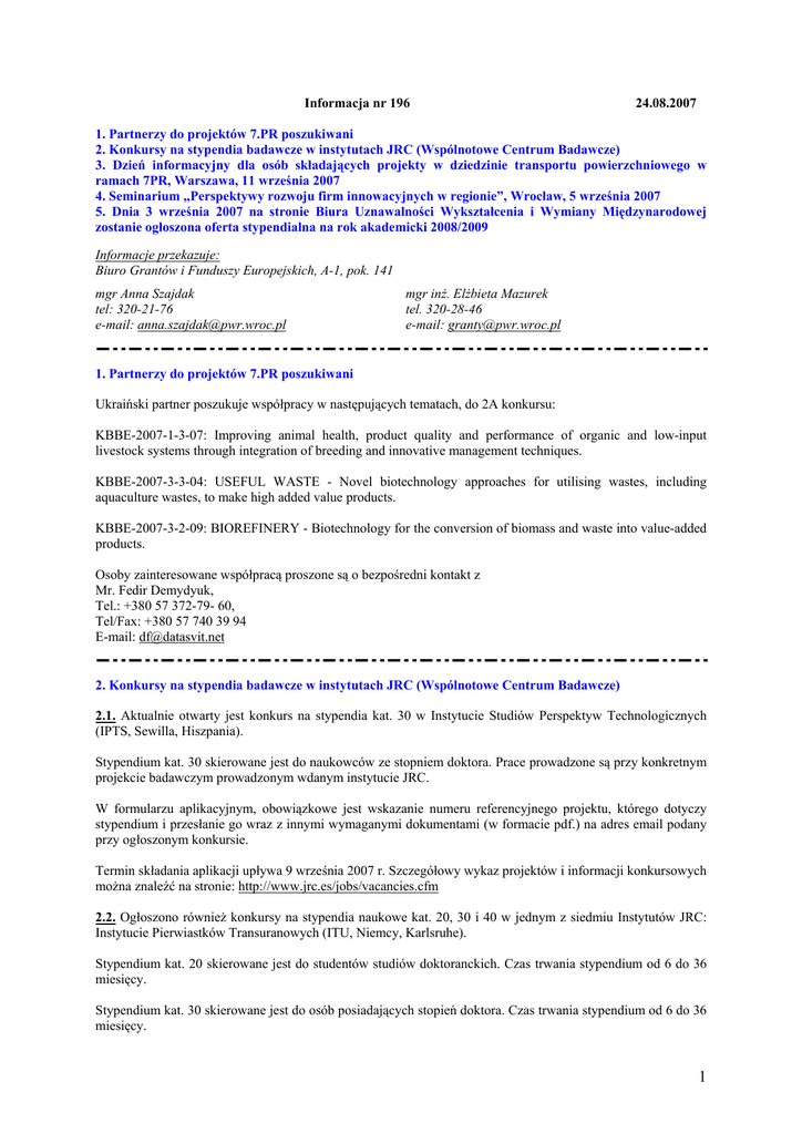 Informacja nr 196 24.08.2007 1. Partnerzy do projektów 7.PR