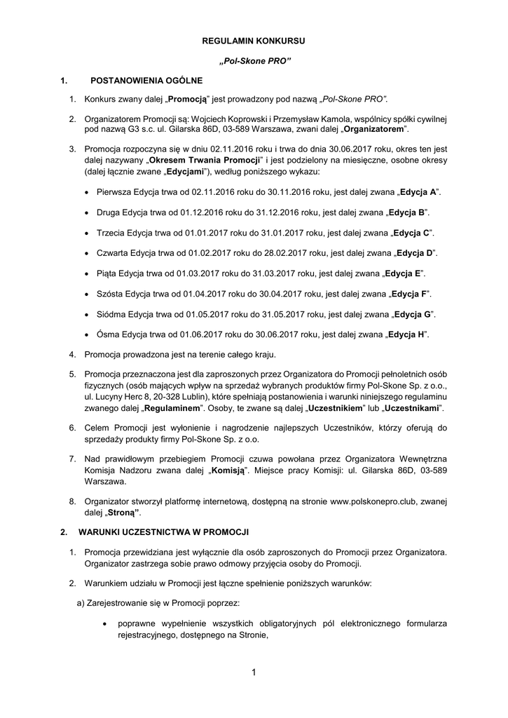 REGULAMIN KONKURSU „Pol-Skone PRO” 1. POSTANOWIENIA OGÓLNE 1. Konkurs zwany dalej „Promocją” jest prowadzony pod nazwą „Pol-Skone PRO”. 2. Organizatorem Promocji są: Wojciech Koprowski i Przemysław Kamola, wspólnicy spółki cywilnej pod nazwą G3 s.c. ul. Gilarska 86D, 03-589 Warszawa, zwani dalej „Organizatorem”. 3. Promocja rozpoczyna się w dniu 02.11.2016 roku i trwa do dnia 30.06.2017 roku, okres ten jest dalej nazywany „Okresem Trwania Promocji” i jest podzielony na miesięczne, osobne okresy (dalej łącznie zwane „Edycjami”), według poniższego wykazu: Pierwsza Edycja trwa od 02.11.2016 roku do 30.11.2016 roku, jest dalej zwana „Edycja A”. Druga Edycja trwa od 01.12.2016 roku do 31.12.2016 roku, jest dalej zwana „Edycja B”. Trzecia Edycja trwa od 01.01.2017 roku do 31.01.2017 roku, jest dalej zwana „Edycja C”. Czwarta Edycja trwa od 01.02.2017 roku do 28.02.2017 roku, jest dalej zwana „Edycja D”. Piąta Edycja trwa od 01.03.2017 roku do 31.03.2017 roku, jest dalej zwana „Edycja E”. Szósta Edycja trwa od 01.04.2017 roku do 30.04.2017 roku, jest dalej zwana „Edycja F”. Siódma Edycja trwa od 01.05.2017 roku do 31.05.2017 roku, jest dalej zwana „Edycja G”. Ósma Edycja trwa od 01.06.2017 roku do 30.06.2017 roku, jest dalej zwana „Edycja H”. 4. Promocja prowadzona jest na terenie całego kraju. 5. Promocja przeznaczona jest dla zaproszonych przez Organizatora do Promocji pełnoletnich osób fizycznych (osób mających wpływ na sprzedaż wybranych produktów firmy Pol-Skone Sp. z o.o., ul. Lucyny Herc 8, 20-328 Lublin), które spełniają postanowienia i warunki niniejszego regulaminu zwanego dalej „Regulaminem”. Osoby, te zwane są dalej „Uczestnikiem” lub „Uczestnikami”. 6. Celem Promocji jest wyłonienie i nagrodzenie najlepszych Uczestników, którzy oferują do sprzedaży produkty firmy Pol-Skone Sp. z o.o. 7. Nad prawidłowym przebiegiem Promocji czuwa powołana przez Organizatora Wewnętrzna Komisja Nadzoru zwana dalej „Komisją”. Miejsce pracy Komisji: ul. Gilarska 86D, 03-589 Warszawa. 8. Organizator stworzył platformę internetową, dostępną na stronie www.polskonepro.club, zwanej dalej „Stroną”. 2. WARUNKI UCZESTNICTWA W PROMOCJI 1. Promocja przewidziana jest wyłącznie dla osób zaproszonych do Promocji przez Organizatora. Organizator zastrzega sobie prawo odmowy przyjęcia osoby do Promocji. 2. Warunkiem udziału w Promocji jest łączne spełnienie poniższych warunków: a) Zarejestrowanie się w Promocji poprzez: poprawne wypełnienie wszystkich obligatoryjnych pól elektronicznego formularza rejestracyjnego, dostępnego na Stronie, 1 otrzymanie drogą mailową (na adres e-mail podany w elektronicznym formularzu rejestracyjnym) akceptacji uczestnictwa danej osoby w Promocji, wysłanej przez Organizatora. Termin weryfikacji zgłoszenia przez Organizatora wynosi maksymalnie 7 dni. poprawne wypełnienie wszystkich obligatoryjnych pól papierowego formularza rejestracyjnego, dostępnego do wydruku na Stronie (wymagany jest podpis osoby ubiegającej się o uczestnictwo w Promocji oraz właściciela firmy, której osoba ubiegająca się o uczestnictwo jest pracownikiem). Formularze bez obu podpisów będą odrzucane, a rejestracja anulowana. wysłanie, poprawnie wypełnionego, papierowego formularza rejestracyjnego na adres Organizatora. Po spełnieniu powyższych wymagań osoba ta ma zakładane przez Organizatora indywidualne konto punktowe (zwane dalej „Kontem”), do którego otrzymuje hasło wysłane wiadomością SMS, na numer podany w formularzu rejestracyjnym - od tej pory Uczestnikowi naliczane są punkty. Otrzymuje kartę przedpłaconą wysłaną przez Organizatora na adres podany w papierowym formularzy rejestracyjnym, w ciągu 7 dni roboczych od daty dostarczenia formularza rejestracyjnego. b) Akceptacja warunków i zasad użytkowania otrzymanych kart przedpłaconych (zwanych dalej „Kartami”). 3. NAGRODY 1. Nagrodami w Promocji są zasilenia Kart środkami pieniężnymi wynikającymi z dalszych postanowień Regulaminu. 2. Uczestnik jest zobowiązany do zapoznania się z regulaminem Kart (dołączonym do Karty). Uczestnik jest zobowiązany do korzystania z Kart zgodnie z regulaminem Kart. Wypłata pieniędzy z bankomatów obciążana jest opłatą określoną w regulaminie Kart. 3. Zasilenia Kart środkami pieniężnymi są dalej zwane „Nagrodą” lub „Nagrodami”. 4. ZASADY FUNKCJONOWANIA PROMOCJI 1. Zadanie konkursowe (zwane dalej „Zadaniem”) polega na zajęciu możliwie najlepszego miejsca w rankingu Uczestników, zwanego dalej „Rankingiem”. Ilość nagradzanych miejsc w Rankingu jest ograniczona do 3000 Uczestników. Uczestnik ma wpływ na realizację Zadania poprzez swoje zaangażowanie i wiedzę na temat produktów objętych Promocją (dalej zwanych „Produktami”). Aktualny wykaz produktów objętych Promocją stanowi załącznik nr 1 do Regulaminu. 2. Każdy grupa Produktów lub Produkt ma przypisaną ilość punktów (zwanych dalej „Punktami”), informacja o ilości Punktów przypisanych do danej grupy Produktów lub Produktów znajduje się w załączniku nr 2 do Regulaminu. 3. Organizator tworzy osobny Ranking dla każdej Edycji, zgodnie z terminami zawartymi w pkt 1.3. Regulaminu. 4. O miejscu Uczestnika w danym Rankingu decyduje ilość zdobytych Punktów. Najwyższe miejsce w Rankingu ma Uczestnik, który zdobył największą ilość Punktów w danej Edycji. W przypadku, kiedy więcej niż jeden Uczestnik ma tą samą ilość Punktów, o wyższym miejscu w Rankingu decyduje większa ilość Produktów przypisanych do danego Uczestnika za poniższe Produkty (przypisane zgodnie z pkt. 4.5. Regulaminu): 2 w pierwszej kolejności uwzględniona jest największa ilość Punktów za Produkty „C30 w fornirach”, w przypadku dalszego braku możliwości przypisania do danego miejsca jednego Uczestnika brane są pod uwagę dalsze wytyczne, w nast