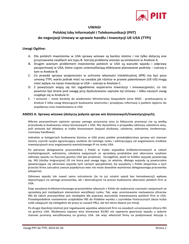 UWAGI Polskiej Izby Informatyki i Telekomunikacji (PIIT) do negocjacji Umowy w sprawie handlu i inwestycji UE-USA (TTPI) Uwagi Ogólne: A. Dla polskich inwestorów w USA sprawy wizowe są bardzo istotne i nie tylko dotyczą one przyznawania zwykłych wiz typu B. Szerzej problemy wizowe są omówione w Aneksie A. B. Drugim ważnym problemem inwestorów polskich w USA są warunki wjazdu i odprawy paszportowej w USA, które często uniemożliwiają efektywne planowanie podróży – szerzej o tym w Aneksie B. C. Co prawda sprawa wzajemności w ochronie własności intelektualnej (IPR) ma być poza umową TTPI, warto jednak mieć na uwadze jak różnice w prawie patentowym (UE-US) mogą mieć wpływ na nasze inwestycje w USA – szerzej w Aneksie C. D. Z powyższym wiążą się też zagadnienia wspierania inwestycji i innowacyjności, co też powinno być brane pod uwagę przy dyskutowaniu zapisów tej Umowy – kilka naszych uwag znajduje się w Aneksie D. E. I wreszcie – może bardziej do wiadomości Ministerstwa Gospodarki (oraz MSZ) - przekazujemy w Aneksie E kilka uwag dotyczących budowania wizerunku i przepływu informacji o polskim dążeniu do współpracy oraz inwestowania w USA. ANEKS A. Sprawy wizowe (dotyczy jedynie spraw wiz biznesowych/inwestycyjnych). Wbrew powszechnym opiniom sprawy samego przyznania wizy (a faktycznie promesy) nie są wielką przeszkodą w budowaniu relacji biznesowych z USA. Nie słyszeliśmy o przypadku odmowy udzielenia wizy, jeśli wniosek był składany w trybie biznesowym (wyjazd służbowy, szkolenie, wdrożenie, konferencje, rozmowy handlowe). Jednakże w kategoriach budowania biznesu w USA przez polskie przedsiębiorstwa sprawa wiz stanowi istotny czynnik ryzyka ograniczający zaufanie do tamtego rynku i odstręczający od angażowania środków inwestycyjnych oraz angażowania wartościowego IP na rynku USA. Po pierwsze delegowanie pracowników z Polski w trybie wyjazdów krótkoterminowych w celach marketingowych, wdrożenia, szkolenia związanych ze sprzedażą produktów jest obarczone ryzykiem odmowy wjazdu na fizycznej granicy USA (po przylocie). Szczególnie, jeżeli te krótkie wyjazdy powtarzają się. INS (służby imigracyjne) US nie biorą pod uwagę tego, że właśnie, dlatego wyjazdy są powtarzalne (powtarzające się okresowe wyjazdy tych samych specjalistów), bo wysyłamy z Polski ekspertów a tych przecież firma zatrudnia zawsze pojedynczo wiec nie może dowolnie wymieniać delegowanego pracownika (eksperta). Odmowa wjazdu lub nawet samo ostrzeżenie (że to już ostatni wjazd bez konsekwencji) wpływa deprymująco na samego pracownika, ale i destrukcyjnie na proces budowania obecności polskich firm w USA. Etap wysyłania krótkoterminowego pracowników własnych z Polski do wykonania czynności związanych ze sprzedażą jest niezbędnym elementem weryfikacji rynku. Tak, więc unormowanie nastawienia oficerów INS do takich pracowników jest niezbędne dla poprawy warunków inwestowania polskich firm w USA. Prawdopodobnie nastawienie urzędników INS do Polaków wynika z czynników historycznych (duża liczba osób udających się nielegalnie do pracy w czasach PRL), ale ten okres dawno już minął. Po drugie (bardziej istotne) jest regulowanie wjazdów właścicieli firm na zasadach uznaniowości oficera INS na granicy USA. Wydawana typowa wiza biznesowa B1/B2 nie zapewnia gwarancji wjazdu a jedynie stanowi promesę weryfikowaną na granicy USA. Jak więc właściciel firmy na podejmować decyzje o Uwagi PIIT do TTPI, 2014-01-26 Strona 1 ulokowaniu środków własnych lub co jeszcze trudniejsze pochodzących z finansowania dłużnego w USA, jeżeli arbitralną decyzją na granicy może zostać odcięty od możliwości zarządzania tymi środkami? Brak swobody przemieszczania się dla właścicieli jest, więc istotną barierą psychologiczną przy podejmowaniu decyzji inwestycyjnych. Powyższe punkty dotyczą przypadków korzystania w wiz biznesowych typu B1/B2 (najprostszych). Jednak na początku drogi inwestycyjne oraz na początku budowania obecności firmy na rynku USA tylko takie wizy wchodzą w rachubę dopóki nie ma formalnej struktury firmy w USA. Dopiero potem można teoretycznie starać się o wizy pobytowe dla specjalistów (typ H) . Jednak takie wizy z kolei obarczone są kontyngentami (ograniczanie liczby wydanych wiz w roku). Także rozwiązanie w postaci wiz managerskich (typ L) nie jest możliwe do zastosowania w pierwszym okresie budowania struktury firmy. Powyższe uwagi dotyczą przede wszystkim branży ICT gdzie często okres oczekiwania na wydanie wizy specjalistycznej (H) czy managerskiej (L) wyczerpuje czas życia produktu lub usługi o charakterze innowacyjnym. Nie oznacza to, że firmy ICT byłyby inwestorami krótkoterminowymi. Jednak czas budowania struktury biznesowej w USA nie może ze względu na procedury wizowe (wizy H, L, E) być dłuższy od czasu życia jednego produktu, bo uniemożliwia wdrożenie kolejnych rozwiązań. (Nakładanie krzywych czasu życia produktów i usług) W ICT czas życia produktu liczy się w miesiącach a nie latach jak w innych typach przemysłu. Podsumowanie problematyki wizowej: Wskazane jest wypracowanie oraz wprowadzenie w życie rozwiązania wizowego dla innowacyjnych firm z branży teleinformatycznej, które umożliwią: • • bezpieczne delegowanie specjalistów (technologicznych i biznesowych) w początkowym okresie bezpośrednio z Polski na krótkie okresy (np. do 6 , 12 , 18 miesięcy) w celu weryfikacji rynku oraz budowania struktury biznesowej. bezpieczne podróżowanie właścicieli firm (inwestorów) w celu zarzadzania swoim majątkiem oraz firmą. Istniejące rozwiązania (wiza E) maja ograniczenia wysokości inwestycji nieprzystające do realiów w branży ICT. Wymóg inwestycji kwot na poziomie milionów dolarów jest niepasujący do tej branży gdzie firmy tworzy się często bez nakładowo, lub podstawowym wkładem jest wartość IP przenos