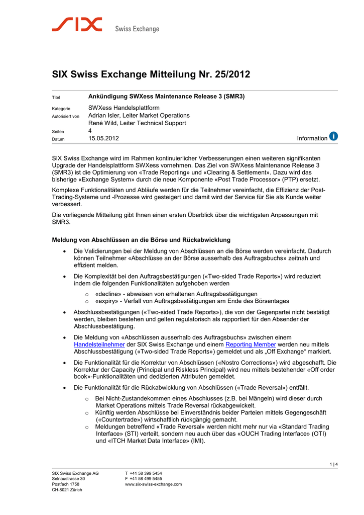SIX Swiss Exchange Mitteilung Nr. 25/2012 Titel Ankündigung SWXess Maintenance Release 3 (SMR3) Kategorie SWXess Handelsplattform Adrian Isler, Leiter Market Operations René Wild, Leiter Technical Support 4 15.05.2012 Autorisiert von Seiten Datum Information SIX Swiss Exchange wird im Rahmen kontinuierlicher Verbesserungen einen weiteren signifikanten Upgrade der Handelsplattform SWXess vornehmen. Das Ziel von SWXess Maintenance Release 3 (SMR3) ist die Optimierung von «Trade Reporting» und «Clearing & Settlement». Dazu wird das bisherige «Exchange System» durch die neue Komponente «Post Trade Processor» (PTP) ersetzt. Komplexe Funktionalitäten und Abläufe werden für die Teilnehmer vereinfacht, die Effizienz der PostTrading-Systeme und -Prozesse wird gesteigert und damit wird der Service für Sie als Kunde weiter verbessert. Die vorliegende Mitteilung gibt Ihnen einen ersten Überblick über die wichtigsten Anpassungen mit SMR3. Meldung von Abschlüssen an die Börse und Rückabwicklung Die Validierungen bei der Meldung von Abschlüssen an die Börse werden vereinfacht. Dadurch können Teilnehmer «Abschlüsse an der Börse ausserhalb des Auftragsbuchs» zeitnah und effizient melden. Die Komplexität bei den Auftragsbestätigungen («Two-sided Trade Reports») wird reduziert indem die folgenden Funktionalitäten aufgehoben werden o o «decline» - abweisen von erhaltenen Auftragsbestätigungen «expiry» - Verfall von Auftragsbestätigungen am Ende des Börsentages Abschlussbestätigungen («Two-sided Trade Reports»), die von der Gegenpartei nicht bestätigt werden, bleiben bestehen und gelten regulatorisch als rapportiert für den Absender der Abschlussbestätigung. Die Meldung von «Abschlüssen ausserhalb des Auftragsbuchs» zwischen einem Handelsteilnehmer der SIX Swiss Exchange und einem Reporting Member werden neu mittels Abschlussbestätigung («Two-sided Trade Reports») gemeldet und als „Off Exchange“ markiert. Die Funktionalität für die Korrektur von Abschlüssen («Nostro Corrections») wird abgeschafft. Die Korrektur der Capacity (Principal und Riskless Principal) wird neu mittels bestehender «Off order book»-Funktionalitäten und dedizierten Attributen gemeldet. Die Funktionalität für die Rückabwicklung von Abschlüssen («Trade Reversal») entfällt. o o o Bei Nicht-Zustandekommen eines Abschlusses (z.B. bei Mängeln) wird dieser durch Market Operations mittels Trade Reversal rückabgewickelt. Künftig werden Abschlüsse bei Einverständnis beider Parteien mittels Gegengeschäft («Countertrade») wirtschaftlich rückgängig gemacht. Meldungen betreffend «Trade Reversal» werden nicht mehr nur via «Standard Trading Interface» (STI) verteilt, sondern neu auch über das «OUCH Trading Interface» (OTI) und «ITCH Market Data Interface» (IMI). 1|4 SIX Swiss Exchange AG Selnaustrasse 30 Postfach 1758 CH-8021 Zürich T +41 58 399 5454 F +41 58 499 5455 www.six-swiss-exchange.com SIX Swiss Exchange Mitteilung Nr. 25/2012 15.05.2012 Das Konzept der «Trade Type Codes» wird aufgehoben. Für die Meldung von speziellen Geschäftsfällen werden dedizierte Attribute eingeführt. «Delivery Report» für die regulatorische Erfüllung der Meldepflicht bleibt bestehen, allerdings wird kein Settlement mehr instruiert. Die Meldung von Transaction Reports via «Standard Trading Interface» (STI) wird abgeschafft. Transaction Reports werden zukünftig via dem bestehenden Reporting Tool oder Transaction Interface rapportiert. «Abschlüsse ausserhalb des Auftragsbuchs» werden – sofern die Anforderungen erfüllt sind nicht mehr standardmässig verzögert publiziert. Neu können Teilnehmer die verzögerte Publikation des Abschlusses mittels Attribut instruieren. Markt- und Referenzdaten Referenzpreisanpassungen aufgrund von Mutationen der Stammdaten (Dividende, Price Step etc.) erfolgen zu Beginn des Börsentages (06:00 CET) statt wie bisher kurz vor Ende des Börsentages (22:00 CET). Automatische Referenzpreisanpassungen aufgrund der Stornierung von Abschlüssen oder weil keine börslichen Abschlüsse stattgefunden haben (Closing Inside Market), werden kurz nach Handelsschluss (17:30 CET) durchgeführt. Zusätzlich zum bisherigen «Recapitulation File» werden statistische Marktdaten (VWAP, Day High/Low etc.) auch über einen neuen dedizierten Kanal via «Market Data Interface» (MDI) verteilt Für die Überprüfung der Abschlüsse an der Börse wird den Teilnehmern neu täglich ein «Trade Reconciliation Report» zur Verfügung gestellt. Instrumente werden einem «Trading Segment» und «Clearing Settlement Segment» zugewiesen. Diese Attribute sind neu im «Reference Data Interface» (RDI) verfügbar. Auf die Publikation eines täglichen Change Fix wird verzichtet, da innerhalb SWXess keine Umrechnungen für Clearing & Settlement mehr erforderlich sind. Clearing & Settlement Das Routing von Clearing & Settlement Instruktionen kann zukünftig über folgende Attribute der Aufträge gesteuert werden: o o o Participant ID Instrument (welches einem Clearing & Settlement Segment zugeordnet ist) Order Capacity (Principal und Riskless Principal) Alle anderen Attribute für das Routing der Instruktionen entfallen. Probleme mit Clearing & Settlement Validierungen führen nicht mehr zur Rückweisung von «Abschlüssen ausserhalb des Auftragsbuches». Vielmehr werden die Abschlüsse automatisch herabgestuft auf «Bilateral Settlement» oder «Manual Settlement». «Confirmations» (Trade Slips) werden nicht mehr für jede involvierte Partei individuell generiert. Alle am Abschluss beteiligten Parteien der gleichen Seite des Abschlusses erhalten dieselbe «Confirmation». Teilnehmer können Einstellungen vornehmen lassen, für welche Handelssegmente sie «Confirmations» erhalten wollen. 2|4 SIX Swiss Exchange Mitteilung Nr. 25/2012 15.05.2012 Der Marchzins wird nur noch für Valutadaten berechnet, die innerhalb der Periode des StandardSettlement-Zyklus des Instrumentes li