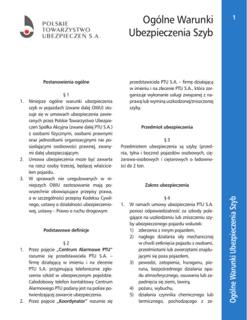 Ogólne Warunki Ubezpieczenia Szyb §1 1. Niniejsze ogólne warunki ubezpieczenia szyb w pojazdach (zwane dalej OWU) stosuje się w umowach ubezpieczenia zawieranych przez Polskie Towarzystwo Ubezpieczeń Spółka Akcyjna (zwane dalej PTU S.A.) z osobami fizycznymi, osobami prawnymi oraz jednostkami organizacyjnymi nie posiadającymi osobowości prawnej, zwanymi dalej ubezpieczającym. 2. Umowa ubezpieczenia może być zawarta na rzecz osoby trzeciej, będącej właścicielem pojazdu. 3. W sprawach nie uregulowanych w niniejszych OWU zastosowanie mają powszechnie obowiązujące przepisy prawa, a w szczególności przepisy Kodeksu Cywilnego, ustawy o działalności ubezpieczeniowej, ustawy – Prawo o ruchu drogowym. Podstawowe definicje §2 1. Przez pojęcie „Centrum Alarmowe PTU” rozumie się przedstawiciela PTU S.A. – firmę działającą w imieniu i na zlecenie PTU S.A. przyjmującą telefonicznie zgłoszenia szkód w ubezpieczonym pojeździe. Całodobowy telefon kontaktowy Centrum Alarmowego PTU podany jest na polisie potwierdzającej zawarcie ubezpieczenia. 2. Przez pojęcie „Koordynator” rozumie się przedstawiciela PTU S.A. – firmę działającą w imieniu i na zlecenie PTU S.A., która zorganizuje wykonanie usługi związanej z naprawą lub wyminą uszkodzonej/zniszczonej szyby. Przedmiot ubezpieczenia §3 Przedmiotem ubezpieczenia są szyby (przednia, tylna i boczne) pojazdów osobowych, ciężarowo-osobowych i ciężarowych o ładowności do 2 ton. Zakres ubezpieczenia §4 1. W ramach umowy ubezpieczenia PTU S.A. ponosi odpowiedzialność za szkody polegające na uszkodzeniu lub zniszczeniu szyby ubezpieczonego pojazdu wskutek: 1) zderzenia z innym pojazdem, 2) nagłego działania siły mechanicznej w chwili zetknięcia pojazdu z osobami, przedmiotami lub zwierzętami znajdującymi się poza pojazdem, 3) powodzi, zatopienia, huraganu, pioruna, bezpośredniego działania opadu atmosferycznego, osuwania lub zapadnięcia się ziemi, lawiny, 4) pożaru, wybuchu, 5) działania czynnika chemicznego lub termicznego, pochodzącego z ze- Ogólne Warunki Ubezpieczenia Szyb Postanowienia ogólne 1 2 wnątrz pojazdu, 6) uszkodzenia przez osoby trzecie, znajdujące się poza pojazdem. 2. Niniejszym ubezpieczeniem objęte są szkody powstałe wyłącznie na terytorium Rzeczypospolitej Polskiej. Ogólne Warunki Ubezpieczenia Szyb Wyłączenia odpowiedzialności §5 W zakresie niniejszego ubezpieczenia odpowiedzialnością PTU S.A. nie są objęte szkody: 1) powstałe przed dniem rozpoczęcia ochrony ubezpieczeniowej przez PTU S.A., 2) powstałe w pojazdach, które w chwili zaistnienia szkody nie posiadały ważnego badania technicznego, 3) spowodowane przez ubezpieczonego lub inną osobę upoważnioną do użytkowania pojazdu, jeżeli osoba ta: a) w chwili zdarzenia znajdowała się w stanie nietrzeźwości lub wskazującym na spożycie alkoholu, pod wpływem narkotyków lub podobnie działających środków, w tym leków, po użyciu których nie należy prowadzić pojazdów mechanicznych, b) podczas kierowania pojazdem nie posiadała aktualnych, wymaganych polskim prawem, uprawnień do kierowania pojazdem, c) spowodowała szkodę umyślnie lub wskutek rażącego niedbalstwa, d) zbiegła z miejsca zdarzenia, e) wykorzystała pojazd jako narzędzie przestępstwa, 4) w pojeździe pochodzącym z kradzieży, przywłaszczenia, oszustwa lub uzyskanym za pomocą innego czynu zabronionego, 5) powstałe w pojazdach stanowiących własność osoby innej niż wymieniona jako właściciel w dokumencie ubezpieczenia, 6) powstałe w pojazdach wprowadzonych nielegalnie na terytorium Polski lub z naru- szeniem przepisów prawa celnego, 7) powstałe w okolicznościach innych niż podane w zgłoszeniu szkody, 8) zaistniałe w wyniku działań wojennych, w czasie trwania stanu wojennego (wyjątkowego) oraz podczas obowiązkowego świadczenia usług na rzecz wojska lub innych podmiotów w związku z działaniami wojennymi, wprowadzeniem stanu wojennego (wyjątkowego), 9) powstałe w pojazdach wykorzystywanych w akcjach protestacyjnych i blokadach dróg, 10) powstałe z przyczyn eksploatacyjnych lub związane z wadą techniczną wykonania pojazdu lub jego naprawy i konserwacji, 11) powstałe w następstwie użytkowania pojazdu niezgodnie z jego przeznaczeniem lub niewłaściwego przewożenia ładunku lub bagażu, a także wskutek niewłaściwego wykonywania czynności załadowywania i wyładowywania, 12) powstałe w trakcie wykonywania napraw i konserwacji pojazdu oraz w pojeździe powierzonym do naprawy, konserwacji lub sprzedaży, 13) powstałe podczas udziału pojazdu w wyścigach, jazdach treningowych, rajdach, próbach szybkościowych, konkursach, jazdach próbnych, pokazowych, 14) w innych szklanych elementach pojazdu; szyberdachach, szkłach reflektorów i świateł, 15) powstałe w elementach związanych z szybami tj. w uszczelkach, w listwach, folii antywłamaniowej, ogrzewaniu, instalacji alarmowej, antenie radiowej, chyba że powstały one jednocześnie z uszkodzeniem/ zniszczeniem szyby lub gdy ich wymiana podyktowana jest technologią naprawy/ wymiany szyby. §6 1. Umowa ubezpieczenia zawierana na podstawie niniejszych OWU może być zawarta wyłącznie przez osoby zawierające w PTU S.A. jednocześnie umowę ubezpieczenia OC lub umowę AC, dotyczącą tego samego pojazdu, na okres 12 miesięcy, pokrywający się w całości z okresem ubezpieczenia umowy OC lub AC. 2. Umowę ubezpieczenia zawiera się na pisemny wniosek ubezpieczającego, stanowiący integralną część umowy ubezpieczenia. 3. Umowę ubezpieczenia uważa się za zawartą z chwilą doręczenia ubezpieczającemu dokumentu ubezpieczenia. 4. Jeśli nie umówiono się inaczej, odpowiedzialność PTU S.A. rozpoczyna się z początkiem okresu ubezpieczenia określonym w polisie, nie wcześniej jednak niż od dnia następnego po zawarciu umowy ubezpieczenia i zapłaceniu składki, a kończy się wskutek rozwiązania umowy ubezp