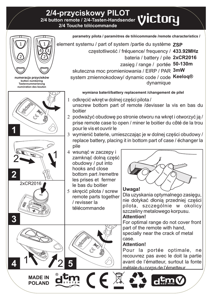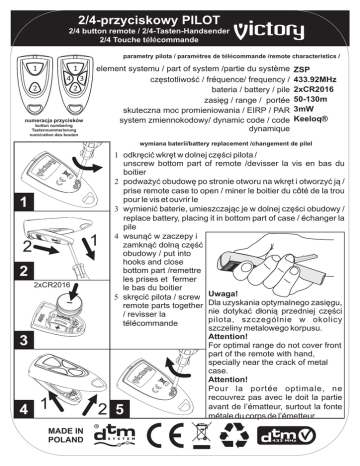 2/4-przyciskowy PILOT 2/4 button remote / 2/4-Tasten-Handsender 2/4 Touche tJlJcommande parametry pilota / paramPtres de tJlJcommande /remote characteristics / 1 1 4 2 3 2 numeracja przycisków button numbering Tastennummerierung numJration des bouton element systemu / part of system /partie du systPme częstotliwość / frJquence/ frequency / bateria / battery / pile zasięg / range / portJe skuteczna moc promieniowania / EIRP / PAR system zmiennokodowy/ dynamic code / code dynamique ZSP 433.92MHz 2xCR2016 50-130m 3mW Keeloq® wymiana baterii/battery replacement /changement de pilel 1 1 2 2 2xCR2016 3 4 1 MADE IN POLAND 1 odkręcić wkręt w dolnej części pilota / unscrew bottom part of remote /devisser la vis en bas du boitier 2 podważyć obudowę po stronie otworu na wkręt i otworzyć ją / prise remote case to open / miner le boitier du c^tJ de la trou pour le vis et ouvrir le 3 wymienić baterie, umieszczając je w dolnej części obudowy / replace battery, placing it in bottom part of case / Jchanger la pile 4 wsunąć w zaczepy i zamknąć dolną część obudowy / put into hooks and close bottom part /remettre les prises et fermer le bas du boitier 5 skręcić pilota / screw Uwaga! remote parts together Dla uzyskania optymalnego zasięgu, nie dotykać dłonią przedniej części / revisser la pilota, szczególnie w okolicy tJlJcommande szczeliny metalowego korpusu. Attention! For optimal range do not cover front part of the remote with hand, specially near the crack of metal case. Attention! Pour la port J e optimale, ne recouvrez pas avec le doit la partie avant de l’Jmatteur, surtout la fonte mJtale du corps de l’Jmetteur 2 5 DEKLARACJA ZGODNOŚCI Declaration of conformity / DJclaration de conformitJ Nr 02/2010 Producent / Manufacturer / Fabricant DTM System, Brzeska 7, PL 85-145 Bydgoszcz Wyrób / Product / Produit Pilot (nadajnik) radiowy z serii ZSP model: VICTORY Radio remote control transmitter, ZSP series, model: VICTORY TJlJcommande de la Serie ZSP: VICTORY Opis wyrobu / Description / Description du produit Wyrób służy do realizacji sterowania odbiornikiem (sterownikiem) radiowym z serii ZSP-4, poprzez emitowaną radiową transmisję kodowaną na częstotliwości 433.92MHz. Sterowanie następuje przez naciśnięcie jednego z dwóch lub czterech przycisków. Radiowa moc promieniowania wyrobu nie przekracza 10mW. Wyrób zasilany jest dwoma ogniwami 3V. Radio remote control transmitter controls receivers belonging to ZSP-4 series, by transmitting coded signal on 433.92MHz frequency. The transmission starts after depressing one of two or four buttons on the remote. EIRP power is below 10mW. Suppiled with 2x3V battery. Le dispositif sert B commander B distance le rJcepteur (motorisation) radio de la serie ZSP - 4,B l’aide de la tramsmission radio codJe sur la frJquence 433,92 Mhz. La commande est rJalisJe par l’appui l’un des 2 ou 4 boutons. PAR - 10mW. AlimentJ par 2 piles de 3V Wyrób jest zgodny z Dyrektywami Unii Europejskiej: Product is compatible with European Directives: Dispositif est compatible aux Directives de L’Union EuropJenne R&TTE 99/5/EC Sprzęt radiowy w KLASIE 1 według R&TTE Radio device in CLASS 1 according to R&TTE / Dispositif radio dans la classe I d’aprPs R&TTE Wyrób spełnia wymagania norm zharmonizowanych: Product is compatible with harmonized norm: Dispositif conforme aux normes harmonisJes R&TTE: EN 300 220-1; EN 300 220-3; EMC: EN 301 489-1; EN 301 489-3; LVD: EN 60950-1:2001 Procedura oceny zgodności Acceptance procedure /ProcJdure de conformitJ W wyrobach przeprowadzono wewnętrzną kontrolę produkcji zgodnie z załącznikiem II dyrektywy R&TTE 99/5/EC. Dodatkowo wyroby, zgodnie z załącznikiem III tej samej dyrektywy, poddane zostały szczegółowym testom i badaniom z zastosowaniem zestawów w całości określonych w zharmonizowanych normach. Wyniki potwierdzają zgodność. Dodatkowo potwierdzeniem zgodności dla przedmiotowego wyrobu lub wyrobów pochodnych są przeprowadzone badania w Instytytucie Łączności, Szachowa1, PL 04-894 Warszawa. Receivers and remote controls were tested during internal production tests according to R&TTE 99/5/EC directive (annex II). In addition, according to annex III of the same directive, devices were tested in detail using equipment mentioned in harmonized norms. All tests were passed. Additional confirmation for this and related products was carried out by Instytut Łączności, Szachowa 1, PL 04-894 Warszawa. Das Konformitätsbewertungsverfahren und die Durchführung notwendiger Prüfungen und Messungen wurden im Institut für Verbindungswesen, ul. Szachowa 1, PL 04-894 Warszawa durchgeführt. Bydgoszcz, Polska Poland / Polen 10-08-2010 Właściciel / Owner / PDG Daniel Kujawski Urządzeń elektrycznych lub elektronicznych nie można wyrzucać razem z odpadami gospodarczymi! Electrical or Electronical Devices can't be throw out with other waste! Ne pas jeter les dispositifs Jlectronique ou Jlectriques avec les dJchLts mJnagers!