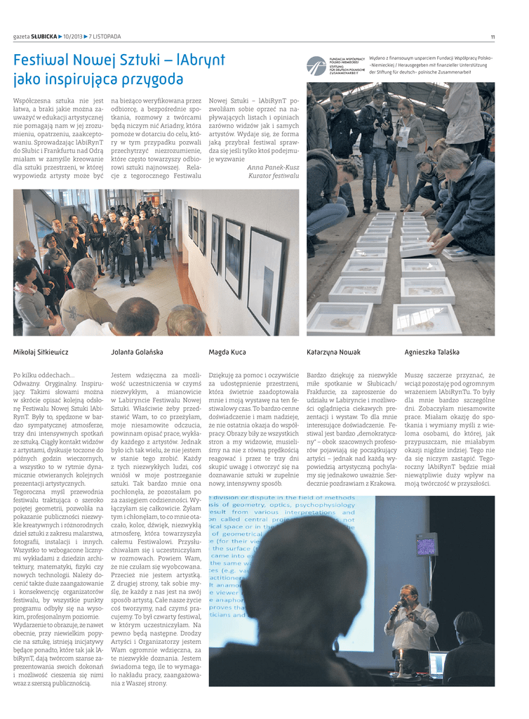 gazeta SŁUBICKA 10/2013 7 LISTOPADA 11 Festiwal Nowej Sztuki – lAbrynt jako inspirująca przygoda Wydano z finansowym wsparciem Fundacji Współpracy Polsko-Niemieckiej / Herausgegeben mit finanzieller Unterstützung der Stiftung für deutsch- polnische Zusammenarbeit Współczesna sztuka nie jest łatwa, a braki jakie można zauważyć w edukacji artystycznej nie pomagają nam w jej zrozumieniu, opatrzeniu, zaakceptowaniu. Sprowadzając lAbiRynT do Słubic i Frankfurtu nad Odrą miałam w zamyśle kreowanie dla sztuki przestrzeni, w której wypowiedz artysty może być na bieżąco weryfikowana przez odbiorcę, a bezpośrednie spotkania, rozmowy z twórcami będą niczym nić Ariadny, która pomoże w dotarciu do celu, który w tym przypadku pozwali przechytrzyć niezrozumienie, które często towarzyszy odbiorowi sztuki najnowszej. Relacje z tegorocznego Festiwalu Nowej Sztuki – lAbiRynT pozwoliłam sobie oprzeć na napływających listach i opiniach zarówno widzów jak i samych artystów. Wydaje się, że forma jaką przybrał festiwal sprawdza się jeśli tylko ktoś podejmuje wyzwanie Anna Panek-Kusz Kurator festiwalu Mikołaj Sitkiewicz Jolanta Golańska Magda Kuca Katarzyna Nowak Agnieszka Talaśka Po kilku oddechach… Odważny. Oryginalny. Inspirujący. Takimi słowami można w skrócie opisać kolejną odsłonę Festiwalu Nowej Sztuki lAbiRynT. Były to, spędzone w bardzo sympatycznej atmosferze, trzy dni intensywnych spotkań ze sztuką. Ciągły kontakt widzów z artystami, dyskusje toczone do późnych godzin wieczornych, a wszystko to w rytmie dynamicznie otwieranych kolejnych prezentacji artystycznych. Tegoroczna myśl przewodnia festiwalu traktująca o szeroko pojętej geometrii, pozwoliła na pokazanie publiczności niezwykle kreatywnych i różnorodnych dzieł sztuki z zakresu malarstwa, fotografii, instalacji i innych. Wszystko to wzbogacone licznymi wykładami z dziedzin architektury, matematyki, fizyki czy nowych technologii. Należy docenić także duże zaangażowanie i konsekwencję organizatorów festiwalu, by wszystkie punkty programu odbyły się na wysokim, profesjonalnym poziomie. Wydarzenie to obrazuje, że nawet obecnie, przy niewielkim popycie na sztukę, istnieją inicjatywy będące ponadto, które tak jak lAbiRynT, dają twórcom szanse zaprezentowania swoich dokonań i możliwość cieszenia się nimi wraz z szerszą publicznością. Jestem wdzięczna za możliwość uczestniczenia w czymś niezwykłym, a mianowicie w Labiryncie Festiwalu Nowej Sztuki. Właściwie żeby przedstawić Wam, to co przeżyłam, moje niesamowite odczucia, powinnam opisać prace, wykłady każdego z artystów. Jednak było ich tak wielu, że nie jestem w stanie tego zrobić. Każdy z tych niezwykłych ludzi, coś wniósł w moje postrzeganie sztuki. Tak bardzo mnie ona pochłonęła, że pozostałam po za zasięgiem codzienności. Wyłączyłam się całkowicie. Żyłam tym i chłonęłam, to co mnie otaczało, kolor, dźwięk, niezwykłą atmosferę, która towarzyszyła całemu Festiwalowi. Przysłuchiwałam się i uczestniczyłam w rozmowach. Powiem Wam, że nie czułam się wyobcowana. Przecież nie jestem artystką. Z drugiej strony, tak sobie myślę, że każdy z nas jest na swój sposób artystą. Całe nasze życie coś tworzymy, nad czymś pracujemy. To był czwarty festiwal, w którym uczestniczyłam. Na pewno będą następne. Drodzy Artyści i Organizatorzy jestem Wam ogromnie wdzięczna, za te niezwykłe doznania. Jestem świadoma tego, ile to wymagało nakładu pracy, zaangażowania z Waszej strony. Dziękuję za pomoc i oczywiście za udostępnienie przestrzeni, która świetnie zaadoptowała mnie i moją wystawę na ten festiwalowy czas. To bardzo cenne doświadczenie i mam nadzieje, że nie ostatnia okazja do współpracy. Obrazy biły ze wszystkich stron a my widzowie, musieliśmy na nie z równą prędkością reagować i przez te trzy dni skupić uwagę i otworzyć się na doznawanie sztuki w zupełnie nowy, intensywny sposób. Bardzo dziękuję za niezwykle miłe spotkanie w Słubicach/ Frakfurcie, za zaproszenie do udziału w Labiryncie i możliwości oglądnięcia ciekawych prezentacji i wystaw. To dla mnie interesujące doświadczenie. Festiwal jest bardzo „demokratyczny” – obok szacownych profesorów pojawiają się początkujący artyści – jednak nad każdą wypowiedzią artystyczną pochylamy się jednakowo uważnie. Serdecznie pozdrawiam z Krakowa. Muszę szczerze przyznać, że wciąż pozostaję pod ogromnym wrażeniem lAbiRynTu. To były dla mnie bardzo szczególne dni. Zobaczyłam niesamowite prace. Miałam okazję do spotkania i wymiany myśli z wieloma osobami, do której, jak przypuszczam, nie miałabym okazji nigdzie indziej. Tego nie da się niczym zastąpić. Tegoroczny lAbiRynT będzie miał niewątpliwie duży wpływ na moją twórczość w przyszłości.
