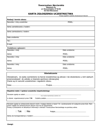 Towarzystwo Narciarskie Wojciech Fic ul. Nowowiejska 37 B/03 02-010 Warszawa KARTA ZGŁOSZENIA UCZESTNICTWA Proszę wypełnić czytelnie drukowanymi literami Rodzaj i termin obozu: Nazwisko i imię uczestnika: PESEL: Adres zameldowania z kodem: Adres zamieszkania z kodem: Data urodzenia: Tel.: E-mail: Dodatkowo zgłaszam: Nazwisko i imię: Data urodzenia: Adres: PESEL: Nazwisko i imię: Data urodzenia: Adres: PESEL: Nazwisko i imię: Data urodzenia: Adres: PESEL: Oświadczenie Oświadczam, że osoby wymienione na Karcie Uczestnictwa są zdrowe i nie stwierdzono u nich żadnych przeciwwskazań do udziału w imprezie sportowo-rekreacyjnej Znane są mi warunki uczestnictwa i regulamin obozu. Data:................................................................. Podpis....................................................................... Wypełnia rodzic / opiekun uczestnika niepełnoletniego Wyrażam zgodę na udział......................................................................................................................... Imię i nazwisko niepełnoletniego uczestnika (-ów) w obozie organizowanym przez T.N. Czytelny podpis...................................................... Wyrażam zgodę na umieszczenie danych moich / mojego dziecka w bazie T.N. i przetwarzanie ich wyłącznie przez klub. Mam prawo wglądu do zamieszczonych danych oraz do ich poprawiania. Proszę o przesyłanie mi aktualnych informacji o ofertach Towarzystwa Narciarskiego na poniższy adres. Tak Nie Podpis...................................................... Adres do korespondencji z kodem:.................................................................................................. Uwagi: Towarzystwo Narciarskie Wojciech Fic ul. Nowowiejska 37 B/03 02-010 Warszawa Warunki uczestnictwa: Warunki płatności: 1. 2. 3. 4. 5. Przy rezerwacji miejsca na imprezę uczestnik wpłaca zaliczkę w określonej przez organizatora wysokości Zaliczkę można wycofać do 14 dni przed rozpoczęciem imprezy, wówczas ostanie potrącone 50% jej wartości Cała opłata za obóz powinna wpłynąć najpóźniej w terminie 14 dni przed wyjazdem. Nie wpłacenie całości sumy w terminie określonym w punkcie 3. traktowane jest jako rezygnacja. W razie rezygnacji z obozu i wycofania wpłat po terminie określonym w punkcie 2., może zostać potrącone 50% wartości obozu. 6. Uczestnik może otrzymać zwrot całej wpłaty bez względu na termin rezygnacji w przypadku gdy znajdzie osobę na zwalniane przez siebie miejsce 7. Ceny obozów mogą ulec zmianie do trzech tygodni przed rozpoczęciem Regulamin obozów: 1. Uczestnictwo w zajęciach oraz posiłkach jest dla wszystkich obowiązkowe. 2. Obowiązuje przestrzeganie ramowego porządku dnia i stawianie się na zbiórki punktualnie. 3. W czasie zajęć, ze względu na bezpieczeństwo, uczestnicy zobowiązani są ściśle stosować się do poleceń instruktorów. 4. Uczestnika obowiązuje zakaz samodzielnego oddalania się od grupy podczas zajęć i w czasie wolnym. 5. Na obozie obowiązuje całkowity zakaz palenia papierosów, picia alkoholu czy stosowania innych środków odurzających. 6. Uczestnik zobowiązany jest do wykonywania poleceń kierownika obozu, instruktora dyżurnego oraz osób przez nich wyznaczonych. 7. Należy dbać o higienę osobistą oraz schludny wygląd, a także o miejsce w którym się przebywa. 8. Za umyślne szkody materialne, finansowo odpowiadają uczestnicy (pełnoletni) lub rodzice. 9. Należy udzielać sobie wzajemnej pomocy, troszczyć się o słabszych. 10. Przy wyjazdach zagranicznych uczestnicy zobowiązani są do przestrzegania norm kulturowych i obyczajowych kraju, na terenie którego się znajdują 11. W przypadku poważnego naruszenia regulaminu, uczestnik może zostać wykluczony z obozu i odesłany do domu na własny koszt, bez możliwości zwrotu pieniędzy za nie wykorzystane świadczenia. 12. Uczestnik przyjmuje do wiadomości, iż zakres ubezpieczenia (NNW, KL, OC) które ma wykupione nie obejmuje: a) wypadków podczas których uczestnik przebywał pod wpływem alkoholu, narkotyków i środków odurzających nie przepisanych przez lekarza lub przepisanych przez lekarza, ale stosowanych niezgodnie z jego zaleceniem, b) wypadków wynikających z łamania prawa (wykroczenia o charakterze karnym np. bójki) c) nie respektowania ogólnie uznanych reguł bezpieczeństwa, zwłaszcza przy uprawianiu wszelkich dyscyplin sportowych; - m.in. jazda na nartach i deskach snowboardowych po nie wyznaczonych trasach. Oświadczam, że zapoznałem/am się z warunkami uczestnictwa. ….................................................................... Data i podpis