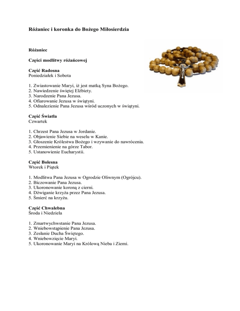 Różaniec i koronka do Bożego Miłosierdzia Różaniec Części modlitwy różańcowej Część Radosna Poniedziałek i Sobota 1. Zwiastowanie Maryi, iż jest matką Syna Bożego. 2. Nawiedzenie świętej Elżbiety. 3. Narodzenie Pana Jezusa. 4. Ofiarowanie Jezusa w świątyni. 5. Odnalezienie Pana Jezusa wśród uczonych w świątyni. Część Światła Czwartek 1. Chrzest Pana Jezusa w Jordanie. 2. Objawienie Siebie na weselu w Kanie. 3. Głoszenie Królestwa Bożego i wzywanie do nawrócenia. 4. Przemienienie na górze Tabor. 5. Ustanowienie Eucharystii. Część Bolesna Wtorek i Piątek 1. Modlitwa Pana Jezusa w Ogrodzie Oliwnym (Ogrójcu). 2. Biczowanie Pana Jezusa. 3. Ukoronowanie koroną z cierni. 4. Dźwiganie krzyża przez Pana Jezusa. 5. Śmierć na krzyżu. Część Chwalebna Środa i Niedziela 1. Zmartwychwstanie Pana Jezusa. 2. Wniebowstąpienie Pana Jezusa. 3. Zesłanie Ducha Świętego. 4. Wniebowzięcie Maryi. 5. Ukoronowanie Maryi na Królową Nieba i Ziemi. Koronka do Bożego Miłosierdzia W imię Ojca i Syna, i Ducha Świętego. Amen Wierzę w Boga, Ojca wszechmogącego, Stworzyciela nieba i ziemi. I w Jezusa Chrystusa, Syna Jego jedynego, Pana naszego, który się począł z Ducha Świętego, narodził się z Maryi Panny, umęczon pod Ponckim Piłatem, ukrzyżowan, umarł i pogrzebion; zstąpił do piekieł, trzeciego dnia zmartwychwstał; wstąpił do niebiosa, siedzi po prawicy Boga, Ojca wszechmogącego; stamtąd przyjdzie sądzić żywych i umarłych. Wierzę w Ducha Świętego, Święty Kościół powszechny, Świętych obcowanie, grzechów odpuszczenie, ciała zmartwychwstanie i żywot wieczny. Amen Ojcze nasz... Zdrowaś, Maryjo... Na dużych paciorkach: Ojcze Przedwieczny, ofiaruję Ci Ciało i Krew, duszę i bóstwo najmilszego Syna Twojego a Pana naszego, Jezusa Chrystusa, na przebłaganie za grzechy nasze i całego świata. Na małych paciorkach: Dla Jego bolesnej męki miej miłosierdzie dla nas i całego świata.(10 razy z rzędu) Na zakończenie: Święty Boże, Święty Mocny, Święty Nieśmiertelny, zmiłuj się nad nami i nad całym światem. (3 razy z rzędu)