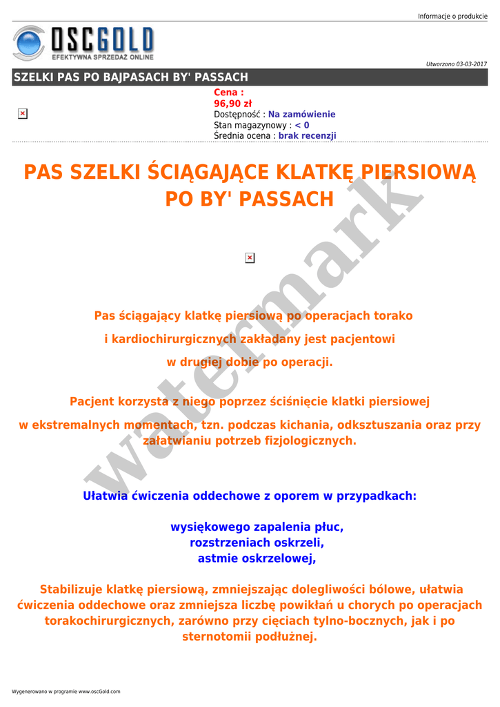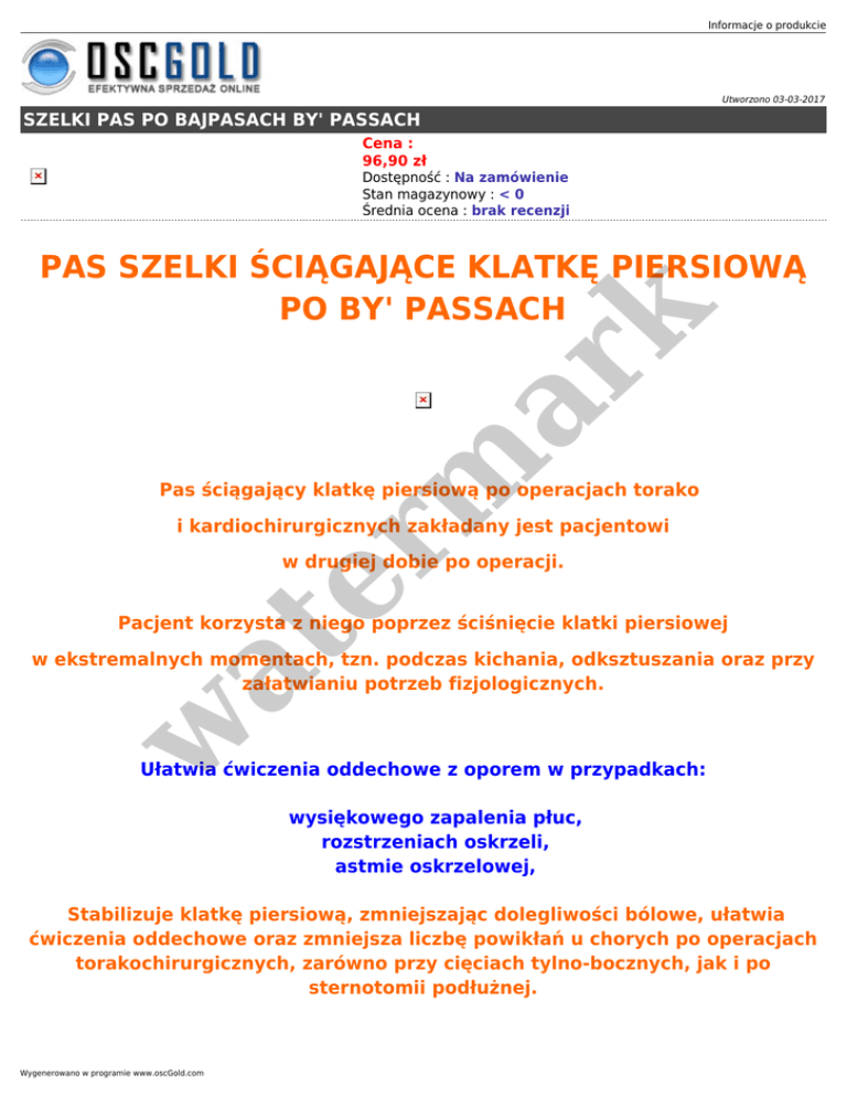 Informacje o produkcie Utworzono 03-03-2017 SZELKI PAS PO BAJPASACH BY' PASSACH Cena : 96,90 zł Dostępność : Na zamówienie Stan magazynowy : < 0 Średnia ocena : brak recenzji er m ar k PAS SZELKI ŚCIĄGAJĄCE KLATKĘ PIERSIOWĄ PO BY' PASSACH Pas ściągający klatkę piersiową po operacjach torako i kardiochirurgicznych zakładany jest pacjentowi w drugiej dobie po operacji. at Pacjent korzysta z niego poprzez ściśnięcie klatki piersiowej w w ekstremalnych momentach, tzn. podczas kichania, odksztuszania oraz przy załatwianiu potrzeb fizjologicznych. Ułatwia ćwiczenia oddechowe z oporem w przypadkach: wysiękowego zapalenia płuc, rozstrzeniach oskrzeli, astmie oskrzelowej, Stabilizuje klatkę piersiową, zmniejszając dolegliwości bólowe, ułatwia ćwiczenia oddechowe oraz zmniejsza liczbę powikłań u chorych po operacjach torakochirurgicznych, zarówno przy cięciach tylno-bocznych, jak i po sternotomii podłużnej. Wygenerowano w programie www.oscGold.com Pas stwarza korzystne warunki do zwiększenia ruchu oddechowego, dolnożebrowego, zwiększa udział przepony i mięśni brzucha w oddychaniu. Jest bardzo przydatny w gimnastyce ambulatoryjnej, co zapobiega tworzeniu się zrostów opłucnej. er m ar k Otrzymał pozytywna opinię Instytutu Rehabilitacji i Ortopedii w Poznaniu pod kierownictwem Pani Profesor Kazimiery Milanowskiej oraz II Kliniki Kardiochirurgii Śląskiej Akademii Medycznej w Katowicach-Ochojcu pod kierownictwem Prof. Stanisława Wosia w at Pasy mają podstawę bawełnianą i z materiału tzw. Rzep-meszek. Rozmiar uniwersalny, pełna regulacja podstawy pasa i szelek.