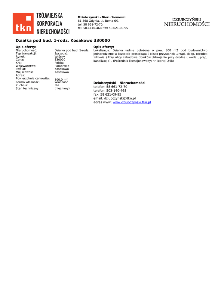 Dziubczyński - Nieruchomości 81-368 Gdynia, ul. Bema 6/1 tel. 58 661-72-70; tel. 503-140-468; fax 58 621-09-95 Działka pod bud. 1-rodz. Kosakowo 330000 Opis oferty: Nieruchomość: Typ transakcji: Rynek: Cena: Kraj: Wojewodztwo: Powiat: Miejscowosc: Adres: Powierzchnia całkowita: Forma własności: Kuchnia: Stan techniczny: Opis oferty: Działka pod bud. 1-rodz. Sprzedaż Wtórny 330000 Polska Pomorskie Kosakowo Kosakowo . 800.0 m2 Własność Nie (nieznany) Lokalizacja: Działka ładnie położona o pow. 800 m2 pod budownictwo jednorodzinne w kształcie prostokąta ( blisko przystanek ,urząd, sklep, ośrodek zdrowia ).Przy ulicy zabudowa domków.Uzbrojenie przy drodze ( woda , prąd, kanalizacja) . (Pośrednik licencjonowany: nr licencji 248) Dziubczyński - Nieruchomości telefon: 58 661-72-70 telefon: 503-140-468 fax: 58 621-09-95 email: [email protected] adres www: www.dziubczynski.tkn.pl