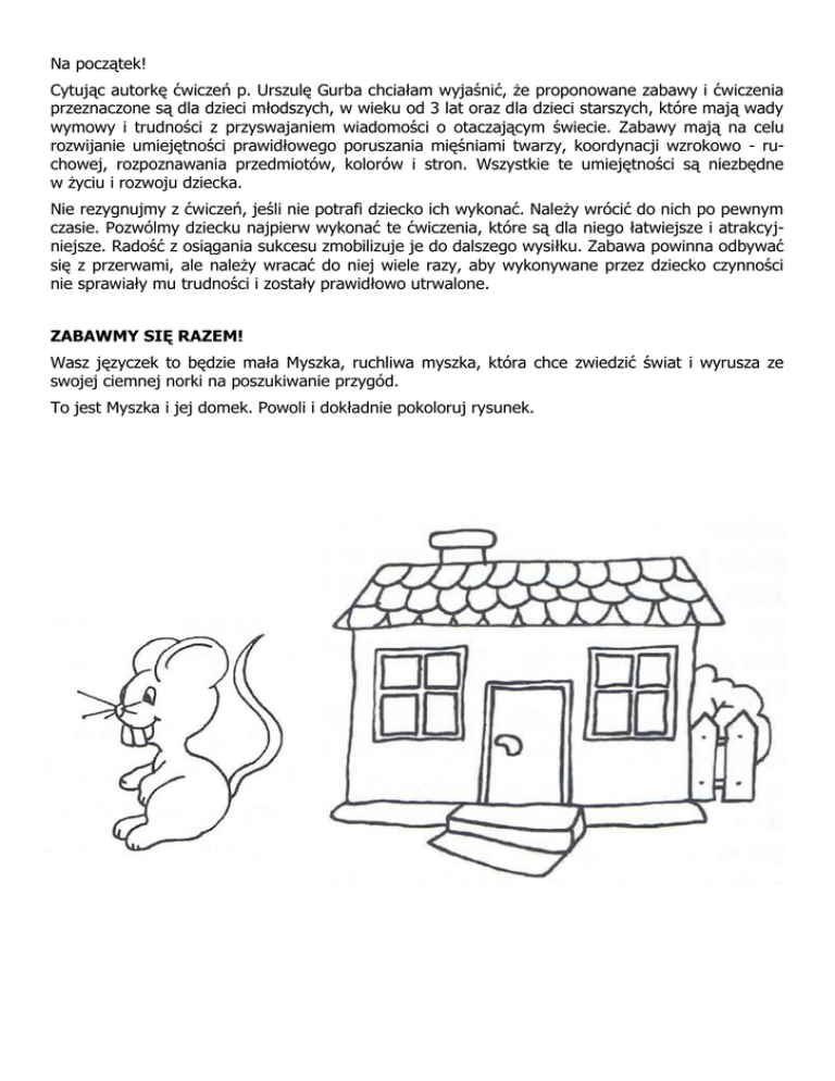 Na początek! Cytując autorkę ćwiczeń p. Urszulę Gurba chciałam wyjaśnić, że proponowane zabawy i ćwiczenia przeznaczone są dla dzieci młodszych, w wieku od 3 lat oraz dla dzieci starszych, które mają wady wymowy i trudności z przyswajaniem wiadomości o otaczającym świecie. Zabawy mają na celu rozwijanie umiejętności prawidłowego poruszania mięśniami twarzy, koordynacji wzrokowo - ruchowej, rozpoznawania przedmiotów, kolorów i stron. Wszystkie te umiejętności są niezbędne w życiu i rozwoju dziecka. Nie rezygnujmy z ćwiczeń, jeśli nie potrafi dziecko ich wykonać. Należy wrócić do nich po pewnym czasie. Pozwólmy dziecku najpierw wykonać te ćwiczenia, które są dla niego łatwiejsze i atrakcyjniejsze. Radość z osiągania sukcesu zmobilizuje je do dalszego wysiłku. Zabawa powinna odbywać się z przerwami, ale należy wracać do niej wiele razy, aby wykonywane przez dziecko czynności nie sprawiały mu trudności i zostały prawidłowo utrwalone. ZABAWMY SIĘ RAZEM! Wasz języczek to będzie mała Myszka, ruchliwa myszka, która chce zwiedzić świat i wyrusza ze swojej ciemnej norki na poszukiwanie przygód. To jest Myszka i jej domek. Powoli i dokładnie pokoloruj rysunek. Teraz możemy już zaczynać Usiądź przed lustrem z osobą, z która lubisz się bawić i razem spróbujcie naśladować Myszką. Każde ćwiczenie powtórz 10 razy. Gdy rano zabłysło słońce, Myszka wyszła z domu na spacer (wysuwamy język daleko na brodę). Potem rozglądała się uważnie: najpierw w prawo, później w lewo (język porusza się w prawo i w lewo, a ręka pokazuje kierunek). Myszka musi wiedzieć, dokąd ma iść, a Ty jesteś jej drogowskazem (młodsze dziecko nie musi znać nazw stron, ważne jest, by zdawało sobie sprawę z istnienia różnych stron i symetrii własnego ciała). Drogowskaz wskazujący prawą stronę pokoloruj na czerwono, a ten, który wskazuje lewą stronę – na zielono. Teraz pomyśl – dokąd Myszka ma pójść? W prawo, czy w lewo? Jeżeli wybrałeś czerwone okienko, Twoja myszka wyszła na prawo – do lasu, a jeżeli wybrałeś zielone, Myszka wyszła w lewo – do ogrodu.