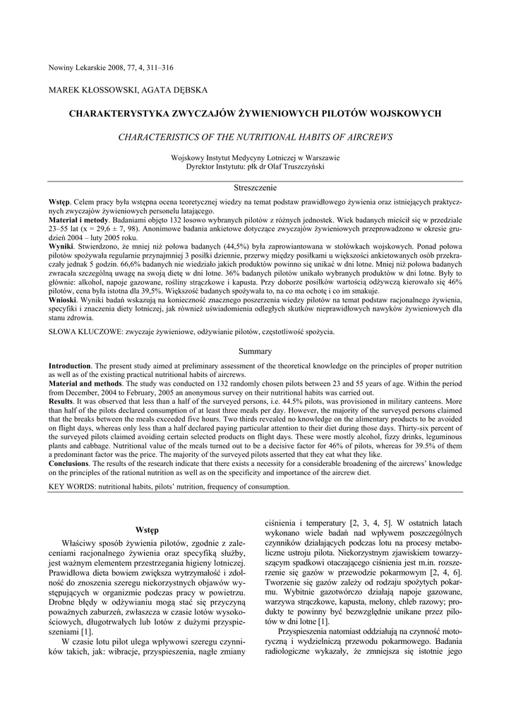 Nowiny Lekarskie 2008, 77, 4, 311–316 MAREK KŁOSSOWSKI, AGATA DĘBSKA CHARAKTERYSTYKA ZWYCZAJÓW ŻYWIENIOWYCH PILOTÓW WOJSKOWYCH CHARACTERISTICS OF THE NUTRITIONAL HABITS OF AIRCREWS Wojskowy Instytut Medycyny Lotniczej w Warszawie Dyrektor Instytutu: płk dr Olaf Truszczyński Streszczenie Wstęp. Celem pracy była wstępna ocena teoretycznej wiedzy na temat podstaw prawidłowego żywienia oraz istniejących praktycznych zwyczajów żywieniowych personelu latającego. Materiał i metody. Badaniami objęto 132 losowo wybranych pilotów z różnych jednostek. Wiek badanych mieścił się w przedziale 23–55 lat (x = 29,6 ± 7, 98). Anonimowe badania ankietowe dotyczące zwyczajów żywieniowych przeprowadzono w okresie grudzień 2004 – luty 2005 roku. Wyniki. Stwierdzono, że mniej niż połowa badanych (44,5%) była zaprowiantowana w stołówkach wojskowych. Ponad połowa pilotów spożywała regularnie przynajmniej 3 posiłki dziennie, przerwy między posiłkami u większości ankietowanych osób przekraczały jednak 5 godzin. 66,6% badanych nie wiedziało jakich produktów powinno się unikać w dni lotne. Mniej niż połowa badanych zwracała szczególną uwagę na swoją dietę w dni lotne. 36% badanych pilotów unikało wybranych produktów w dni lotne. Były to głównie: alkohol, napoje gazowane, rośliny strączkowe i kapusta. Przy doborze posiłków wartością odżywczą kierowało się 46% pilotów, cena była istotna dla 39,5%. Większość badanych spożywała to, na co ma ochotę i co im smakuje. Wnioski. Wyniki badań wskazują na konieczność znacznego poszerzenia wiedzy pilotów na temat podstaw racjonalnego żywienia, specyfiki i znaczenia diety lotniczej, jak również uświadomienia odległych skutków nieprawidłowych nawyków żywieniowych dla stanu zdrowia. SŁOWA KLUCZOWE: zwyczaje żywieniowe, odżywianie pilotów, częstotliwość spożycia. Summary Introduction. The present study aimed at preliminary assessment of the theoretical knowledge on the principles of proper nutrition as well as of the existing practical nutritional habits of aircrews. Material and methods. The study was conducted on 132 randomly chosen pilots between 23 and 55 years of age. Within the period from December, 2004 to February, 2005 an anonymous survey on their nutritional habits was carried out. Results. It was observed that less than a half of the surveyed persons, i.e. 44.5% pilots, was provisioned in military canteens. More than half of the pilots declared consumption of at least three meals per day. However, the majority of the surveyed persons claimed that the breaks between the meals exceeded five hours. Two thirds revealed no knowledge on the alimentary products to be avoided on flight days, whereas only less than a half declared paying particular attention to their diet during those days. Thirty-six percent of the surveyed pilots claimed avoiding certain selected products on flight days. These were mostly alcohol, fizzy drinks, leguminous plants and cabbage. Nutritional value of the meals turned out to be a decisive factor for 46% of pilots, whereas for 39.5% of them a predominant factor was the price. The majority of the surveyed pilots asserted that they eat what they like. Conclusions. The results of the research indicate that there exists a necessity for a considerable broadening of the aircrews’ knowledge on the principles of the rational nutrition as well as on the specificity and importance of the aircrew diet. KEY WORDS: nutritional habits, pilots’ nutrition, frequency of consumption. Wstęp Właściwy sposób żywienia pilotów, zgodnie z zaleceniami racjonalnego żywienia oraz specyfiką służby, jest ważnym elementem przestrzegania higieny lotniczej. Prawidłowa dieta bowiem zwiększa wytrzymałość i zdolność do znoszenia szeregu niekorzystnych objawów występujących w organizmie podczas pracy w powietrzu. Drobne błędy w odżywianiu mogą stać się przyczyną poważnych zaburzeń, zwłaszcza w czasie lotów wysokościowych, długotrwałych lub lotów z dużymi przyspieszeniami [1]. W czasie lotu pilot ulega wpływowi szeregu czynników takich, jak: wibracje, przyspieszenia, nagłe zmiany ciśnienia i temperatury [2, 3, 4, 5]. W ostatnich latach wykonano wiele badań nad wpływem poszczególnych czynników działających podczas lotu na procesy metaboliczne ustroju pilota. Niekorzystnym zjawiskiem towarzyszącym spadkowi otaczającego ciśnienia jest m.in. rozszerzenie się gazów w przewodzie pokarmowym [2, 4, 6]. Tworzenie się gazów zależy od rodzaju spożytych pokarmu. Wybitnie gazotwórczo działają napoje gazowane, warzywa strączkowe, kapusta, melony, chleb razowy; produkty te powinny być bezwzględnie unikane przez pilotów w dni lotne [1]. Przyspieszenia natomiast oddziałują na czynność motoryczną i wydzielniczą przewodu pokarmowego. Badania radiologiczne wykazały, że zmniejsza się istotnie jego Marek Kłossowski, Agata Dębska czynność. Podczas lotów nurkowych następuje przemieszczenie krwi z górnej połowy ciała do naczyń jamy brzusznej i kończyn dolnych. Dochodzi wówczas do zastoju krwi w wątrobie. Praca wątroby ulega w tych warunkach zaburzeniom. Zmniejsza się wydzielanie śliny i soku żołądkowego [2, 4]. Wcześniejsze badania wykazały, że węglowodany zmniejszają i opóźniają występowanie objawów niedotlenienia towarzyszącego pracy w powietrzu. Dlatego w okresie wykonywania lotów wysokościowych spożywane potrawy muszą zawierać przeważnie węglowodany, natomiast bardzo mało tłuszczów [4]. Jednym z ważniejszych problemów związanym z nieprawidłową dietą jest występowanie choroby lokomocyjnej. Głównymi produktami wywołującymi takie objawy, jak: bladość, nudności, wymioty, niepokój, zimne poty, stan przedomdleniowy, poszarzenie i zaciemnienie pola widzenia (greyout/blackout) są produkty mleczne. Nie mniejszymi induktorami są pokarmy zawierające dużo sodu [4, 6]. Badania nad 