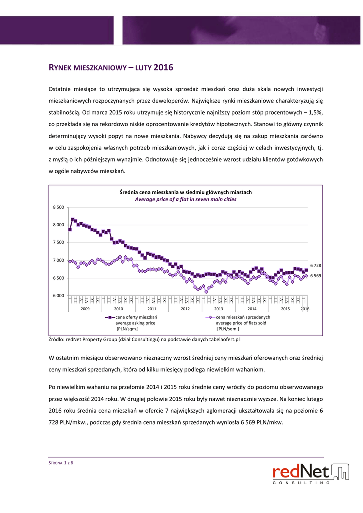 RYNEK MIESZKANIOWY – LUTY 2016 Ostatnie miesiące to utrzymująca się wysoka sprzedaż mieszkań oraz duża skala nowych inwestycji mieszkaniowych rozpoczynanych przez deweloperów. Największe rynki mieszkaniowe charakteryzują się stabilnością. Od marca 2015 roku utrzymuje się historycznie najniższy poziom stóp procentowych – 1,5%, co przekłada się na rekordowo niskie oprocentowanie kredytów hipotecznych. Stanowi to główny czynnik determinujący wysoki popyt na nowe mieszkania. Nabywcy decydują się na zakup mieszkania zarówno w celu zaspokojenia własnych potrzeb mieszkaniowych, jak i coraz częściej w celach inwestycyjnych, tj. z myślą o ich późniejszym wynajmie. Odnotowuje się jednocześnie wzrost udziału klientów gotówkowych w ogóle nabywców mieszkań. Średnia cena mieszkania w siedmiu głównych miastach Average price of a flat in seven main cities 8 500 8 000 7 500 7 000 6 728 6 569 6 500 I III V VII IX XI I III V VII IX XI I III V VII IX XI I III V VII IX XI I III V VII IX XI I III V VII IX XI I III V VII IX XI I 6 000 2009 2010 2011 cena oferty mieszkań average asking price [PLN/sqm.] 2012 2013 2014 2015 2016 cena mieszkań sprzedanych average price of flats sold [PLN/sqm.] Źródło: redNet Property Group (dział Consultingu) na podstawie danych tabelaofert.pl W ostatnim miesiącu obserwowano nieznaczny wzrost średniej ceny mieszkań oferowanych oraz średniej ceny mieszkań sprzedanych, która od kilku miesięcy podlega niewielkim wahaniom. Po niewielkim wahaniu na przełomie 2014 i 2015 roku średnie ceny wróciły do poziomu obserwowanego przez większość 2014 roku. W drugiej połowie 2015 roku były nawet nieznacznie wyższe. Na koniec lutego 2016 roku średnia cena mieszkań w ofercie 7 największych aglomeracji ukształtowała się na poziomie 6 728 PLN/mkw., podczas gdy średnia cena mieszkań sprzedanych wyniosła 6 569 PLN/mkw. STRONA 1 z 6 Sytuacja cenowa w poszczególnych miastach w ostatnich dwóch miesiącach wyglądała następująco: Miasto Średnia cena mieszkań oferowanych Średnia cena mieszkań sprzedanych Cena mieszkań sprzedanych/ cena mieszkań oferowanych styczeń 2016 luty 2016 styczeń 2016 luty 2016 styczeń 2016 luty 2016 Katowice 5 678 5 640 5 075 5 063 -10,6% -10,2% Kraków 6 355 6 379 6 364 6 274 0,1% -1,6% Łódź 4 680 4 676 4 663 4 658 -0,4% -0,4% Poznań 6 394 6 355 6 396 6 213 0,0% -2,2% Gdańsk 5 950 5 766 5 729 5 750 -3,7% -0,3% Warszawa 7 924 7 970 7 610 7 579 -4,0% -4,9% Wrocław 6 185 6 154 6 042 6 128 -2,3% -0,4% aglomeracja warszawska 7 592 7 622 7 327 7 409 -3,5% -2,8% aglomeracja trójmiejska 5 929 5 950 5 733 5 787 -3,3% -2,7% aglomeracja śląska 5 239 5 000 4 867 4 904 -7,1% -1,9% średnia dla 7 aglomeracji 6 675 6 728 6 532 6 569 -2,1% -2,4% Źródło: redNet Property Group (dział Consultingu) na podstawie danych tabelaofert.pl W minionym miesiącu we wszystkich analizowanych miastach średnia cena mieszkań sprzedanych była niższa niż średnia cena mieszkań pozostających w ofercie. Największe dysproporcje odnotowano w Katowicach (-10,2%), Warszawie (-4,9%) oraz w Poznaniu (-2,2%), a najmniejsze w Gdańsku (-0,3%) oraz w Łodzi i Wrocławiu (-0,4%). Różnica dla 7 aglomeracji wyniosła -2,4%. Biorąc pod uwagę aglomeracje, mniejsze różnice odnotowano w aglomeracji śląskiej, tj. -1,9%, większe natomiast w aglomeracji trójmiejskiej (-2,7%) i warszawskiej (-2,8%). STRONA 2 z 6 Średnia cena mieszkań oferowanych Miasto Średnia cena mieszkań sprzedanych Zmiana śr. ceny oferty mieszkań styczeń/ luty 2016 Zmiana śr. ceny mieszkań sprzedanych styczeń/ luty 2016 styczeń 2016 luty 2016 styczeń 2016 luty 2016 Katowice 5 678 5 640 5 075 5 063 -0,7% -0,2% Kraków 6 355 6 379 6 364 6 274 0,4% -1,4% Łódź 4 680 4 676 4 663 4 658 -0,1% -0,1% Poznań 6 394 6 355 6 396 6 213 -0,6% -2,9% Gdańsk 5 950 5 766 5 729 5 750 -3,1% 0,4% Warszawa 7 924 7 970 7 610 7 579 0,6% -0,4% Wrocław 6 185 6 154 6 042 6 128 -0,5% 1,4% aglomeracja warszawska 7 592 7 622 7 327 7 409 0,4% 1,1% aglomeracja trójmiejska 5 929 5 950 5 733 5 787 0,4% 0,9% aglomeracja śląska 5 239 5 000 4 867 4 904 -4,6% 0,8% średnia dla 7 aglomeracji 6 675 6 728 6 532 6 569 0,8% 0,6% Źródło: redNet Property Group (dział Consultingu) na podstawie danych tabelaofert.pl W większości największych miast w Polsce, średnie ceny mieszkań znajdujących się w ofercie deweloperów na koniec lutego 2016 roku spadły nieznacznie względem stycznia 2016 roku. Wzrost średniej ceny oferty odnotowano w Warszawie (+0,6%) oraz w Krakowie (+0,4%). Z kolei największy spadek odnotowano w Gdańsku (-3,1%) i Katowicach (-0,7%). Ogółem dla 7 miast obserwowano wzrost średniej ceny oferty na poziomie 0,8%. W przypadku średniej ceny mieszkań sprzedanych, w części analizowanych miast średnie ceny wzrosły względem stycznia 2016 r., natomiast w części spadły. Największy wzrost odnotowano we Wrocławiu (+1,4%). Największy spadek średniej ceny mieszkań sprzedanych odnotowano z kolei w Poznaniu (-2,9%). Dla wszystkich aglomeracji ogółem obserwowano wzrost na poziomie 0,6%. Na poniższym wykresie zaprezentowano poziom średnich cen mieszkań sprzedanych w siedmiu głównych miastach Polski. Warszawa w dalszym ciągu wyróżnia się na tle pozostałych miast, bowiem w stolicy notuje STRONA 3 z 6 się średnią cenę mieszkań sprzedanych powyżej średniej ceny mieszkań sprzedanych obliczonej dla 7 głównych aglomeracji. Średnia cena mieszkań sprzedanych w Warszawie od początku 2015 roku wzrastała. Jej obecny poziom jest nieco niższy i wynosi 7 579 PLN/mkw. Średnia cena mieszkań sprzedanych Average price of flats sold 8 000 7 579 7 500 7 000 6 569 6 500 6 274 6 000 6 213 6 128 5 750 5 500 5 063 5 000 4 658 4 000 I II III IV V VI VII VIII IX X XI XII I II III IV V VI VII VIII IX X XI XII I II III IV V VI VII VIII IX X XI XII I II III IV V VI VII VIII IX X XI XII I II 4 500 2012 Katowice Kraków 2013 Łódź Poznań 2014 G