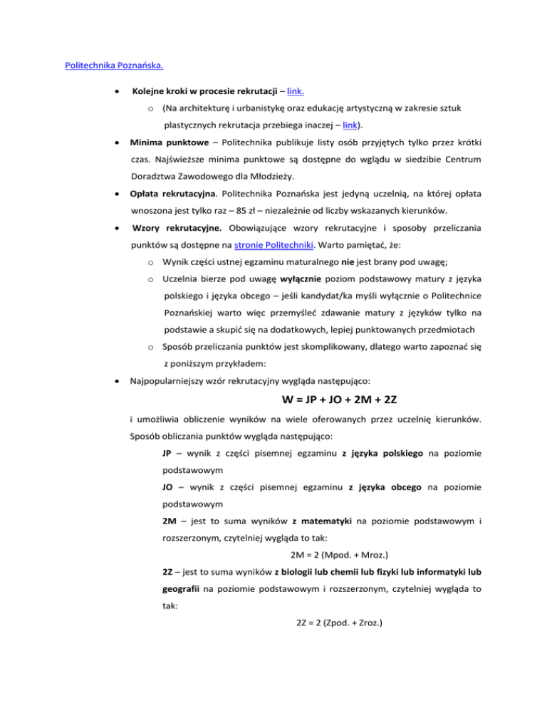 Politechnika Poznańska. Kolejne kroki w procesie rekrutacji – link. o (Na architekturę i urbanistykę oraz edukację artystyczną w zakresie sztuk plastycznych rekrutacja przebiega inaczej – link). Minima punktowe – Politechnika publikuje listy osób przyjętych tylko przez krótki czas. Najświeższe minima punktowe są dostępne do wglądu w siedzibie Centrum Doradztwa Zawodowego dla Młodzieży. Opłata rekrutacyjna. Politechnika Poznańska jest jedyną uczelnią, na której opłata wnoszona jest tylko raz – 85 zł – niezależnie od liczby wskazanych kierunków. Wzory rekrutacyjne. Obowiązujące wzory rekrutacyjne i sposoby przeliczania punktów są dostępne na stronie Politechniki. Warto pamiętać, że: o Wynik części ustnej egzaminu maturalnego nie jest brany pod uwagę; o Uczelnia bierze pod uwagę wyłącznie poziom podstawowy matury z języka polskiego i języka obcego – jeśli kandydat/ka myśli wyłącznie o Politechnice Poznańskiej warto więc przemyśleć zdawanie matury z języków tylko na podstawie a skupić się na dodatkowych, lepiej punktowanych przedmiotach o Sposób przeliczania punktów jest skomplikowany, dlatego warto zapoznać się z poniższym przykładem: Najpopularniejszy wzór rekrutacyjny wygląda następująco: W = JP + JO + 2M + 2Z i umożliwia obliczenie wyników na wiele oferowanych przez uczelnię kierunków. Sposób obliczania punktów wygląda następująco: JP – wynik z części pisemnej egzaminu z języka polskiego na poziomie podstawowym JO – wynik z części pisemnej egzaminu z języka obcego na poziomie podstawowym 2M – jest to suma wyników z matematyki na poziomie podstawowym i rozszerzonym, czytelniej wygląda to tak: 2M = 2 (Mpod. + Mroz.) 2Z – jest to suma wyników z biologii lub chemii lub fizyki lub informatyki lub geografii na poziomie podstawowym i rozszerzonym, czytelniej wygląda to tak: 2Z = 2 (Zpod. + Zroz.) UWAGA: według zasad nowej matury nie określa się poziomu z przedmiotu dodatkowego, przyjmuje się, że maturzysta zdaje na dawnym poziomie rozszerzonym. Dlatego też „wirtualny” poziom podstawowy należy sobie obliczyć według dodatkowego wzoru: Jeśli wynik rozszerzenia wynosi 29% lub mniej, to „wirtualna” podstawa będzie dwukrotnością wyniku z rozszerzenia, czyli: Podstawa = 2xRozszerzenie Jeśli wynik rozszerzenia wynosi 30% lub więcej, to „wirtualną podstawę wylicza się ze wzoru: Podstawa = 0,5 rozszerzenia + 50 pkt. Przykład: Twoje wyniki matury to: Przemiot: Język polski Język obcy Matematyka Geografia Poziom podstawowy: 60% 80% 80% Poziom rozszerzony: 82% 50% 60% Chcesz studiować logistykę, a zatem Twój wzór rekrutacji to: W = JP + JO + 2M + 2Z A zatem: W = 60 (język polski w podstawie) + 80 (język obcy w podstawie, nie ma znaczenia, że rozszerzenie zdałeś/aś lepiej) + 2x(80+50) (matematyka na poziomie podstawowym oraz rozszerzonym) + 2x(80+60) (geografia na „wirtualnym” poziomie podstawowym, obliczonym ze wzoru, oraz na poziomie rozszerzonym) = 60 + 80 + 260 + 280 = 680 UWAGA: matematykę, mimo że realnie zdawałeś/aś ją na podstawie, i tak możesz wyliczyć „wirtualnie”; jeśli wynik „wirtualnej” podstawy wyjdzie Ci lepszy, niż rzeczywistej, wtedy do wzoru liczy się wynik lepszy. Tak więc, w przypadku powyższych wyników: Podstawa z matematyki = 0,5rozszerzenia + 50 = 25 + 50 = 75 Zatem w tym wypadku „wirtualna” podstawa nie będzie korzystniejsza, gdyż realny wynik był lepszy, wynosił 80 punktów.