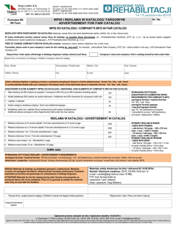SWIFT: PKOPPLPW Nr konta: PL 03 1240 2470 1111 0010 3424 2280 SWIFT: WBKPPLPP Nr konta: PL 80 1090 2688 0000 0001 0728 2338 Formularz RK RK Form Nr / No WPIS I REKLAMA W KATALOGU TARGOWYM ADVERTISEMENT FOR FAIR CATALOG WPIS DO KATALOGU / COMPANY’S INFO IN FAIR CATALOG BEZPŁATNY WPIS PODSTAWOWY DO KATALOGU obejmuje: nazwę firmy oraz dane teleadresowe (adres, telefon, fax, e-mail, strona www) W miarę możliwości prosimy zapisać nazwę firmy do katalogu na zasadzie słowa kluczowego, np.: „Przedsiębiorstwo Handlowe „XYZ” sp. z o.o.”, wg tej zasady będzie wyglądać w alfabetycznym spisie wystawców następująco: „XYZ Przedsiębiorstwo Handlowe sp. z o.o.” FREE OF CHARGE COMPANY’S INFO IN CATALOG contains: company’s name, adress, telephone, fax, e-mail, www If possible, please write in your company’s name for fair catalog by „key word”, for example.: „International Tade Company „XYZ” Ltd.”, will be written in this way: „XYZ International Trade Company Ltd.” Nazwę firmy i treść wpisu ofertowego w katalogu targowym należy umieścić pod literą: Company’s name and company’s info in catalog should be held under letter Nazwa firmy w brzmieniu do katalogu / Exibitor’s company name for catalog: Ulica / Street: Kod pocztowy / Postal code: Miasto / City: Kraj / Country: Telefon / Phone: Fax: E-mail: www: Celem uniknięcia błędów w katalogu prosimy o przesłanie powyższych danych w formie elektronicznej - format *txt, *doc, *odt, *docx) To avoid potential doubts with your company’s info please send us the data listed above in electronic format - *txt, *doc, *odt, *docx) DODATKOWE PŁATNE ELEMENTY WPISU DO KATALOGU / ADDITIONAL PAID ELEMENTS OF COMPANY’S INFO IN FAIR CATALOG: 1. Wpis ofertowy do 200 znaków ze spacjami / Company’s offer info up to 200 characters including spaces 100 2. Każde dodatkowe 200 znaków we wpisie ofertowym / Additional next 200 characters for companys’s offer info 100 3. Logotyp / Logotype 50 4. Każdy następny dodatkowy logotyp / Each next additional logotype 30 5. Dodatkowy adres (np. oddziału firmy) zamieszczony pod wpisem podstawowym Additional adress (company’s other departments) held under the main adress 20 WYMAGANIA DOTYCZĄCE DODATKOWYCH ELEMENTÓW WPISU REQUIREMENTS FOR COMPANY’S INFO: wymagane formaty / required formats: *txt, *doc, *odt, *docx wymagane formaty logotypu / required logotype formats: *jpg, *tif, *cdr (zamieniony na krzywe / converted to curves), *pdf (zamieniony na krzywe i spłaszczony / flatten) REKLAMA W KATALOGU / ADVERTISEMENT IN CATALOG 1. Reklama kolorowa na IV stronie okładki / Full color advertisement on IV cover’s page 1200 2. Reklama kolorowa na II, III stronie okładki / Full color advertisement on II, III cover’s page 1000 3. Reklama kolorowa 1 str. / Full color advertisement 1 page 400 4. Reklama kolorowa 1/2 str. / Full color advertisement 1/2 page 200 5. Reklama czarno-biała 1 str. / Black&white 1 page - 6. Reklama czarno-biała 1/2 str. / Black&white 1/2 page - SUMA netto WYMIARY REKLAM W RAMCE / SIZES WITH FRAMES: - cała strona / full page – 148 x 210 mm (szer. x wys. / width x height) - 1/2 strony / half page - 148 x 105 mm (szer. x wys./ width x height) WYMIARY REKLAM ZE SPADEM / SIZES WITH DROP - cała strona / full page – 148 x 210 + 3 mm na spad z każdej strony / +3mm drop - 1/2 strony / half page - 148 x 105+ 3 mm na spad z każdej strony / +3mm drop WYMAGANIA DOTYCZĄCE REKLAMY / ADVERTISEMENT’S REQUIREMENTS: wymagane formaty / required formats: *tiff (bez kompresji / uncompressed), *cdr, *pdf (spłaszczony, czcionki zamienione na krzywe / flatten, fonts as curves) właściwości / properties: rozdzielczość bitmap / bitmaps downsampling 300 dpi, czcionki zamienione na krzywe / curved fonts, tryb kolorów / color palette CMYK UWAGA! Materiały do katalogu są projektami gotowymi i ostatecznymi. Materiały o innych niż wymagane formatach i właściwościach nie będą umieszczane. Przesłanie materiałów po terminie nie gwarantuje ich umieszczenia w katalogu targowym. ATTENTION! Materials for the fair catalog having other formats and properties as mentioned above will not be published. There is no guaranty to publish the materials when they are sent after the deadline. Pieczęć firmy i podpis prawnie wiążący / Exhibitor’s stamp and legally binding signature Materiały należy dostarczyć do dnia / delivered till 14.09.2016r.: Nośniki / Electronic mediums: CD-R, CD-RW, DVD lub / or e-mail: [email protected] (max 10 MB), FTP: host: ftp.targi.lublin.pl; użytkownik / user: reklama; hasło / password: Targi.Reklama Miejscowość i data / Place and date of signing Uwagi koordynatora targów: Zgłoszenia prosimy nadsyłać do dnia / Application deadline 14.09.2016 r. ul. Dworcowa 11 (Park Ludowy), 20-406 Lublin, tel. +48 81 458 15 38 fax +48 81 458 15 02, e-mail; [email protected] Zgodnie z ustawą z dnia 18.07.2002 r. (Dz.U. nr 144 poz.1204) o świadczeniu usług drogą elektroniczną, wyrażam zgodę na otrzymywanie informacji marketingowych od firmy Targi Lublin S.A. drogą elektroniczną na ww adres e-mail./ I hereby declare my consent to receive marketing information from Lublin Fair JSC on a/m e-mail address (according to Act on Electronic Service Providing of 18 th July 2002 published in Journal of Laws no 144 item 1204)
