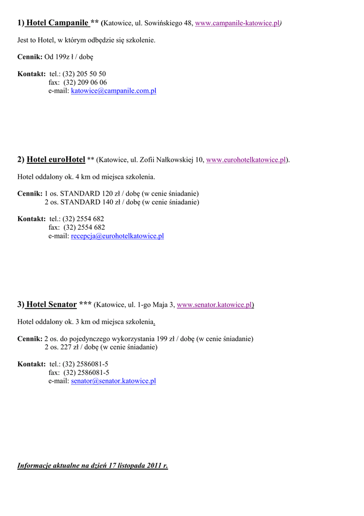 1) Hotel Campanile ** (Katowice, ul. Sowińskiego 48, www.campanile-katowice.pl) Jest to Hotel, w którym odbędzie się szkolenie. Cennik: Od 199z ł / dobę Kontakt: tel.: (32) 205 50 50 fax: (32) 209 06 06 e-mail: [email protected] 2) Hotel euroHotel ** (Katowice, ul. Zofii Nałkowskiej 10, www.eurohotelkatowice.pl). Hotel oddalony ok. 4 km od miejsca szkolenia. Cennik: 1 os. STANDARD 120 zł / dobę (w cenie śniadanie) 2 os. STANDARD 140 zł / dobę (w cenie śniadanie) Kontakt: tel.: (32) 2554 682 fax: (32) 2554 682 e-mail: [email protected] 3) Hotel Senator *** (Katowice, ul. 1-go Maja 3, www.senator.katowice.pl) Hotel oddalony ok. 3 km od miejsca szkolenia. Cennik: 2 os. do pojedynczego wykorzystania 199 zł / dobę (w cenie śniadanie) 2 os. 227 zł / dobę (w cenie śniadanie) Kontakt: tel.: (32) 2586081-5 fax: (32) 2586081-5 e-mail: [email protected] Informacje aktualne na dzień 17 listopada 2011 r.