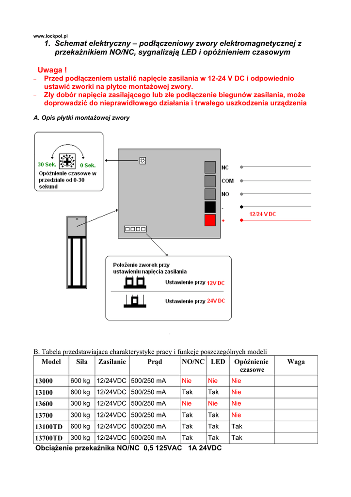 www.lockpol.pl 1. Schemat elektryczny – podłączeniowy zwory elektromagnetycznej z przekażnikiem NO/NC, sygnalizają LED i opóźnieniem czasowym Uwaga ! − − Przed podłączeniem ustalić napięcie zasilania w 12-24 V DC i odpowiednio ustawić zworki na płytce montażowej zwory. Zły dobór napięcia zasilającego lub złe podłączenie biegunów zasilania, może doprowadzić do nieprawidłowego działania i trwałego uszkodzenia urządzenia A. Opis płytki montażowej zwory B. Tabela przedstawiajaca charakterystyke pracy i funkcje poszczególnych modeli Model Siła Zasilanie Prąd NO/NC LED Opóźnienie czasowe 13000 600 kg 12/24VDC 500/250 mA Nie Nie Nie 13100 600 kg 12/24VDC 500/250 mA Tak Tak Nie 13600 300 kg 12/24VDC 500/250 mA Nie Nie Nie 13700 300 kg 12/24VDC 500/250 mA Tak Tak Nie 13100TD 600 kg 12/24VDC 500/250 mA Tak Tak Tak Tak Tak 13700TD 300 kg 12/24VDC 500/250 mA Obciążenie przekaźnika NO/NC 0,5 125VAC 1A 24VDC Tak Waga 2. Schemat szczegółowy działania przekaźnika NO/NC i Sygnalizacji LED Jeżeli do zwory elektromagnetycznej nie podamy zasilanie przekażnik NO/NC przekaże sygnał DRZWI OTWARTE natomiast sygnalizacja LED nie przekaże żadnego sygnału świetlnego.