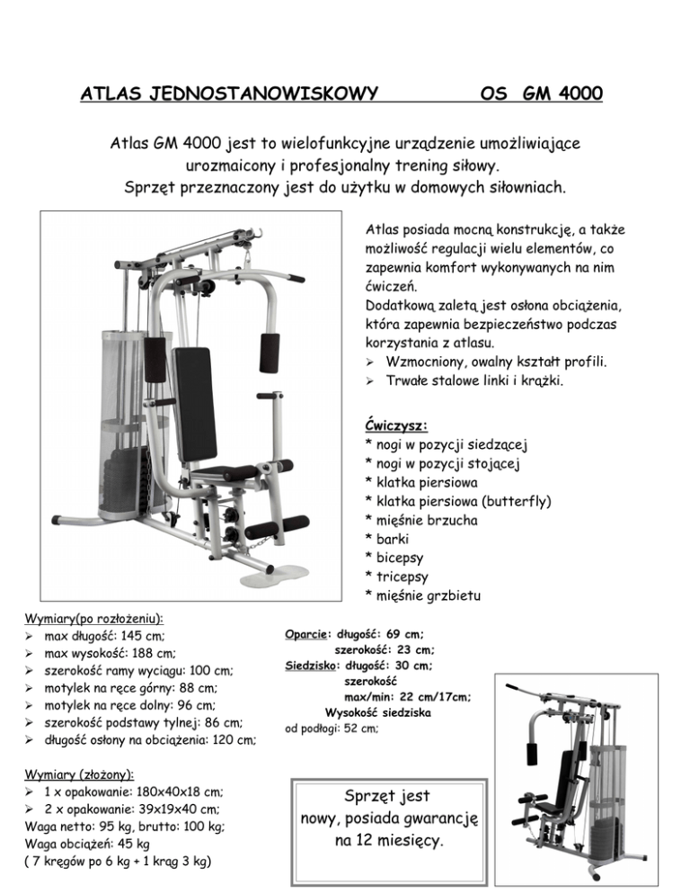 ATLAS JEDNOSTANOWISKOWY OS GM 4000 Atlas GM 4000 jest to wielofunkcyjne urządzenie umożliwiające urozmaicony i profesjonalny trening siłowy. Sprzęt przeznaczony jest do użytku w domowych siłowniach. Atlas posiada mocną konstrukcję, a także możliwość regulacji wielu elementów, co zapewnia komfort wykonywanych na nim ćwiczeń. Dodatkową zaletą jest osłona obciążenia, która zapewnia bezpieczeństwo podczas korzystania z atlasu. Wzmocniony, owalny kształt profili. Trwałe stalowe linki i krążki. Ćwiczysz: * nogi w pozycji siedzącej * nogi w pozycji stojącej * klatka piersiowa * klatka piersiowa (butterfly) * mięśnie brzucha * barki * bicepsy * tricepsy * mięśnie grzbietu Wymiary(po rozłożeniu): max długość: 145 cm; max wysokość: 188 cm; szerokość ramy wyciągu: 100 cm; motylek na ręce górny: 88 cm; motylek na ręce dolny: 96 cm; szerokość podstawy tylnej: 86 cm; długość osłony na obciążenia: 120 cm; Wymiary (złożony): 1 x opakowanie: 180x40x18 cm; 2 x opakowanie: 39x19x40 cm; Waga netto: 95 kg, brutto: 100 kg; Waga obciążeń: 45 kg ( 7 kręgów po 6 kg + 1 krąg 3 kg) Oparcie: długość: 69 cm; szerokość: 23 cm; Siedzisko: długość: 30 cm; szerokość max/min: 22 cm/17cm; Wysokość siedziska od podłogi: 52 cm; Sprzęt jest nowy, posiada gwarancję na 12 miesięcy.