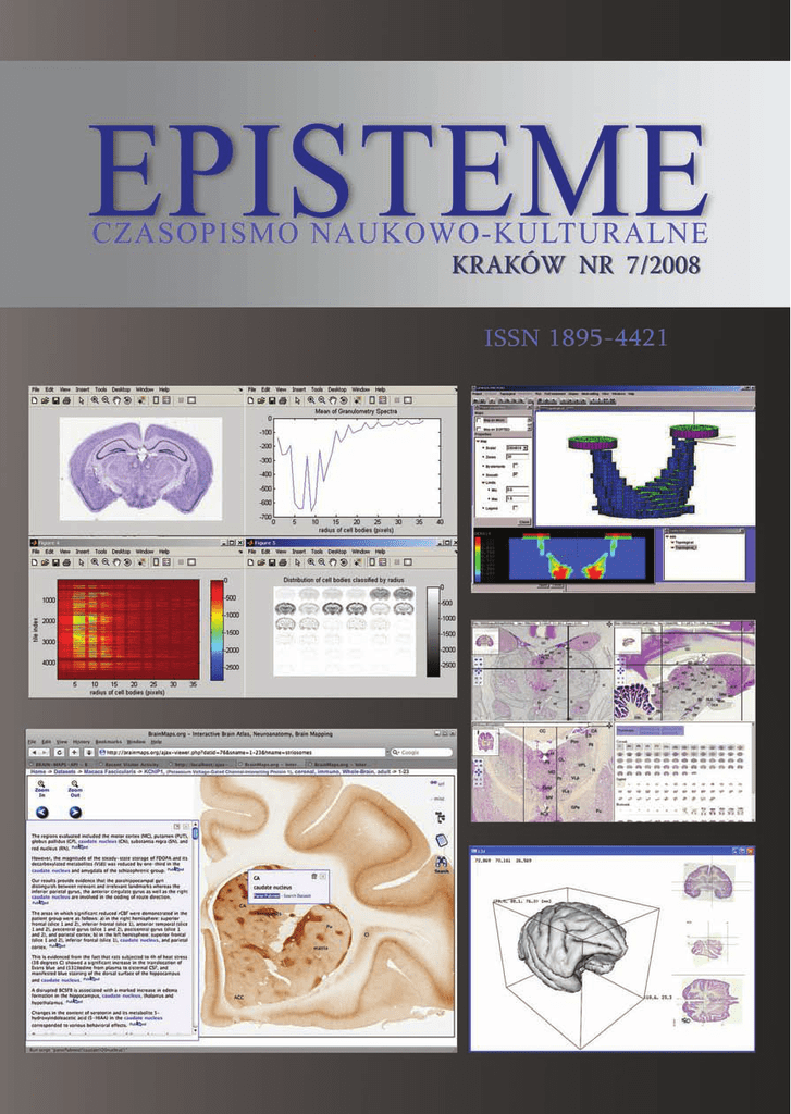 ISSN 1895-4421 EPISTEME CZASOPISMO NAUKOWO-KULTURALNE KRAKÓW NR 7/2008 EPISTEME CZASOPISMO NAUKOWO-KULTURALNE Redakcja: Zdzisław Szczepanik (red. naczelny) Katarzyna Daraż-Duda (sekretarz redakcji) Grzegorz Chajko Krzysztof Duda Rada Naukowa: Prof. dr hab. Michał Śliwa Prof. dr hab. inż. Ryszard Tadeusiewicz Prof. dr hab. med. Jan Trąbka Prof. dr hab. Bogdan Zemanek Prof. Edward Dobrzański Prof. Bogumiła Lutak-Modrinić Prof. Ignatianum i UJ, dr hab. Józef Bremer SJ Prof. AGH, dr hab. Mirosław Głowacki Prof. UJ, dr hab. Hanna Kowalska-Stus Ks. Prof. PAT, dr hab. Władysław Zuziak Okładka: Okna programów prezentowanych w pracach. Od lewej strony: aplikacja BrainMaps Analyze, aplikacja GENESIS, cyfrowy atlas BrainMaps oraz program BrainMaps B3D. Wydawca: Stowarzyszenie Twórców Nauki i Kultury „Episteme” ul. Batorego 20/la 31-135 Kraków © Stowarzyszenie Twórców Nauki i Kultury „Episteme” i Autorzy Szanowni Państwo, W siódmym numerze czasopisma naukowo-kulturalnego Episteme zebrane są przede wszystkim prace prezentujące dorobek nowej dziedziny nauki – neuroinformatyki. Szczególne miejsce zajmują tutaj badania eksperymenttalne ruchu gałek ocznych. Tematyka ta przedstawiona jest w dwóch pierwszych pracach. Nauki humanistyczne obecne są w dwóch kolejnych artykułach, w których rozważana jest rola i zakres filozofii przyrody. Następnie są prace szczegółowo podejmujące zagadnienia związane z neuroinformatyką, tj. problemy definicyjne, a także pokazane są najważniejsze realizacje wykonane na jej gruncie. Numer kończą recenzje książek. Serdecznie zapraszamy do lektury. Redakcja Piotr Augustyniak EPISTEME 7/2008 s.5-18 ISSN 1895-4421 BADANIE PRAWDOPODOBIEŃSTWA DOSTRZEŻENIA OBIEKTÓW Z ZASTOSOWANIEM ANALIZY ŚCIEŻKI WZROKOWEJ Streszczenie: Artykuł przedstawia badanie wpływu atrybutów obiektu na prawdopodobieństwo jego dostrzeżenia przez obserwatora przeprowadzone w kontekście fizjologii widzenia człowieka. Zarządzanie wyrazistością poszczególnych elementów sceny jest podstawą wiodących aplikacji społeczeństwa informacyjnego opartych na wizyjnym interfejsie człowiek-maszyna, projektowania witryn sieciowych i ergonomii. Choć zasady percepcji wizualnej człowieka są stosowane od setek lat w sztuce (malarstwo, rzeźba, architektura), ich znajomość nabiera szczególnego znaczenia dla pochwycenia i utrzymania uwagi obserwatora i hierarchizowania przekazu informacji. Podczas eksperymentu z zastosowaniem zadań wizualnych używano progresywnie modyfikowanych obrazów naturalnych. Dodawane szczegóły były opisane atrybutami barwy, położenia oraz rozmiaru, a ich spostrzeżenie przez obserwatora było wykrywane w zapisie trajektorii ruchu oka. Analiza statystyczna punktów skupienia uwagi pozwoliła określić korelacje prawdopodobieństwa dostrzeżenia obiektu i jego atrybutów korelacje te, określone wyłącznie przy pomocy badań nieinwazyjnych są potwierdzone przez budowę anatomiczną siatkówki oka i fizjologię widzenia. 5 Piotr Augustyniak 1. Wstęp Informacja wizualna odgrywa obecnie zasadniczą rolę w wielu aspektach życia. Konkurencja źródeł i hierarchia informacji budowana przez obserwatora jest zwykle uzasadniona prawdopodobieństwem dostrzeżenia (wyrazistością) obiektu. [1-2]. Dlatego prawidłowa kontrola wyrazistości ma zasadnicze znaczenie w wielu zastosowaniach przekazu wizualnego, w tym projektowania plakatów reklamowych, witryn sieciowych, interfejsów człowiek-komputer oraz w ergonomii. Projektant jest nie tylko artystą dbającym o estetykę witryny, ale także menadżerem przekazu informacji ustalającym prawdopodobną kolejność ich odbioru, a zatem i hierarchię w umyśle odbiorcy. Użycie monitorów komputerowych, projektorów i wyświetlaczy wielkoekranowych ułatwia elastyczną aranżację elementów przekazu wizualnego, co uzasadnia potrzebę powszechnej znajomości podstaw percepcji człowieka u projektantów [3-5]. Interesującym przykładem technicznego wykorzystania własności percepcji są algorytmy kompresji wideo i obrazów statycznych. Prowadzone w Laboratorium Biocybernetyki AGH badania mają na celu określenie związku atrybutów elementów obrazu (rozmiaru, barwy i położenia) z prawdopodobieństwem ich dostrzeżenia. Użyta metodyka zadań wizualnych jest znacznie mniej dokładna niż mapowanie pola wizyjnego w pracowni oftalmologicznej, ustępuje także analizie potencjałów aktywacyjnych rejestrowanych za pomocą mikroelektrod z izolowanej siatkówki. Niemniej za jej stosowaniem przemawia możliwość użycia naturalnych obrazów i obiektów, ich wzajemnych kontekstów oraz zaciekawienia obserwatora, które manifestuje się spontanicznym poszukiwaniem informacji wizyjnych. Dzięki temu, analiza postrzegania nie została ograniczona do aspektu fizjologii siatkówki, ale zawiera również wpływ procesu kognitywnego składającego się z częściowo współbieżnych, a częściowo naprzemiennych epizodów pozyskiwania i interpretacji informacji wizualnej [6-8]. Podejście to jest szczególnie interesujące z punktu widzenia zastosowań (projektowanie reklam i witryn, interfejsy człowiek-maszyna i ergonomia) ponieważ pozwala na oszacowanie wyrazistości konkretnych obiektów sceny przez wybraną grupę obserwatorów z użyciem wyłącznie metod nieinwazyjnych. Pomimo znaczącego wpływy subiektywnego czynnika percepcji na wyniki eksperymentów wizualnych, uzasadnienie ich rezultatów jest zbieżne z aktualną wiedzą o budowie siatkówki oka i fizjologii percepcji człowieka [9-10]. 6 Badanie prawdopodobieństwa dostrzeżenia obiektów z zastosowaniem analizy ścieżki wzrokowej 2. Materiały i metody Metodologia zadań wizualnych zakłada wstępne wyposażenie obserwatora w standaryzowany zasób wiedzy i umotywowanie go do poszukiwania uzupełnień w przedstawionej scenie, niekiedy z nałożeniem dodatkowych ograniczeń czasowych. Obserwator staje się zatem obiektem t