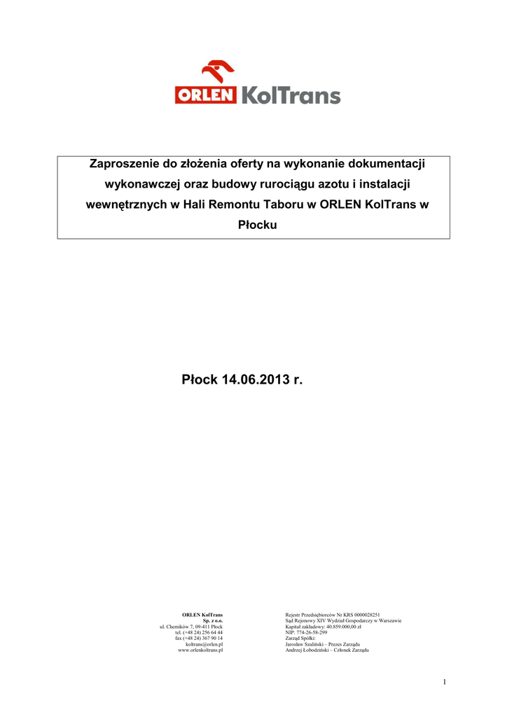 Zaproszenie do złożenia oferty na wykonanie dokumentacji wykonawczej oraz budowy rurociągu azotu i instalacji wewnętrznych w Hali Remontu Taboru w ORLEN KolTrans w Płocku Płock 14.06.2013 r. ORLEN KolTrans Sp. z o.o. ul. Chemików 7, 09-411 Płock tel. (+48 24) 256 64 44 fax (+48 24) 367 90 14 [email protected] www.orlenkoltrans.pl Rejestr Przedsiębiorców Nr KRS 0000028251 Sąd Rejonowy XIV Wydział Gospodarczy w Warszawie Kapitał zakładowy: 40.859.000,00 zł NIP: 774-26-58-299 Zarząd Spółki: Jarosław Szaliński – Prezes Zarządu Andrzej Łobodziński – Członek Zarządu 1 I. Zamawiający : ORLEN KolTrans Sp. z o.o. 09-411 Płock Ul. Chemików 7 NIP: 774-26-58-299 http://www.orlenkoltrans.pl, II. Opis przedmiotu zamówienia/specyfikacja. Postępowanie prowadzone jest według wewnętrznych procedur obowiązujących w ORLEN KolTrans Sp. z o.o. Przedmiotem zapytania jest: 1. Budowa rurociągu azotu od istniejącej instalacji zlokalizowanej na estakadzie przy budynku dyspozytora kolejowego do Hali Remontu Taboru. Zakres prac: • Ułożenie rurociągu w istniejącym, krytym kanale pod drogą wewnętrzną oraz wprowadzenie do hali. • Rozebranie drogi i pokryw kanału oraz ich odbudowa. • Montaż licznika na rurociągu. 2. Budowa instalacji rurociągu azotu z wyprowadzeniem na sześć stanowisk przy torze nr 240 wewnątrz Hali Remontu Taboru. 3. Przebudowa instalacji wody p.poż wewnątrz Hali Remontu Taboru; Zakres prac: • Zabudowa licznika poboru wody oraz filtrów oczyszczających. • Montaż króćców poboru wody. III. Wymogi formalne 1. Warunkiem przyjęcia oferty jest przedłożenie części technicznej i części handlowej w oddzielnych zamkniętych opisanych kopertach. Oferty nie spełniające powyższego nie będą rozpatrywane i zostaną odesłane do nadawcy. 2. Oferta musi być kompletna. 3. Zamawiający nie dopuszcza składania ofert częściowych. 4. W cenie oferty należy uwzględnić wszystkie koszty. 5. Przed złożeniem oferty należy dokonać oględzin miejsca wykonania przedmiotu zamówienia, po wcześniejszym telefonicznym uzgodnieniu terminu z Panem Włodzimierzem Plichtą – tel. kont. 607 380 313 6. Dokumentacja na wykonanie przedmiotu zamówienia zostanie przekazana podczas wizji lokalnej. 7. Odbiór usługi nastąpi na podstawie „Protokołu Odbioru”. 8. W przypadku gdy złożona oferta nie spełnienia wymogów zawartych w zapytaniu – zostanie odrzucona. 2 Część techniczna oferty: 1. Nazwa firmy, adres, telefon kontaktowy, fax. 2. Nazwiska osób reprezentujących firmę. Odpis z Krajowego Rejestru Sądowego, w przypadku spółek Prawa Handlowego, lub zaświadczenie o wpisie do ewidencji działalności gospodarczej w przypadku osób fizycznych. 3. Decyzja w sprawie nadania nr Identyfikacji Podatkowej NIP. 4. Podpisane Oświadczenie oferentów PZSZ07/F01 – załącznik nr 1. 5. Wskazanie osoby do kontaktu sprawującej nadzór nad ofertą. 6. Termin ważności oferty (nie krócej niż 3 m-ce). 7. Referencje z wykonywanych tego typu usług z ostatnich 3 lat. 8. Deklaracja wykonania usługi do 31.07.2013r. Część handlowa oferty: 1. Cena w PLN za kompleksową usługę. 2. Deklarację niezmienności cen w trakcie realizacji przedmiotu zakupu. 3. Sposób rozliczenia – po wykonaniu kompleksowej usługi z uwzględnieniem 45 dniowego terminu płatności faktur od daty wystawienia.(zeskanowana faktura powinna być przesłana drogą elektroniczną w dniu wystawienia na wskazany adres e-mail). 4. Gwarancja Kryteria wyboru ofert • Cena Pytania dodatkowe dotyczące zakresu ogłoszonej akcji ofertowej prosimy przesyłać na adres e-mail: • [email protected] Odpowiedź będzie przekazywana tą samą droga. IV. Sposób złożenia oferty Oferta powinna być podpisana przez osoby uprawnione do reprezentowania firmy i składać się z dwóch części – technicznej i handlowej. Ofertę należy przedłożyć w opisanej i zamkniętej kopercie w terminie do dnia 28-062013 roku do godz. 15.00 w sekretariacie Prezesa Zarządu ORLEN KolTrans Sp. z o.o., ul. Chemików 7, 09-411 Płock. Na kopercie należy podać nazwę, dokładny adres Oferenta oraz tytuł zaproszenia do składania ofert z dopiskiem „akcja ofertowa na wykonanie dokumentacji wykonawczej oraz budowy rurociągu azotu i instalacji wewnętrznych w Hali Remontu Taboru w ORLEN KolTrans w Płocku. V. Zastrzeżenia zapraszającego do składania ofert. ORLEN KolTrans Sp. z o.o. zastrzega sobie prawo do: 1. Wyboru oferenta wg przedstawionych kryteriów oceny. 3 2. Możliwość odstąpienia od procedury wyboru oferty bez podania przyczyn, 3. Zmiany ilości przedmiotu zamówienia. 4. Dokonania korekt i uściśleń zakresu w trakcie analizy ofert, proszenia o ewentualną jego aktualizację. 5. Przeprowadzenie dodatkowych negocjacji cen. Ponadto informuję się, że oferentowi nie przysługują żadne roszczenia z tytułu odrzucenia jego oferty lub nie wybrania oferty, oraz że nie przewiduje się trybu odwoławczego od dokonanego wyboru oferenta. Oferent ponosi wszystkie koszty związane z przygotowaniem i złożeniem oferty i nie przysługuje mu prawo do zwrotu tych kosztów. ORLEN KolTrans Sp. z o.o. zastrzega sobie prawo do dowolnego wyboru podmiotu/podmiotów, z którymi będą prowadzone negocjacje w odniesieniu do części lub całości zakresu złożonych odpowiedzi oraz do zawarcia umowy z więcej niż jednym Dostawcą wyłonionym w drodze negocjacji, przy czym zakres umowy może obejmować całość lub część zakresu złożonej odpowiedzi na zapytanie ofertowe. Z poważaniem Przewodniczący Zespołu Oceniającego Tomasz Maliszewski 4 Załącznik nr 1 PZSZ07/F01 Oświadczenie Oferenta Dotyczy: postępowania zakupowego na wykonanie dokumentacji wykonawczej oraz budowy rurociągu azotu i instalacji wewnętrznych w Hali Remontu Taboru w ORLEN KolTrans w Płocku. Oświadczam, że reprezentowana przeze mnie FIRMA: a) Jest uprawiona do występowania w obrocie prawnym, zgodnie z wymaganiami us