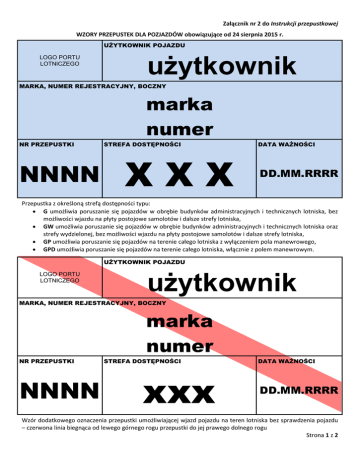 Załącznik nr 2 do Instrukcji przepustkowej WZORY PRZEPUSTEK DLA POZJAZDÓW obowiązujące od 24 sierpnia 2015 r. UŻYTKOWNIK POJAZDU LOGO PORTU LOTNICZEGO użytkownik MARKA, NUMER REJESTRACYJNY, BOCZNY marka numer NR PRZEPUSTKI NNNN STREFA DOSTĘPNOŚCI XXX DATA WAŻNOŚCI DD.MM.RRRR Przepustka z określoną strefą dostępności typu: G umożliwia poruszanie się pojazdów w obrębie budynków administracyjnych i technicznych lotniska, bez możliwości wjazdu na płyty postojowe samolotów i dalsze strefy lotniska, GW umożliwia poruszanie się pojazdów w obrębie budynków administracyjnych i technicznych lotniska oraz strefy wydzielonej, bez możliwości wjazdu na płyty postojowe samolotów i dalsze strefy lotniska, GP umożliwia poruszanie się pojazdów na terenie całego lotniska z wyłączeniem pola manewrowego, GPD umożliwia poruszanie się pojazdów na terenie całego lotniska, włącznie z polem manewrowym. UŻYTKOWNIK POJAZDU LOGO PORTU LOTNICZEGO użytkownik MARKA, NUMER REJESTRACYJNY, BOCZNY marka numer NR PRZEPUSTKI NNNN STREFA DOSTĘPNOŚCI xxx DATA WAŻNOŚCI DD.MM.RRRR Wzór dodatkowego oznaczenia przepustki umożliwiającej wjazd pojazdu na teren lotniska bez sprawdzenia pojazdu – czerwona linia biegnąca od lewego górnego rogu przepustki do jej prawego dolnego rogu Strona 1 z 2 ZEZWOLENIE NA POSTÓJ W BEZPOŚREDNIM SĄSIEDZTWIE PORTU LOTNICZEGO obowiązujące od 24 sierpnia 2015 r. Strona 2 z 2