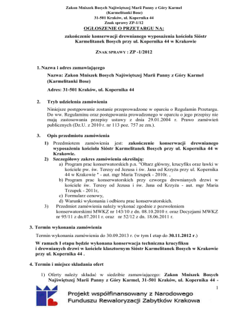 Zakon Mniszek Bosych Najświętszej Marii Panny z Góry Karmel (Karmelitanki Bose) 31-501 Kraków, ul. Kopernika 44 Znak sprawy ZP-1/12 OGŁOSZENIE O PRZETARGU NA: zakończenie konserwacji drewnianego wyposażenia kościoła Sióstr Karmelitanek Bosych przy ul. Kopernika 44 w Krakowie ZNAK SPRAWY : ZP -1/2012 1. Nazwa i adres zamawiającego Nazwa: Zakon Mniszek Bosych Najświętszej Marii Panny z Góry Karmel (Karmelitanki Bose) Adres: 31-501 Kraków, ul. Kopernika 44 2. Tryb udzielenia zamówienia Niniejsze postępowanie zostanie przeprowadzone w oparciu o Regulamin Przetargu. Do ww. Regulaminu oraz postępowania prowadzonego w oparciu o jego przepisy nie mają zastosowania przepisy ustawy z dnia 29.01.2004 r. Prawo zamówień publicznych (Dz.U. z 2010 r. nr 113 poz. 757 ze zm.). 3. Opis przedmiotu zamówienia 1) Przedmiotem zamówienia jest: zakończenie konserwacji drewnianego wyposażenia kościoła Sióstr Karmelitanek Bosych przy ul. Kopernika 44 w Krakowie. 2) Szczegółowy zakres zamówienia określają: a) Program prac konserwatorskich p.n. "Ołtarz główny, krucyfiks oraz ławki w kościele pw. św. Teresy od Jezusa i św. Jana od Krzyża przy ul. Kopernika 44 w Krakowie " - aut. mgr Maria Trzupek - 2010r. , b) Program prac konserwatorskich przy czworgu drewnianych drzwi w kościele św. Teresy od Jezusa i św. Jana od Krzyża - aut. mgr Maria Trzupek - 2011r, c) Formularz cenowy, d) Warunki wykonania i odbioru prac konserwatorskich. 3) Przedmiot zamówienia należy wykonać zgodnie z pozwoleniem konserwatorskimi MWKZ nr 143/10 z dn. 08.10.2010 r. oraz Decyzjami MWKZ nr 95/11 z dn.07.2011 r. oraz nr 52/12 z dn. 18.06.2011 r. 3. Termin wykonania zamówienia Termin wykonania zamówienia do 30.09.2013 r. (w tym I etap do 30.11.2012 r.) W ramach I etapu będzie wykonana konserwacja techniczna krucyfiksu i drewnianych drzwi w kościele klasztornym Sióstr Karmelitanek Bosych w Krakowie przy ul. Kopernika 44 . 4. Termin i miejsce składania ofert 1) Oferty należy składać w siedzibie zamawiającego: Zakon Mniszek Bosych Najświętszej Marii Panny z Góry Karmel, 31-501 Kraków, ul. Kopernika 44 1 Zakon Mniszek Bosych Najświętszej Marii Panny z Góry Karmel (Karmelitanki Bose) 31-501 Kraków, ul. Kopernika 44 Znak sprawy ZP-1/12 Furta. 2) Zamawiający będzie badał tylko te oferty, które wpłyną do Zamawiającego do dnia 04.09.2012 r. do godz. 11:00, na adres wskazany w pkt 1. Decydujące znaczenie dla oceny zachowania powyższego terminu ma data i godzina wpływu oferty do Zamawiającego, a nie data jej wysłania przesyłką pocztową czy kurierską. 5. Osoby upoważnione do kontaktów oraz sposób uzyskania dokumentacji przetargowej 1) Osobami upoważnionymi do kontaktowania się z wykonawcami są: W zakresie zagadnień merytorycznych – Barbara Ferdek, tel. 663 901 101, w godz. od 9.00 do 15:00 (pn. – pt.), W zakresie zagadnień proceduralnych – Barbara Kendziak, tel. 501 674 780, w godz. od 15:00 do18:00 (pn. – pt.). 2) Dokumentacja przetargowa tj. SIWZ z zał. od nr: 3 do 12 w wersji elektronicznej będzie do odbioru w siedzibie Zamawiającego, w godzinach funkcjonowania furty tj. od pn. do pt. w godz. 9.00-11.30 oraz 14.00 - 16.30, po uprzednim telefonicznym umówieniu, natomiast załączniki nr: 1 i 2 będą dostępne do wglądu w wersji papierowej, w siedzibie Zamawiającego również w godzinach funkcjonowania furty jw. po uprzednim telefonicznym umówieniu. 3) Osobą upoważnioną do wydawania SIWZ z zał. oraz jej udostępniania jest Matka Przełożona S. Cecylii Jagiencarz tel. 12 421 41 18. Kraków, 24.08.2012 r. 2