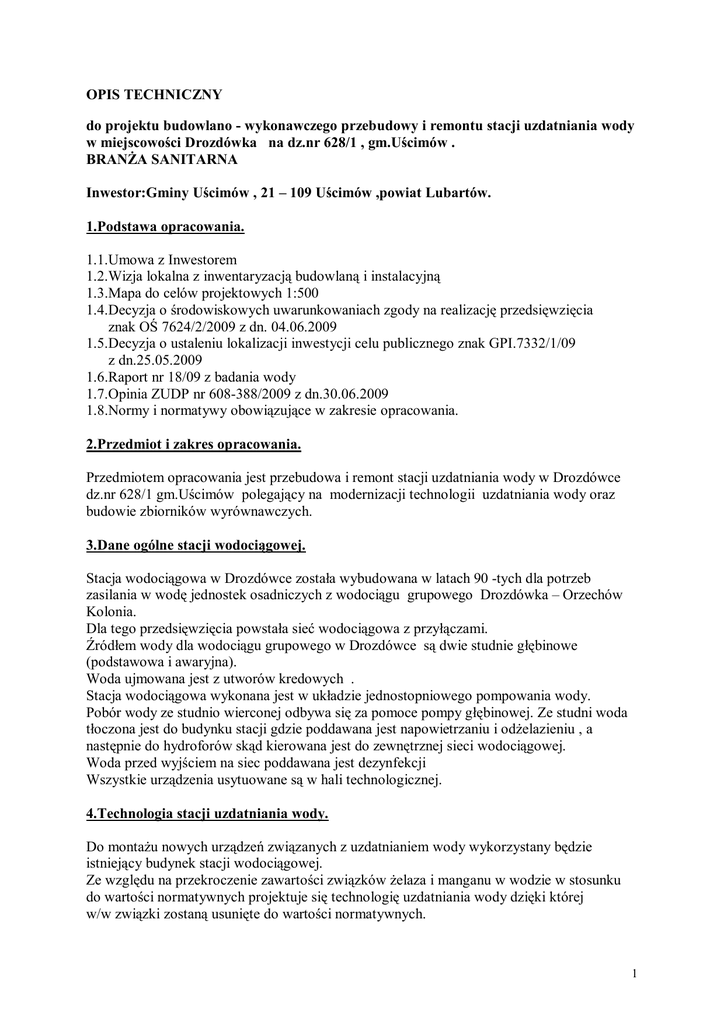 Przedmiotem opracowania jest przebudowa i remont stacji uzdatniania wody w Drozdówce