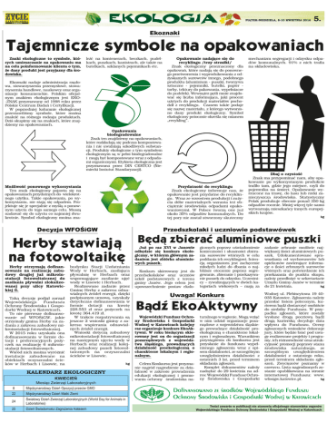PIĄTEK-NIEDZIELA, 8-10 KWIETNIA 2016 5. Ekoznaki Tajemnicze symbole na opakowaniach Znaki ekologiczne to symbole, których umieszczanie na opakowaniu ma na celu poinformowanie klienta o tym, że dany produkt jest przyjazny dla środowiska. leźć na kontenerach, beczkach, pudełkach, puszkach, kanistrach, ale także na butelkach, szklanych pojemnikach etc. Ekoznaki nadaje administracja rządowa, stowarzyszenia przemysłowe, stowarzyszenia handlowe, naukowcy oraz organizacje konsumenckie. Polskim oficjalnym znakiem ekologicznym jest EKO-ZNAK przyznawany od 1998 roku przez Polskie Centrum Badań i Certyfikacji. W poprzedniej kolumnie ekologicznej przestawiliśmy symbole, które można znaleźć na różnego rodzaju produktach. Dziś skupimy się na znakach, które znajdziemy na opakowaniach. Opakowanie nadające się do recyklingu /trzy strzałki/ Znak ekologiczny przeznaczony dla opakowań, które nadają się do ponownego przetworzenia i wyprodukowania z odzyskanych surowców innego, podobnego produktu (aluminium - puszki, tworzywa sztuczne - pojemniki, butelki, papier torby, tektury do pakowania, wypełniacze do pudełek). Wewnątrz pętli może znajdować się liczba informująca, jaki procent użytych do produkcji materiałów pochodził z recyklingu. Czasem także podaje się nazwę materiału, z którego wytworzono dany produkt ekologiczny. Symbol ekologiczny potocznie określa się mianem „recykling”. mechanizm segregacji i odzysku odpadów komunalnych. 91% z nich trafia na składowiska. Opakowania biodegradowalne Znak ten znajdziemy na opakowaniach, które rozkładają się podczas kompostowania i nie uwalniają szkodliwych substancji. Produkty ekologiczne z tym symbolem ekologicznym są w pełni biodegradowalne i mogą być kompostowane wraz z odpadami organicznymi. Etykieta ekologiczna jest przyznawana przez DIN CERTCO (Niemiecki Instutut Standaryzacji). Możliwość ponownego wykorzystania Ten znak ekologiczny pojawia się na opakowaniach przydatnych do wielokrotnego użytku. Takie opakowania, po wykorzystaniu, nie stają się odpadem. Projektuje się je specjalnie z myślą o ponownym użyciu do tego samego celu. Muszą nadawać się do użyciu co najmniej dwukrotnie. Symbol ekologiczny można zna- Przydatność do recyklingu Znak ekologiczny informuje nas, że opakowanie jest przydatne do recyklingu. Wraz ze wzrostem produkcji i zużycia dóbr materialnych wzrasta też obciążenie środowiska odpadami opakowaniowymi. W Polsce tworzą one już około 30% odpadów komunalnych. Do tej pory nie został stworzony skuteczny Decyzja WFOŚiGW Taką decyzję podjął zarząd Wojewódzkiego Funduszu Ochrony Środowiska i Gospodarki Wodnej w Katowicach. To nie pierwsze dofinansowanie od WFOŚiGW, jakie otrzymały gmina Herby na zadania z zakresu zabudowy mikroinstalacji fotowoltaicznej. W 2015 roku uzyskała ona dofinansowania w formie dotacji i preferencyjnych pożyczek na realizację 6 mikroinstalacji fotowoltaicznych. Wśród nich można wyróżnić instalacje zabudowane na obiektach oczyszczalni ścieków w Herbach i Lisowie, na budynku Stacji Uzdatniania Wody w Herbach, zasilająca pływalnię w Herbach oraz wspomagające zasilanie ujęć wody w Lisowie i Herbach. Realizowane zadanie przez Gminę Herby z zakresu odnawialnych źródeł energii, dzięki podpisanym umową, uzyskały dotychczas dofinansowania w formie dotacji na kwotę 228.553 zł oraz pożyczek na kwotę 364.419 zł. W trakcie rozpatrywania są jeszcze 2 wnioski gminy z zakresu wspierania odnawialnych źródeł energii. Wnioski dotyczą zabudowy mikroinstalacji fotowoltaicznej na następnym ujęciu wody w Herbach oraz realizacji kolejnej zabudowy paneli fotowoltaicznych na oczyszczalni ścieków w Lisowie. KALENDARZ EKOLOGICZNY KWIECIEŃ Miesiąc Zwierząt Laboratoryjnych 8 Międzynarodowy Dzień Opozycji przeciw GMO 22 Międzynarodowy Dzień Matki Ziemi 24 Światowy Dzień Zwierząt Laboratoryjnych (World Day for Animals in Laboratories) 25 Dzień Świadomości Zagrożenia Hałasem kg Przedszkolaki i uczniowie podstawówek Herby stawiają na fotowoltaikę Herby otrzymają dofinansowanie na realizację zabudowy drugiej już mikroinstalacji fotowoltaicznej do zasilania pływalni zlokalizowanej przy ulicy Katowickiej 6. Dbaj o czystość Znak ma przypominać nam, aby opakowanie po wykorzystanym produkcie trafiło tam, gdzie jego miejsce, czyli do pojemnika na śmieci. Opakowanie wyrzucone na trawę, do lasu lub rzeki zanieczyszcza środowisko. Statystyczny Polak produkuje obecnie ponad 350 kg odpadów rocznie. Mniej więcej tyle samo wytwarzają mieszkańcy innych europejskich krajów. kg Będą zbierać aluminiowe puszki Już po raz XVI w Janowie odbędzie się konkurs ekologiczny, w którym głównym zadaniem jest zbiórka aluminiowych puszek. Konkurs skierowany jest do przedszkolaków oraz uczniów szkół podstawowych z terenu gminy Janów. Jego celem jest upowszechnienie postaw ekolo- gicznych poprzez uświadomienie konieczności i słuszności zbierania surowców wtórnych w celu poddania ich recyklingowi. Intencją organizatora jest zachęcenie młodych ludzi do dbania o najbliższe otoczenie poprzez segregowanie, zbieranie i przekazywanie puszek do odzysku. Uczestnicy – rywalizujących w dwóch kategoriach wiekowych – mają za Uwaga! Konkurs Bądź EkoAktywny Wojewódzki Fundusz Ochrony Środowiska i Gospodarki Wodnej w Katowicach kolejny raz organizuje konkurs EkoAktywni. W roku bieżącym skierowany jest on do organizacji pozarządowych z województwa śląskiego, prowadzących działalność proekologiczną o charakterze lokalnym i regionalnym. Celem Konkursu jest przyznanie nagród nagrodzenie za działalność w zakresie prowadzenia edukacji ekologicznej i promowania ochrony środowiska na- turalnego w regionie. Mogą wziąć w nim udział organizacje pozarządowe z województwa śląskiego prowadzące działalność proekologiczną o charakterze lokalnym i regionalnym. Warunkiem przystąpienia do
