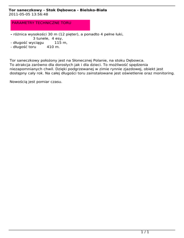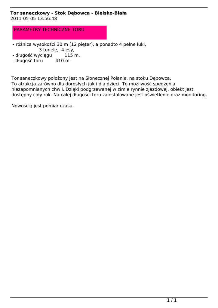 Tor saneczkowy - Stok Dębowca - Bielsko-Biała 2011-05-05 13:56:48 PARAMETRY TECHNICZNE TORU - różnica wysokości 30 m (12 pięter), a ponadto 4 pełne łuki, 3 tunele, 4 esy, - długość wyciągu 115 m, - długość toru 410 m. Tor saneczkowy położony jest na Słonecznej Polanie, na stoku Dębowca. To atrakcja zarówno dla dorosłych jak i dla dzieci. To możliwość spędzenia niezapomnianych chwil. Dzięki podgrzewanej w zimie rynnie zjazdowej, obiekt jest dostępny cały rok. Na całej długości toru zainstalowane jest oświetlenie oraz monitoring. Nowością jest pomiar czasu. 1/1