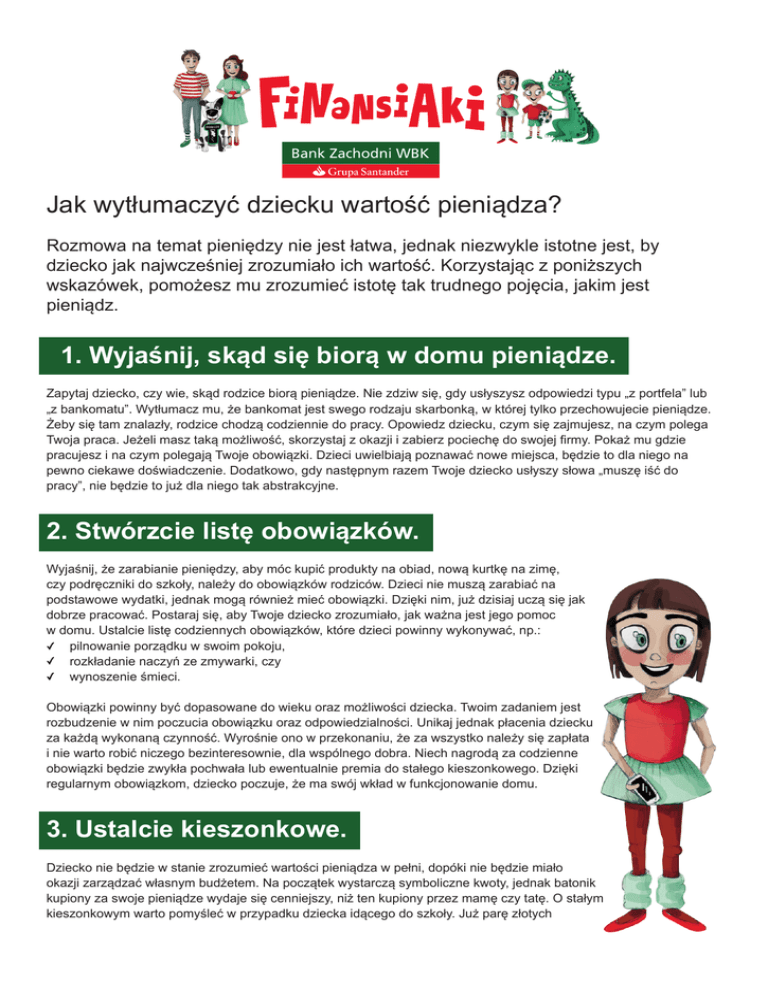 Jak wytłumaczyć dziecku wartość pieniądza? Rozmowa na temat pieniędzy nie jest łatwa, jednak niezwykle istotne jest, by dziecko jak najwcześniej zrozumiało ich wartość. Korzystając z poniższych wskazówek, pomożesz mu zrozumieć istotę tak trudnego pojęcia, jakim jest pieniądz. 1. Wyjaśnij, skąd się biorą w domu pieniądze. Zapytaj dziecko, czy wie, skąd rodzice biorą pieniądze. Nie zdziw się, gdy usłyszysz odpowiedzi typu „z portfela” lub „z bankomatu”. Wytłumacz mu, że bankomat jest swego rodzaju skarbonką, w której tylko przechowujecie pieniądze. Żeby się tam znalazły, rodzice chodzą codziennie do pracy. Opowiedz dziecku, czym się zajmujesz, na czym polega Twoja praca. Jeżeli masz taką możliwość, skorzystaj z okazji i zabierz pociechę do swojej firmy. Pokaż mu gdzie pracujesz i na czym polegają Twoje obowiązki. Dzieci uwielbiają poznawać nowe miejsca, będzie to dla niego na pewno ciekawe doświadczenie. Dodatkowo, gdy następnym razem Twoje dziecko usłyszy słowa „muszę iść do pracy”, nie będzie to już dla niego tak abstrakcyjne. 2. Stwórzcie listę obowiązków. Wyjaśnij, że zarabianie pieniędzy, aby móc kupić produkty na obiad, nową kurtkę na zimę, czy podręczniki do szkoły, należy do obowiązków rodziców. Dzieci nie muszą zarabiać na podstawowe wydatki, jednak mogą również mieć obowiązki. Dzięki nim, już dzisiaj uczą się jak dobrze pracować. Postaraj się, aby Twoje dziecko zrozumiało, jak ważna jest jego pomoc w domu. Ustalcie listę codziennych obowiązków, które dzieci powinny wykonywać, np.: • pilnowanie porządku w swoim pokoju, • rozkładanie naczyń ze zmywarki, czy • wynoszenie śmieci. Obowiązki powinny być dopasowane do wieku oraz możliwości dziecka. Twoim zadaniem jest rozbudzenie w nim poczucia obowiązku oraz odpowiedzialności. Unikaj jednak płacenia dziecku za każdą wykonaną czynność. Wyrośnie ono w przekonaniu, że za wszystko należy się zapłata i nie warto robić niczego bezinteresownie, dla wspólnego dobra. Niech nagrodą za codzienne obowiązki będzie zwykła pochwała lub ewentualnie premia do stałego kieszonkowego. Dzięki regularnym obowiązkom, dziecko poczuje, że ma swój wkład w funkcjonowanie domu. 3. Ustalcie kieszonkowe. Dziecko nie będzie w stanie zrozumieć wartości pieniądza w pełni, dopóki nie będzie miało okazji zarządzać własnym budżetem. Na początek wystarczą symboliczne kwoty, jednak batonik kupiony za swoje pieniądze wydaje się cenniejszy, niż ten kupiony przez mamę czy tatę. O stałym kieszonkowym warto pomyśleć w przypadku dziecka idącego do szkoły. Już parę złotych tygodniowo wystarczy, aby miało okazję zdecydować, czy woli wydać je na drobną przyjemność, czy odłożyć na wymarzoną zabawkę. Dzięki temu szybko zrozumie, ile może kupić za określoną kwotę. Z góry ustalcie wielkość kieszonkowego oraz jak często dziecko będzie je od ciebie otrzymywać. Dzięki temu może nauczyć się planowania swoich wydatków. 4. Daj dziecku możliwość zarabiania. Oprócz otrzymywania kieszonkowego, daj dziecku możliwość zarobienia dodatkowych pieniędzy. Możesz zaproponować zapłatę za coś, co nie należy do jego stałych obowiązków, jak na przykład odkurzenie pokoju, umycie samochodu, czy odkurzenie całego mieszkania lub skoszenie trawnika. Gdy dziecko odczuje, ile pracy kosztowało go kupienie komiksu, czy samochodziku, lepiej zrozumie wartość Twojej pracy i swojej w przyszłości. Być może także zaskoczy Cię też, jak szybko zacznie negocjować wyższą stawkę. 5. Róbcie wspólnie zakupy. Jak najwcześniej angażuj dziecko we wspólne, domowe zakupy. Będąc w sklepie, razem szukajcie produktów z listy. Zwracaj uwagę, że za każdy produkt musicie zapłacić przy kasie. Kupując mu lody, poproś by sam wręczył sprzedawcy zapłatę. W ten sposób Twoje dziecko, szybciej niż myślisz, zrozumie podstawową istotę pieniądza i będzie wiedziało, że za wszystko, co chcemy mieć, musimy zapłacić. Starsze dziecko możesz poprosić o samodzielne zrobienie podstawowych zakupów w osiedlowym sklepie. Jeśli otrzyma od sprzedawcy niewielką resztę, będzie mogło także przećwiczyć liczenie w pamięci w różnych sytuacjach i nauczy się sprawdzać, czy kasjer wydał odpowiednią kwotę. 6. Bawcie się. Nam, dorosłym, temat pieniędzy często kojarzy się ze stresem. Dziecku nie powinien. Pamiętaj, że dzieci najszybciej przyswajają nowe informacje w trakcie zabawy. Jeżeli Twoja pociecha chce się bawić w sklep, to świetna okazja żeby tłumaczyć mu podstawowe pojęcia, takie jak „drogie”, czy „tanie”. Zabawa w sklep ćwiczy także umiejętność liczenia, pokazuje wartość pieniądza i jego podzielność. Obecnie dostępnych jest wiele propozycji gier, planszowych oraz komputerowych, uczących podstaw ekonomii, dopasowanych do dzieci w różnym wieku. Skorzystaj z tego i poświęć czas na wspólną grę i zabawę. Dla beztroskich dzieci pieniądze są bardzo abstrakcyjne, dlatego zrozumienie ich wartości zajmie im jeszcze dużo czasu. Stosując się do tych prostych wskazówek, możesz sprawić, że temat ten stanie się mniej enigmatyczny i dziecko szybciej zacznie rozumieć podstawowe zjawiska ekonomiczne.