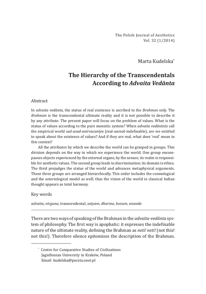 The Polish Journal of Aesthetics Vol. 32 (1/2014) Marta Kudelska* The Hierarchy of the Transcendentals According to Advaita Vedānta Abstract In advaita vedānta, the status of real existence is ascribed to the Brahman only. The Brahman is the transcendental ultimate reality and it is not possible to describe it by any attribute. The present paper will focus on the problem of values. What is the status of values according to the pure monistic system? When advaita vedāntists call the empirical world sad-asad-anirvacanīya (real-unreal-indefinable), are we entitled to speak about the existence of values? And if they are real, what does ‘real’ mean in this context? All the attributes by which we describe the world can be grasped in groups. This division depends on the way in which we experience the world. One group encompasses objects experienced by the external organs, by the senses; its realm is responsible for aesthetic values. The second group leads to discrimination; its domain is ethics. The third prejudges the status of the world and advances metaphysical arguments. These three groups are arranged hierarchically. This order includes the cosmological and the soteriological model as well; thus the vision of the world in classical Indian thought appears as total harmony. Key words advaita, nirguna, transcendental, satyam, dharma, bonum, ananda There are two ways of speaking of the Brahman in the advaita-vedānta system of philosophy. The first way is apophatic: it expresses the indefinable nature of the ultimate reality, defining the Brahman as neti! neti! (not this! not this!). Therefore silence epitomises the description of the Brahman. * Centre for Comparative Studies of Civilisations Jagiellonian University in Kraków, Poland Email: [email protected] 82 Marta Kudelska The second way attempts to ascribe to the Brahman the ultimate and the primordial attributes, or guṇa. Traditionally, advaitists speak about three primordial attitudes: sat, which denotes the real and truth; cit, which denotes the domain of consciousness and pure thought; ānanada, whichever denotes beauty and bliss. Together, these three gunas give the classical definition of saguṇa brahman as saccidānanda. My interest is focussed on the relation between the gunas. If we say that the ultimate reality, for advaita-vedānta, encompasses the whole world, including the phenomenal level, and if we also say that in this system reality is a total unity, can we find a hierarchy in the various levels, spheres or domains? And if there is a hierarchy, how is it oriented? Before beginning my analysis of the primordial gunas I would like to point out one thing. Advaita-vedānta is a system of philosophy; accordingly, it can be interpreted from the Western methodological point of view. But it is primarily an Indian system of philosophy, or darśana; this means that ultimately all considerations are soteriologically oriented and must be related to a transcendental goal. That goal is called mokṣa, or liberation. In that sense we can judge any phenomena in the world and any activity in terms of its bringing us as near as possible to mokṣa. I would like to show that because of the process of reaching mokṣa we can speak about a hierarchy of the gunas. This will be the main subject of my present considerations. But I would like to look at these gunas from the Western point of view as well. Although all literal comparisons between different cultures are weak by nature, sometimes they help not only to translate but also to understand the main thesis in both contrasting cultures. Accordingly, the three primordial Vedantic gunas will be referred to the three cardinal transcendentals which exist in European philosophy. The cardinal transcendentals have been present since the time of Plato, for whom the idea of the Good is at the top. However, for scholastic thinkers, Truth is at the top. The scholastic scheme is closer to the Vedantic; therefore I will start by analysing the three gunas in that order. If we wish to find the main difference between the European and the Indian ways of philosophising, we have to form a basic scheme or ground structure. As the ancestor of European philosophy, the Greek way of thinking, is founded on a logical scheme, so the Indian systems are founded on a philological one. Therefore it is quite natural that in India philological analysis is included in the mainstream of philosophical considerations. I will start from an analysis of the basic words denoting the term ʻtruth.’ In Sanskrit there is a group of terms which denote ‘truth’ or ‘truth- The Hierarchy of the Transcendentals... 83 ful.’ The main term is sat, which comes from the root as, to be or to exist. The word sat has several derivatives: satyam, sattvam, sattā. The word sat belongs to the metaphysical domain, where it denotes truthful, real existence, and to the epistemological domain, where it denotes the way we speak of existence when we want to state its reality, truthfulness or vicariousness. Thus, what exists is truthful as well; the ultimate truth, sat, can be ascribed only to full real existence. One of the main derivatives of the word sat is the word satyam, which extends its semantic field. Apart from the classical senses ‒ namely, truth, real within its field ‒ it includes senses with axiological connotations: honest, pure, virtuous, righteous, chaste. This combination in one domain of two aspects of reality, aspects which appeal to the realms of both truthfulness and righteousness, reminds us of the ancient Greek notion of kalokagathos. The word sattva, apart from its classical meanings, also denotes real nature, character, consciousness, and wisdom. In classical Sanskrit the most frequent use of this term belongs to the sāṃkhya system of philosophy and names one of the three gunas, which are compounds of matter, or prakṛti. From the point of view of yogic procedure, the guna sattva is responsible for the 