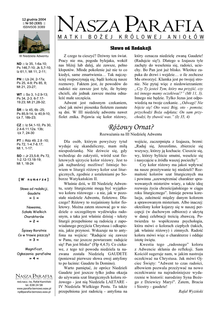 12 grudnia 2004 :: Nr 50 (330) :: ISSNI506 3089 Słowo od Redakcji III Niedziela Adwentu ND :: Iz 35, 1-6a.10; Ps 146,7-10; Jk 5,7-10; Iz 61,1; Mt 11, 2-11; PN :: Lb 24, 2-17a; Ps 25, 4-9; Ps 85, 8; Mt 21, 23-27; WT :: So 3, 1-2.9-13; Ps 34, 2-3. 6-7.1719.23; Mt 21,28-32; ŚR :: Iz 45, 6b -25; Ps 85,9-14; Iz 40,9-10; Łk 7, 18b-23; CZ :: Iz 54,1-10, Ps 30, 2.4-6.11.12a. 13b; Łk 7, 24-30 PT :: Rdz 49, 2.8 -10; Ps 72, 1-4.7-8.17; Mt 1, 1-17; SO :: Jr 23,5-8; Ps 72, 1-2.12-13.18-19; Mt 1, 18-24 [W numerze] Słowo od redakcji, Gaudete » 1 « Nowenna, Szkoła Wielkich Charakterów » 2 « Śpiewy Roratnie Co w trawie piszczy? » 3 « Magnificat, Ogłoszenia parafialne » 4 « red.nacz.: ks. Rafał Kamiński tel. 638 24 58 www.parafia-bemowo.waw.pl [email protected] Z czego tu cieszyć? Dziwny ten świat. Pracy nie ma, pogoda bylejaka, wokół nas bliżej lub dalej, ale zawsze, pełno kłopotów. Młode pokolenie już nie to co kiedyś, same zmartwienia… Tak najczęściej rozpoczynają się, bądź kończą nasze rozmowy. Faktem jest, że powodów do radości nie zawsze jest tyle, ile byśmy chcieli, ale jednak zawsze można odnaleźć małe szczęścia. Adwent jest radosnym czekaniem, choć jak mówi piosenka fioletem zasnute są dni. W III niedzielę adwentu nawet fiolet znika. Pojawia się kolor różowy, który oznacza niedzielę zwaną Gaudete! (Radujcie się!). Dlatego u Izajasza tyle zachęty do weselenia się, radości, uciechy. Bo Pan jest już blisko. Wkrótce zapuka do drzwi i wejdzie… o ile zechcesz Mu otworzyć. Klamka jest po twojej stronie. Nie pytaj więc z niedowierzaniem: „Czy Ty jesteś Tym, który ma przyjść, czy też innego mamy oczekiwać?” (Mt 11, 3). Innego nie będzie. Tylko Jezus jest odpowiedzią na twoje czekanie. „Odwagi! Nie bójcie się! Oto wasz Bóg, oto - pomsta; przychodzi Boża odpłata; On sam przychodzi, by zbawić was.” (Iz 35, 4) Różowy Ornat? Rozważania na III Niedzielę Adwentu Dla osób, którym powyższy tytuł wydaje się skandaliczny, mam miłą niespodziankę. Nie dziwcie się, gdy wchodząc do zakrystii, wśród szat fioletowych ujrzycie kolor różowy. Jest to jak najbardziej możliwe! Istnieje bowiem w liturgii różowy kolor szat liturgicznych, zgodnie z ustaleniami po Soborze Watykańskim II. Właśnie dziś, w III Niedzielę Adwentu, szaty liturgicznie mogą być wyjątkowo koloru różowego - a nie, jak w pozostałe niedziele Adwentu, fioletowe. Dlaczego? Różowy to rozjaśniony kolor fioletowy. Można zatem stosować go w niedziele o szczególnym wydźwięku radosnym, a taka jest właśnie dzisiaj - teksty liturgii przepełnione są radością z zapowiadanego przyjścia Chrystusa i odkupienia, jakie przynosi. Wskazuje na to antyfona na wejście: "Radujcie się zawsze w Panu, raz jeszcze powtarzam: radujcie się! Pan jest blisko" (Flp 4,4.5). Co ciekawe, z tego też powodu niedziela ta nazwana została Niedzielą GAUDETE (ponieważ pierwsze słowa owej antyfony to po łacinie: Gaudete In Domino). Warto pamiętać, że oprócz Niedzieli Gaudete jest jeszcze tylko jedna okazja do używania szat liturgicznych koloru różowego - jest nią Niedziela LAETARE IV Niedziela Wielkiego Postu. Ta także przepełniona jest radością - antyfona na wejście, zaczerpnięta z Izajasza, brzmi: „Raduj się, Jerozolimo, zbierzcie się wszyscy, którzy ją kochacie. Cieszcie się, wy, którzy byliście smutni, weselcie się i nasycajcie u źródła waszej pociechy”. Czy kolor różowy ma jakoś wpływać na nasze przeżywanie tej niedzieli? Rozmaitość kolorów szat liturgicznych ma i powinna „uzewnętrzniać charakter sprawowanych misteriów wiary, a także ideę rozwoju życia chrześcijańskiego w ciągu roku liturgicznego”. Istnieje pewna korelacja, zależność między danym kolorem a sprawowanym misterium. Albo inaczej: określony kolor kojarzy się w naszej percepcji (w duchowym odbiorze) z ukrytą w danej celebracji treścią zbawczą. Potwierdza to współczesna psychologia, która mówi o kolorach ciepłych (takich, jak właśnie różowy) i zimnych. Radość koloru mówi więc o charakterze i oddaje istotę święta. Kwestia tego „radosnego” koloru z Adwencie skłania do refleksji. Sam Kościół sugeruje nam, w jakim nastroju oczekiwać na Chrystusa. Jak mówi Ojciec Święty: "Adwent to czas radości, albowiem pozwala przeżywać na nowo oczekiwanie na najradośniejsze wydarzenie w historii: narodziny Syna Bożego z Dziewicy Maryi". Zatem, Bracia i Siostry - gaudete! Rafał Wyziński 2 N A S Z A P A R A F I A Nowenna Do Dzieciątka Jezus Już niedługo (dokładnie 16. grudnia) po raz kolejny rozpoczniemy Nowennę do Dzieciątka Jezus. Warto więc poświęcić tej szczególnej modlitwie trochę uwagi. Kult Bożego Dzieciątka jest obecny w życiu Kościoła już od czasów najdawniejszych (pokłon trzech mędrców). Szczególnie dużo refleksji na ten temat pojawia się u św. Ireneusza, św. Ambrożego, św. Hieronima, św. Augustyna czy św. Jana Chryzostoma. Nieco później do jego rozpowszechniania przyczyni się św. Teresa Wielka, św. Jan od Krzyża i św. Ignacy Loyola. Poszukując śladów tego kultu na ziemiach polskich, dostrzec można dużą rolę zakonów cystersów, franciszkanów, a współcześnie właśnie zgromadzenia św. Michała Archanioła. Czcigodny sługa Boży ks. Bronisław Markiewicz „przywiózł” tę Nowennę aż z Włoch, od św. Jana Bosko. Co roku w zakładach wychowawczych, szkołach i oratoriach, tworzonych przez założyciela zakonu michalitów dzień 16. grudnia - dzień rozpoczęcia tej modlitwy - stawał się wielkim i radosnym wydarzeniem. Pomagało to w przeżyciu ostatnich dni Adwentu, ostatnich dni oczekiwania w szczególnej atmosferze. Co ciekawe, tekst nowenny został przetłumaczony na język polski dopiero pod koniec lat 60-tych. Wcześniej śpiewana była po łacinie. Dla jej historii ważny jest rok 1991, w którym ukazało się nowe wydanie przygotowane przez trze