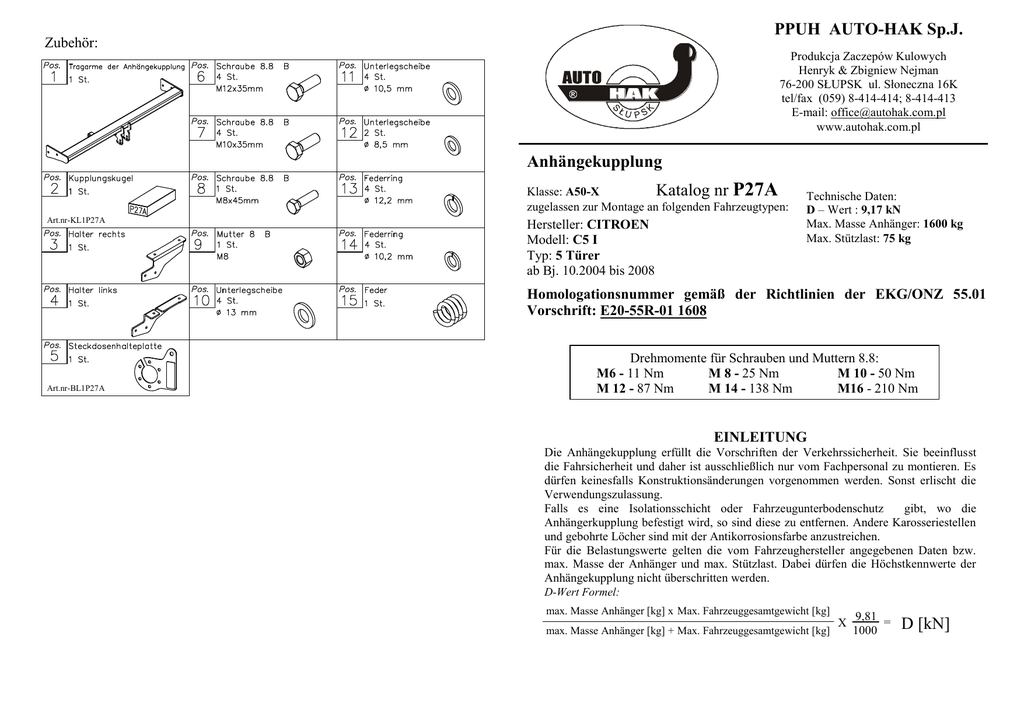 PPUH AUTO-HAK Sp.J. Zubehör: Produkcja Zaczepów Kulowych Henryk & Zbigniew Nejman 76-200 SŁUPSK ul. Słoneczna 16K tel/fax (059) 8-414-414; 8-414-413 E-mail: [email protected] www.autohak.com.pl Anhängekupplung P27A Klasse: A50-X Katalog nr zugelassen zur Montage an folgenden Fahrzeugtypen: Art.nr-KL1P27A Hersteller: CITROEN Modell: C5 I Typ: 5 Türer ab Bj. 10.2004 bis 2008 Technische Daten: D – Wert : 9,17 kN Max. Masse Anhänger: 1600 kg Max. Stützlast: 75 kg Homologationsnummer gemäß der Richtlinien der EKG/ONZ 55.01 Vorschrift: E20-55R-01 1608 Art.nr-BL1P27A Drehmomente für Schrauben und Muttern 8.8: M6 - 11 Nm M 8 - 25 Nm M 10 - 50 Nm M 12 - 87 Nm M 14 - 138 Nm M16 - 210 Nm EINLEITUNG Die Anhängekupplung erfüllt die Vorschriften der Verkehrssicherheit. Sie beeinflusst die Fahrsicherheit und daher ist ausschließlich nur vom Fachpersonal zu montieren. Es dürfen keinesfalls Konstruktionsänderungen vorgenommen werden. Sonst erlischt die Verwendungszulassung. Falls es eine Isolationsschicht oder Fahrzeugunterbodenschutz gibt, wo die Anhängerkupplung befestigt wird, so sind diese zu entfernen. Andere Karosseriestellen und gebohrte Löcher sind mit der Antikorrosionsfarbe anzustreichen. Für die Belastungswerte gelten die vom Fahrzeughersteller angegebenen Daten bzw. max. Masse der Anhänger und max. Stützlast. Dabei dürfen die Höchstkennwerte der Anhängekupplung nicht überschritten werden. D-Wert Formel: max. Masse Anhänger [kg] x Max. Fahrzeuggesamtgewicht [kg] max. Masse Anhänger [kg] + Max. Fahrzeuggesamtgewicht [kg] X 9,81 = 1000 D [kN] MONTAGE - und BETRIEBSANLEITUNG DER ANHÄNGEKUPPLUNG 4 6 7 6 4. Die Tragarme der Anhängerkupplung (Pos.1) zwischen die Seitenhalter einschieben und mit den Schrauben M12x35mm (Pos.6) verschrauben. 5. Alle Schrauben gemäß den Angaben in der Tabelle festziehen. 6. Die Stoßstange montieren. Vorher einen Teile gemäß der Zeichnung ausschneiden. 7. Die Kupplungskugel gemäß der Anbauanleitung der Anhängekupplung mit dem schnelldemontierbaren Aufsatz anbringen. 8. Den Steckdosenhalter (Pos.5) gemäß der Zeichnung 1 verschrauben. 9. Die Elektroinstallation gemäß der Anschlussanleitung des Herstellers anschließen. 10. Falls nötig, den beschädigten Farbanstrich ausbessern. 1 ACHTUNG 12 8 7 5 3 9 6 15 12 Nach dem Anbau der Anhängekupplung sind die nationalen Vorschriften zur Anbauabnahme und zur Änderung der Fahrzeugpapiere zu beachten. Das Fahrzeug sollte mit seitlichen Blinkern und Rückspiegeln, deren Abstand mindestens der Anhängerbreite entspricht, ausgestattet werden. Alle Befestigungsschrauben sind nach ca. 1 000 km Anhängerbetrieb zu prüfen und nachzuziehen. Die Kugel der Anhängekupplung ist sauber zu halten und zu fetten. die Verkleidung 2 6 Die Anhängekupplung (Katalognummer P27A) ist für folgende Fahrzeugtypen zugelassen: CITROEN C5 I 5 Türer, ab Bj. 10.2004 bis 2008, dient zum ziehen der Anhänger mit der Gesamtlast von 1600 kg und der Kugelstützlast von max.75 kg. VON DEM HERSTELLER Die Zuverlässigkeit der Anhängekupplung ist jedoch auch von der ordnungsgemäßen Montage und der richtigen Nutzung abhängig. Daher werden Sie gebeten, sorgfältig die folgende Montageanleitung zu lesen und sich an die entsprechenden Anweisungen zu beachten. Zeichnung 2. Die Ausschnitte der Verkleidung Die Anhängekupplung muss an den vom Fahrzeughersteller vorgeschriebenen Befestigungsstellen montiert werden. Anbauanleitung 1. Die Stoßstange und die Kunststoffverkleidung demontieren. 2. Die Seitenhalter der Anhängerkupplung (Pos. 3 u. 4) an den originalen vorgesehenen Stellen mit den Schrauben M10x35mm (Pos.7) verschrauben. 3. Die Kunststoffverkleidung anbringen. Vorher einen Teile gemäß der Zeichnung ausschneiden. 80 Zeichnung 3. Die Ausschnitte im unteren Teil der Stoßstange (D) (CZ) (F) (GB) (PL) (SK) Der Freiraum nach Anhang VII, Abbildung 30 der Richtlinie 94/20/EG ist zu gewährleisten. Volný prostor ve smyslu Přílohy VII,obr. 30 Směrnice č. 94/20/EG musí být zaručen. L´espace libre doit être garanti conformément à ľannexe VII, illustracion 30 de la directive 94/20/ CE. The clearance specified in apendix VII, diagram 30 of guideline 94/20/EC must be guaranteed. Zagwarantować swobodną przestrzeń zgodnie z załącznikiem VII, rysunek 30 dyrektywy 94/20/CE. Volný priestor v zmysle Prílohy VII, obr. 30 Smernice 94/20/EC musí byť zaručená. (D) (CZ) (F) (GB) (PL) (SK) * bei zulässigem Gesamtgewicht des Fahrzeuges * při celkové přípustné hmotnosti vozidla * pour poids total en charge autorizé du véhicule * at gross vehicle weight rating * przy dopuszczalnym ciężarze całkowitym pojazdu * pri celkovej prípustnej hmotnosti vozidla 3. Assemble cover plate, before install cut out his fragments according to figure 2. 4. Put main bar of the towbar pos. 1 between fixed side brackets and twist on bolts M12x35mm (pos. 6). 5. Tighten all bolts according to the torque shown in the table. 6. Assemble the bumper, before assemble cut out his fragments according to figure 3. 7. Fix the socket plate (pos. 18) as shown on the drawing. 8. Fix body of the automat (pos. 19) using bolts M12x25mm (pos. 5) from accessories. Place tow-ball (pos. 2) according to supplied instruction. 9. Connect electric wires of 7-poles socket according to the instruction of the car. (Recommend to make at authorized service station) 10. Complete paint layer damaged during installation. FITTING INSTRUCTION 4 6 7 8 13 Clamp mark in acc. with ISO PN 1 L 2 + 3 31 4 R 5 58R 6 54 7 58L Cables joining Left directional lights Rear fog lights Ground Right directional lights Right side parking lights Stoplights Left side parking lights 16 13 18 3 10 17 19 Rys. 1 6 1 2 cover plate 7 5 7 This towbar is designed to assembly in following car: CITROEN C5 I 5 doors, produced since 10.2004 till 2008, catalogue no. P27A and is prepared to tow trailers max total weight 1600 kg and max vertical load 75 kg. From manufacturer Thank you for buying 