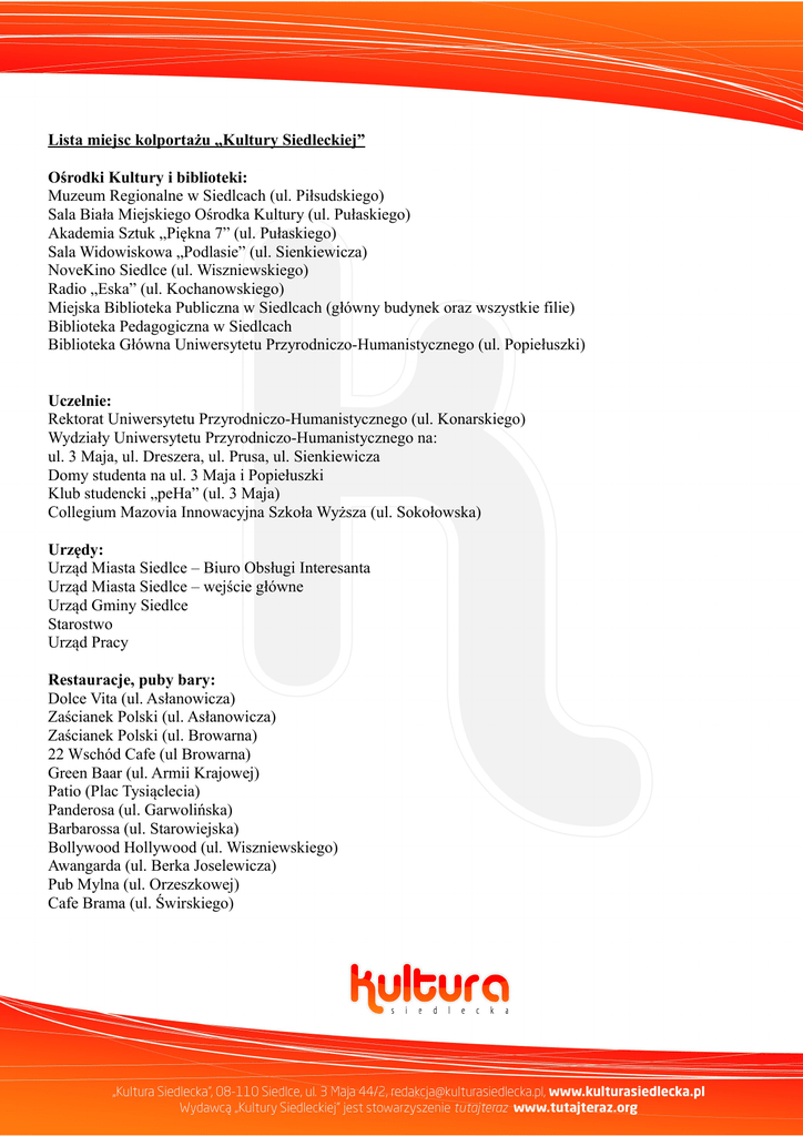 Lista miejsc kolportażu „Kultury Siedleckiej” Ośrodki Kultury i biblioteki: Muzeum Regionalne w Siedlcach (ul. Piłsudskiego) Sala Biała Miejskiego Ośrodka Kultury (ul. Pułaskiego) Akademia Sztuk „Piękna 7” (ul. Pułaskiego) Sala Widowiskowa „Podlasie” (ul. Sienkiewicza) NoveKino Siedlce (ul. Wiszniewskiego) Radio „Eska” (ul. Kochanowskiego) Miejska Biblioteka Publiczna w Siedlcach (główny budynek oraz wszystkie filie) Biblioteka Pedagogiczna w Siedlcach Biblioteka Główna Uniwersytetu Przyrodniczo-Humanistycznego (ul. Popiełuszki) Uczelnie: Rektorat Uniwersytetu Przyrodniczo-Humanistycznego (ul. Konarskiego) Wydziały Uniwersytetu Przyrodniczo-Humanistycznego na: ul. 3 Maja, ul. Dreszera, ul. Prusa, ul. Sienkiewicza Domy studenta na ul. 3 Maja i Popiełuszki Klub studencki „peHa” (ul. 3 Maja) Collegium Mazovia Innowacyjna Szkoła Wyższa (ul. Sokołowska) Urzędy: Urząd Miasta Siedlce – Biuro Obsługi Interesanta Urząd Miasta Siedlce – wejście główne Urząd Gminy Siedlce Starostwo Urząd Pracy Restauracje, puby bary: Dolce Vita (ul. Asłanowicza) Zaścianek Polski (ul. Asłanowicza) Zaścianek Polski (ul. Browarna) 22 Wschód Cafe (ul Browarna) Green Baar (ul. Armii Krajowej) Patio (Plac Tysiąclecia) Panderosa (ul. Garwolińska) Barbarossa (ul. Starowiejska) Bollywood Hollywood (ul. Wiszniewskiego) Awangarda (ul. Berka Joselewicza) Pub Mylna (ul. Orzeszkowej) Cafe Brama (ul. Świrskiego) Piwiarnia Warka (ul. Pułaskiego) Wersal Siedlecki (ul. Łukowska) Pracownia Rannych Pantofli (ul. 3 Maja) Klonowa Day SPA (ul. Klonowa) Cukiernia z Klonowej (ul. Orzeszkowej) Cukiernia z Klonowej (ul. Piłsudskiego) Sphinx (ul. Rynkowa) Dwór w Mościbrodach Firmy: Arche (ul. Brzeska) Foto-Jack (ul. Sienkiewicza) Andrea (ul. Brzeska) Chodrom (ul. Młynarska) Usługi introligatorsko-poligraficzne (Pieńkowski, ul. Wojska Polskiego) U Alexa (ul. Czerwonego Krzyża) Sklep dla plastyków (ul. Pułaskiego) Bemol (Plac Tysiąclecia) Mostostal (ul. Terespolska) Eurolingua (ul. Partyzantów) Sala Zabaw Młynek (ul. Sokołowska) Galeria Sztuki Współczesnej „Widzimisie” (ul. 3 Maja) Ko-Ku (ul. Pułaskiego) Street Bar (ul. 3 Maja) Profi Lingua (ul. Kochanowskiego) Przychodnia Salus (ul. Kilińskiego) Księgarnia „Vademecum” (ul. Pułaskiego) Księgarnia Współczesna (ul. Katedralna) Księgarnia „Świt” (ul. Piłsudskiego)