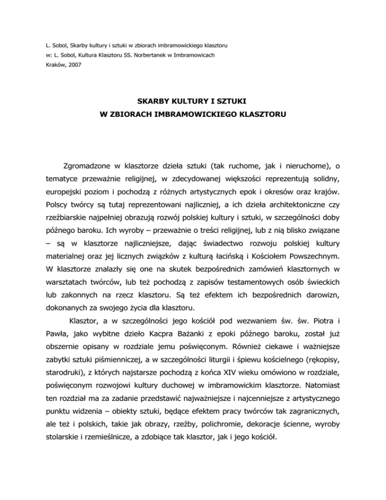L. Sobol, Skarby kultury i sztuki w zbiorach imbramowickiego klasztoru w: L. Sobol, Kultura Klasztoru SS. Norbertanek w Imbramowicach Kraków, 2007 SKARBY KULTURY I SZTUKI W ZBIORACH IMBRAMOWICKIEGO KLASZTORU Zgromadzone w klasztorze dzieła sztuki (tak ruchome, jak i nieruchome), o tematyce przeważnie religijnej, w zdecydowanej większości reprezentują solidny, europejski poziom i pochodzą z różnych artystycznych epok i okresów oraz krajów. Polscy twórcy są tutaj reprezentowani najliczniej, a ich dzieła architektoniczne czy rzeźbiarskie najpełniej obrazują rozwój polskiej kultury i sztuki, w szczególności doby późnego baroku. Ich wyroby – przeważnie o treści religijnej, lub z nią blisko związane – są w klasztorze najliczniejsze, dając świadectwo rozwoju polskiej kultury materialnej oraz jej licznych związków z kulturą łacińską i Kościołem Powszechnym. W klasztorze znalazły się one na skutek bezpośrednich zamówień klasztornych w warsztatach twórców, lub też pochodzą z zapisów testamentowych osób świeckich lub zakonnych na rzecz klasztoru. Są też efektem ich bezpośrednich darowizn, dokonanych za swojego życia dla klasztoru. Klasztor, a w szczególności jego kościół pod wezwaniem św. św. Piotra i Pawła, jako wybitne dzieło Kacpra Bażanki z epoki późnego baroku, został już obszernie opisany w rozdziale jemu poświęconym. Również ciekawe i ważniejsze zabytki sztuki piśmienniczej, a w szczególności liturgii i śpiewu kościelnego (rękopisy, starodruki), z których najstarsze pochodzą z końca XIV wieku omówiono w rozdziale, poświęconym rozwojowi kultury duchowej w imbramowickim klasztorze. Natomiast ten rozdział ma za zadanie przedstawić najważniejsze i najcenniejsze z artystycznego punktu widzenia – obiekty sztuki, będące efektem pracy twórców tak zagranicznych, ale też i polskich, takie jak obrazy, rzeźby, polichromie, dekoracje ścienne, wyroby stolarskie i rzemieślnicze, a zdobiące tak klasztor, jak i jego kościół. 1. Malarstwo religijne (obrazy). a) Do najcenniejszych obrazów, ze zbiorów Sióstr Norbertanek w Imbramowicach i przechowywanym w skarbcu tutejszego klasztoru, należy niewątpliwie malowany na blasze miedzianej obraz olejny, przedstawiający Matki Bożą z dzieciątkiem w girlandzie, autorstwa Jana Breughel’a Starszego (1568 – 1625), zwanego Aksamitnym. Ma on wymiary 90 x 121 cm., oprawiony jest w barokową ramę, której narożniki są ścięte pod kątem 45 o. Matka Boża przedstawiona jest w lekkim, prawym półprofilu i łagodnie spogląda na patrzącego. Na lewej ręce trzyma dzieciątko, zaś w prawej ręce, na wysokości kolan Jezusa, trzyma winne grono, zaś Jezus w swej prawej ręce trzyma egzotyczny kwiat (jak podaje badacz obrazu – B. Krasnowolski) – passiflory. Uwagę widza przyciąga pięknie uformowana przez Breughel’a fryzura Matki Bożej, z lekko rozpuszczonymi, kasztanowymi włosami, spływającymi na jej ramiona. Suknia Maryi z dekoltem, ma kolor czerwony. Dekolt jej przykryty jest jasnożółtym szalem, który – przerzucony przez plecy – okrywa również fragment ciała dzieciątka Jezus, spływając łagodnymi i miękkimi fałdami na częściowo przysłonięte przez girlandę kolana Matki Bożej. Ta dwufiguralna kompozycja, uformowana jest na brązowym tle obrazu, z półkolistymi rozjaśnieniami wokół głów Matki i jej Syna. Otaczająca wizerunki Madonny i Dzieciątka girlanda tworzy wokół nich owal, spleciony z różnorodnych kwiatów: polnych, tulipanów, irysów, róż oraz lilii. Wieniec ten dopełniają muszle oraz owady, jak biedronka, motyl czy gąsienica, a także perły. Cztery aniołki umieszczone w narożach girlandy matce Bożej z dzieciątkiem jakby w tej pozie asystują. Obraz ten zawiera w sobie wiele treści chrystologicznych i mariologicznych, wzajemnie ze sobą powiązanych. Girlanda jest symbolem różańca, kiść winogron i kwiat passiflory symbolizują odkupieńczą rolę męki i śmierci Chrystusa. Artysta podpisał swój obraz na jednej z muszli (murex) znajdującej się bliżej prawej, dolnej strony obrazu. Przypuszcza się, iż ofiarodawcą obrazu, był w pierwszej ćwierci XVIII wieku kanonik krakowski ks. D. Lochman (ryc. nr 44). W prezbiterium kościoła klasztornego, w bocznym jego ołtarzu, b) zlokalizowanym po lewej stronie, znajduje się obraz olejny, namalowany na płótnie Madonny z Dzieciątkiem, nieznanego autora, pochodzący z Bolonii i datowany na pierwszą połowę XVII wieku. Ma on wymiary 45,5 x 58 cm. I jest umieszczony w ołtarzu, jako centralny jego akcent. Na tym obrazie Madonna przedstawiona jest w pozycji siedzącej na wprost patrzącego, z lekko pochyloną i przekrzywioną głową w lewo, spoglądając z zadumą na śpiące na jej kolanach dzieciątko. Lewą swoją dłonią podtrzymuje swoją głowę, która przykryta jest złotawą chustą, zaś prawą lekko dotyka prawej rączki dzieciątka. Jej czerwona suknia okryta jest ciemnoniebieskim płaszczem, zaś dekolt przysłonięty jest jasną chustą. Zarówno karnacja skóry Maryi, jak i ciało dzieciątka są bladoróżowe, z lekkim rumieńcem na obu twarzach. Umieszczone w górnych partiach obrazu aniołki komponują całość tej sceny, adorując dzieciątko podczas snu. Obraz ten został najprawdopodobniej podarowany kościołowi klasztornemu przez biskupa krakowskiego K. Łubieńskiego w 1719 r. z okazji jego ponownej konsekracji, po odbudowie (ryc. nr 45). c) Następnym, pochodzącym z pierwszej połowy XVII wieku obrazem olejnym, namalowanym na płótnie, a znajdującym się w skarbcu klasztornym, jest nie sygnowany obraz pt. Emaus. Ma on wymiary 180 x 120 cm. a kompozycyjnie i kolorystycznie wzorowany jest na szkole włoskiego, siedemnastowiecznego mistrza w operowaniu światłem i światłocieniem – Caravaggia. Przedstawia on scenę, a dokładniej – rejestruje moment, w którym uczniowie Jezusa: Kleofas i Łukasz w osobie łamiące