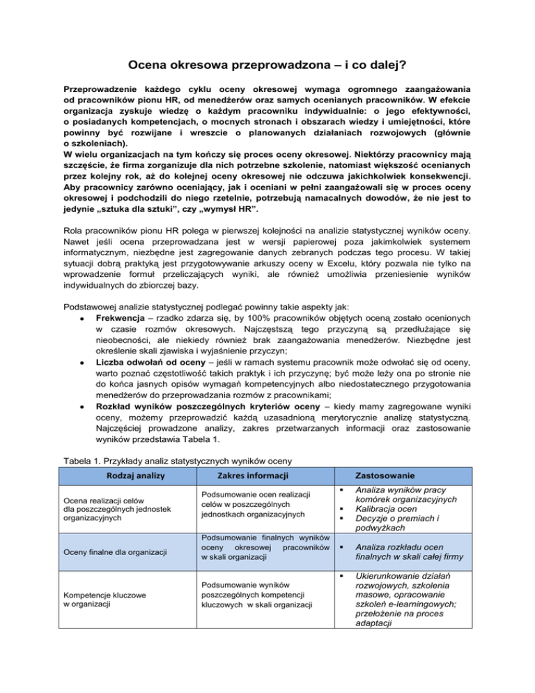 Ocena okresowa przeprowadzona – i co dalej? Przeprowadzenie każdego cyklu oceny okresowej wymaga ogromnego zaangażowania od pracowników pionu HR, od menedżerów oraz samych ocenianych pracowników. W efekcie organizacja zyskuje wiedzę o każdym pracowniku indywidualnie: o jego efektywności, o posiadanych kompetencjach, o mocnych stronach i obszarach wiedzy i umiejętności, które powinny być rozwijane i wreszcie o planowanych działaniach rozwojowych (głównie o szkoleniach). W wielu organizacjach na tym kończy się proces oceny okresowej. Niektórzy pracownicy mają szczęście, że firma zorganizuje dla nich potrzebne szkolenie, natomiast większość ocenianych przez kolejny rok, aż do kolejnej oceny okresowej nie odczuwa jakichkolwiek konsekwencji. Aby pracownicy zarówno oceniający, jak i oceniani w pełni zaangażowali się w proces oceny okresowej i podchodzili do niego rzetelnie, potrzebują namacalnych dowodów, że nie jest to jedynie „sztuka dla sztuki”, czy „wymysł HR”. Rola pracowników pionu HR polega w pierwszej kolejności na analizie statystycznej wyników oceny. Nawet jeśli ocena przeprowadzana jest w wersji papierowej poza jakimkolwiek systemem informatycznym, niezbędne jest zagregowanie danych zebranych podczas tego procesu. W takiej sytuacji dobrą praktyką jest przygotowywanie arkuszy oceny w Excelu, który pozwala nie tylko na wprowadzenie formuł przeliczających wyniki, ale również umożliwia przeniesienie wyników indywidualnych do zbiorczej bazy. Podstawowej analizie statystycznej podlegać powinny takie aspekty jak: Frekwencja – rzadko zdarza się, by 100% pracowników objętych oceną zostało ocenionych w czasie rozmów okresowych. Najczęstszą tego przyczyną są przedłużające się nieobecności, ale niekiedy również brak zaangażowania menedżerów. Niezbędne jest określenie skali zjawiska i wyjaśnienie przyczyn; Liczba odwołań od oceny – jeśli w ramach systemu pracownik może odwołać się od oceny, warto poznać częstotliwość takich praktyk i ich przyczynę; być może leży ona po stronie nie do końca jasnych opisów wymagań kompetencyjnych albo niedostatecznego przygotowania menedżerów do przeprowadzania rozmów z pracownikami; Rozkład wyników poszczególnych kryteriów oceny – kiedy mamy zagregowane wyniki oceny, możemy przeprowadzić każdą uzasadnioną merytorycznie analizę statystyczną. Najczęściej prowadzone analizy, zakres przetwarzanych informacji oraz zastosowanie wyników przedstawia Tabela 1. Tabela 1. Przykłady analiz statystycznych wyników oceny Rodzaj analizy Ocena realizacji celów dla poszczególnych jednostek organizacyjnych Oceny finalne dla organizacji Kompetencje kluczowe w organizacji Zakres informacji Podsumowanie ocen realizacji celów w poszczególnych jednostkach organizacyjnych Podsumowanie finalnych wyników oceny okresowej pracowników w skali organizacji Podsumowanie wyników poszczególnych kompetencji kluczowych w skali organizacji Zastosowanie Analiza wyników pracy komórek organizacyjnych Kalibracja ocen Decyzje o premiach i podwyżkach Analiza rozkładu ocen finalnych w skali całej firmy Ukierunkowanie działań rozwojowych, szkolenia masowe, opracowanie szkoleń e-learningowych; przełożenie na proces adaptacji Kompetencje menedżerskie w organizacji Podsumowanie wyników poszczególnych kompetencji menedżerskich w skali organizacji Kompetencje funkcyjne w organizacji Podsumowanie wyników poszczególnych kompetencji funkcyjnych w skali organizacji Kompetencje w poszczególnych jednostkach organizacyjnych Podsumowanie wyników kompetencji w poszczególnych jednostkach organizacyjnych Ocena finalna pracowników dla poszczególnych menedżerów Ocena finalna poszczególnych pracowników rok do roku Posumowanie finalnych wyników oceny okresowej pracowników u poszczególnych menedżerów dokonujących oceny Posumowanie finalnych wyników oceny okresowej poszczególnych pracowników rok do roku Projektowanie szkoleń menedżerskich Ukierunkowanie informacji zwrotnej w stronę menedżerów Rozwój wybranych umiejętności funkcyjnych Projektowanie ogólnodostępnych programów szkoleniowych nakierowanych na rozwój wybranych obszarów firmy Rozwój umiejętności w wybranych jednostkach organizacyjnych Projektowanie programów rozwojowych dla wybranych obszarów firmy Monitorowanie i ukierunkowywanie menedżerów pod kątem obiektywności podczas oceny rocznej Kalibracja ocen Monitorowanie rozwoju pracowników Decyzje o awansach i podwyżkach Na Rysunku 1 widnieje przykładowa analiza wyników – ocena kompetencji menedżerskich w skali całej firmy. Kompetencje menedżerskie w roku 2011 0% PRZYWÓDZTWO ZARZĄDZANIE PRACĄ ZESPOŁU BUDOWANIE POTENCJAŁU ZESPOŁU A 20% 40% 13% 83% 17% 87% C 80% 100% 4% 83% 9% B 60% D 4% E Jednocześnie podsumowywane powinny być planowane działania rozwojowe oraz wnioski szkoleniowe (najlepiej z uwzględnieniem priorytetów i w podziale na jednostki organizacyjne). Takie zestawienie pozwala zbadać realne potrzeby rozwojowe oraz szkoleniowe, zaplanować budżet szkoleniowy i określić kalendarz szkoleń w organizacji. Warto również przeprowadzić analizę jakościową wypełnionych arkuszy: stawiane cele – ich klarowność, jednoznaczność, umiejscowienie w czasie, adekwatność celów, możliwość pomiaru realizacji celu/zadania, sprecyzowanie oczekiwanych efektów; uzasadnienia ocen - czy menedżerowie uzasadniają oceny przykładami konkretnych sytuacji/zachowań z minionego roku; planowane działania rozwojowe – w jaki sposób menedżerowie planują swoje zaangażowanie w rozwój podwładnych w codziennej pracy. Na podstawie tej analizy należy opracowywać rekomendacje działań komunikacyjnych/szkoleniowych skierowanych do kadry menedżerskiej. Analiza statystyczna rozkładu wyników, ich odchylenia od rozkładu normalnego, powinna prowadzić również do sformułowania wniosków, czy w firmie należy przep